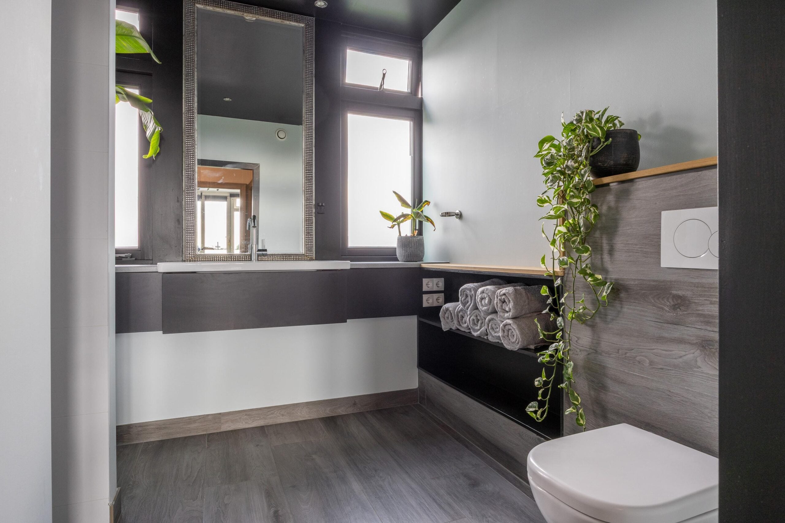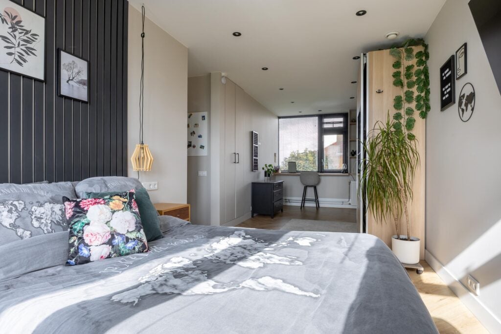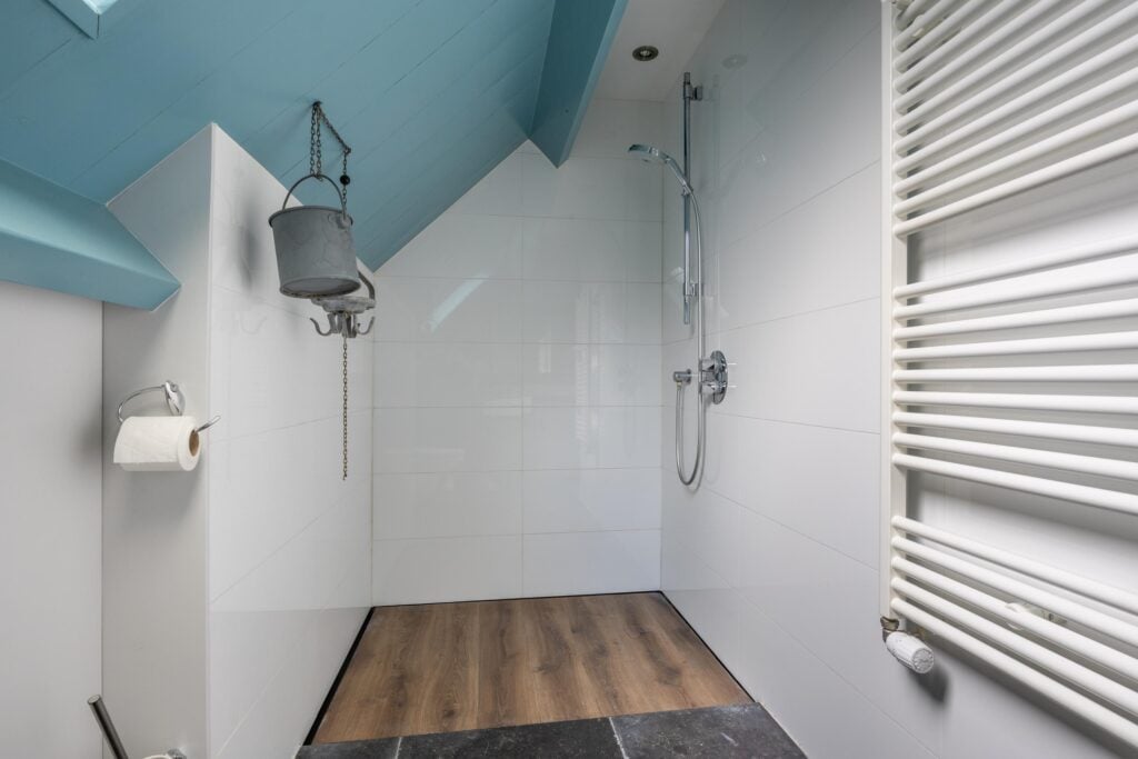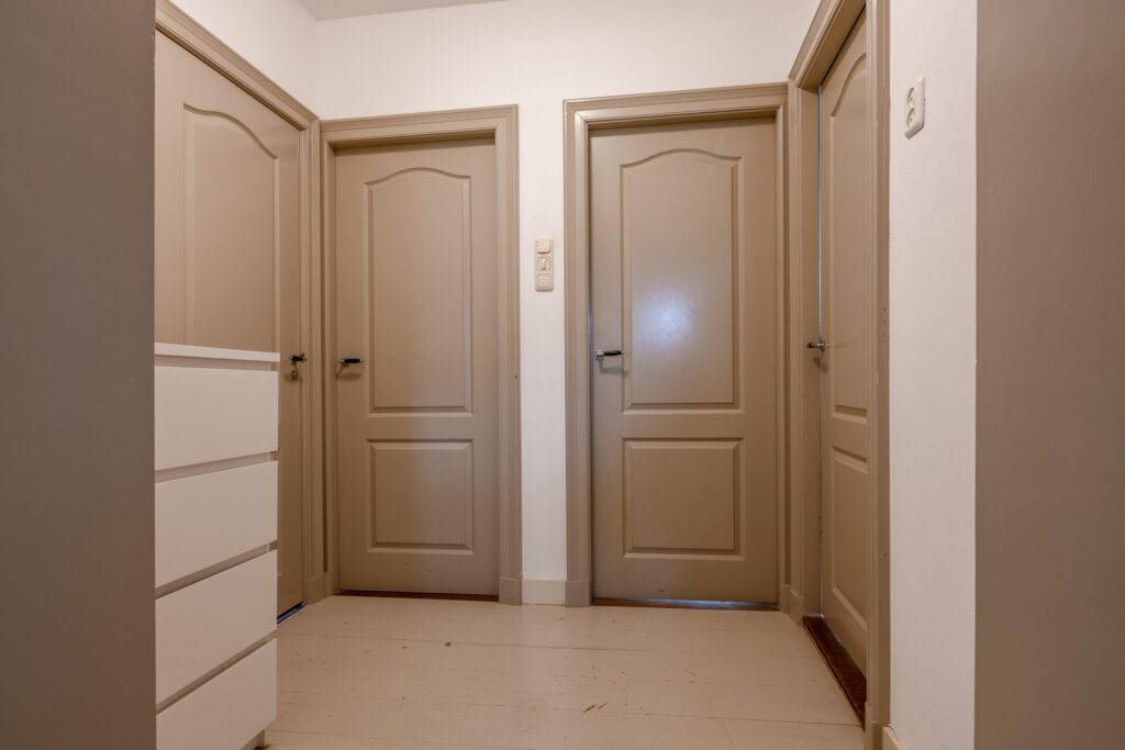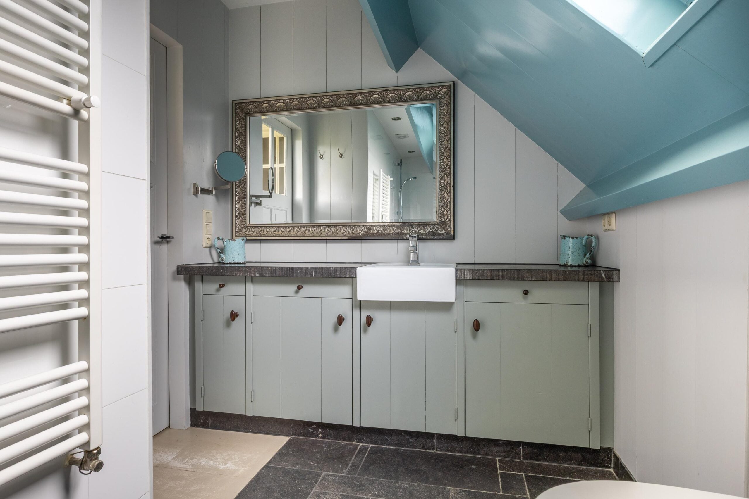 Op de verdieping zijn er maar liefst vier ruime slaapkamers, perfect voor een groot gezin. Door het splitsen van de grootste kamer zijn vijf slaapkamers mogelijk. De afwerking is hier net zo verzorgd als beneden. De verdieping beschikt bovendien over twee badkamers: één is in 2020 volledig vernieuwd en voorzien van een moderne douche, toilet en wastafel. De andere badkamer heeft eveneens een douche en wastafel. Tot slot is er een balkon aan de achterzijde, waar je uitkijkt over de uitgestrekte weilanden – elke ochtend en avond een groen panorama. Extra bergruimte vind je op de vliering, ideaal voor seizoensspullen.