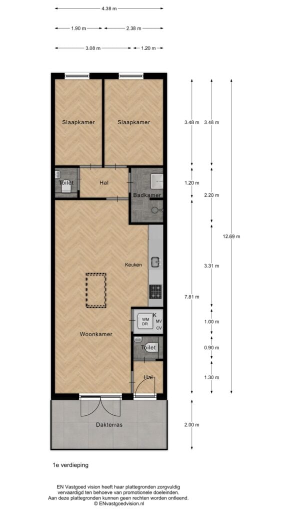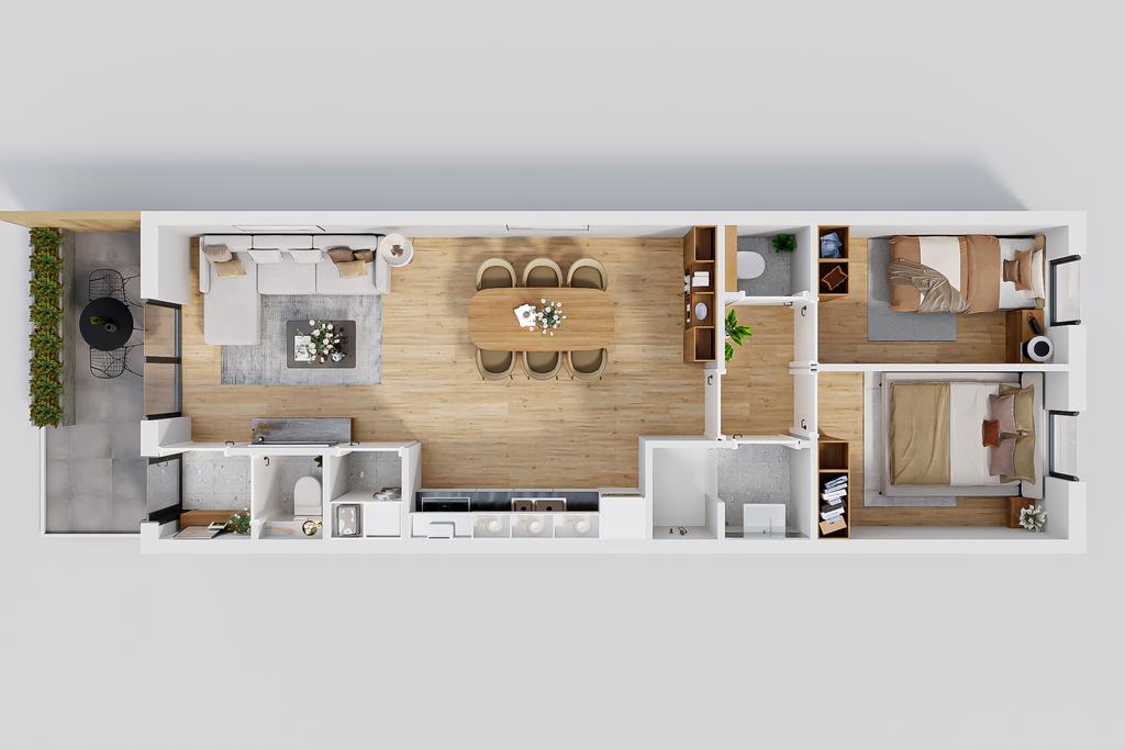 Vanaf de entree heb je toegang tot de woonkamer en een apart toilet. De ruime woonkamer, met een open keuken, biedt alle gemakken zoals een inductiekookplaat, vaatwasser, koel-/vriescombinatie en combi-oven/magnetron. Via de woonkamer bereik je beide slaapkamers, een extra apart toilet en de badkamer. Bovendien is er aan de voorzijde van het appartement een dakterras.