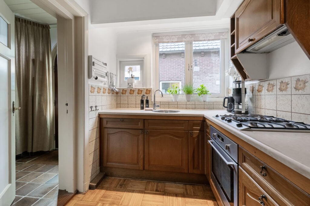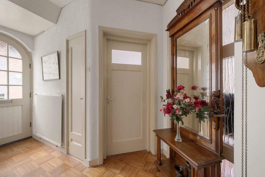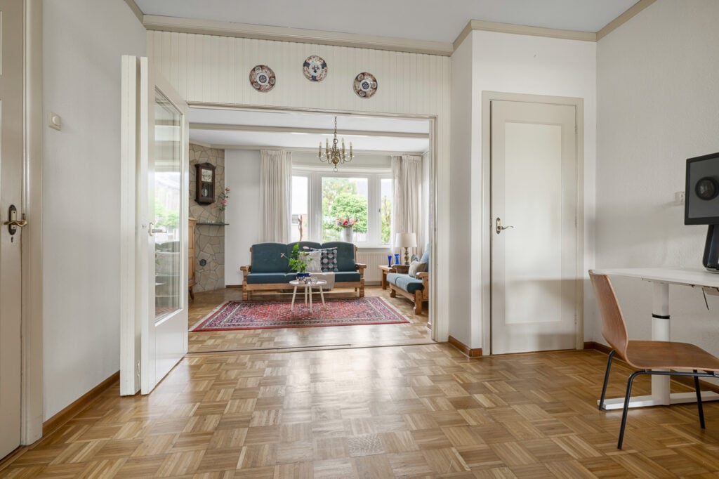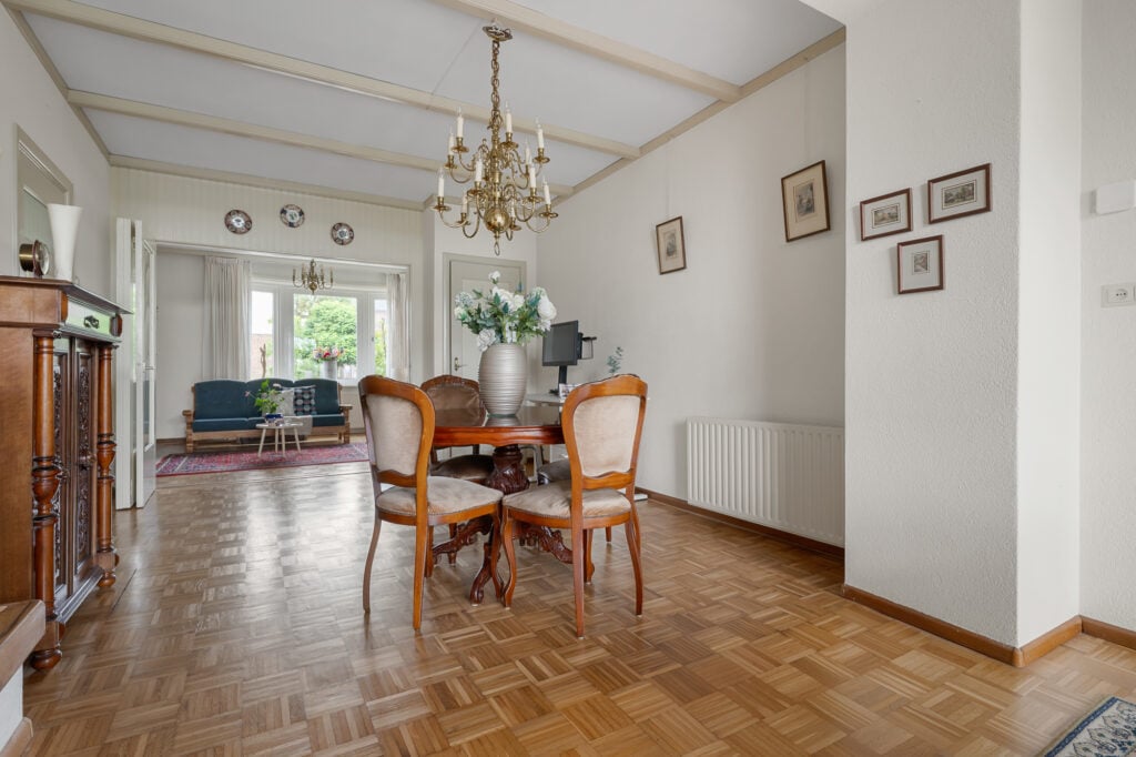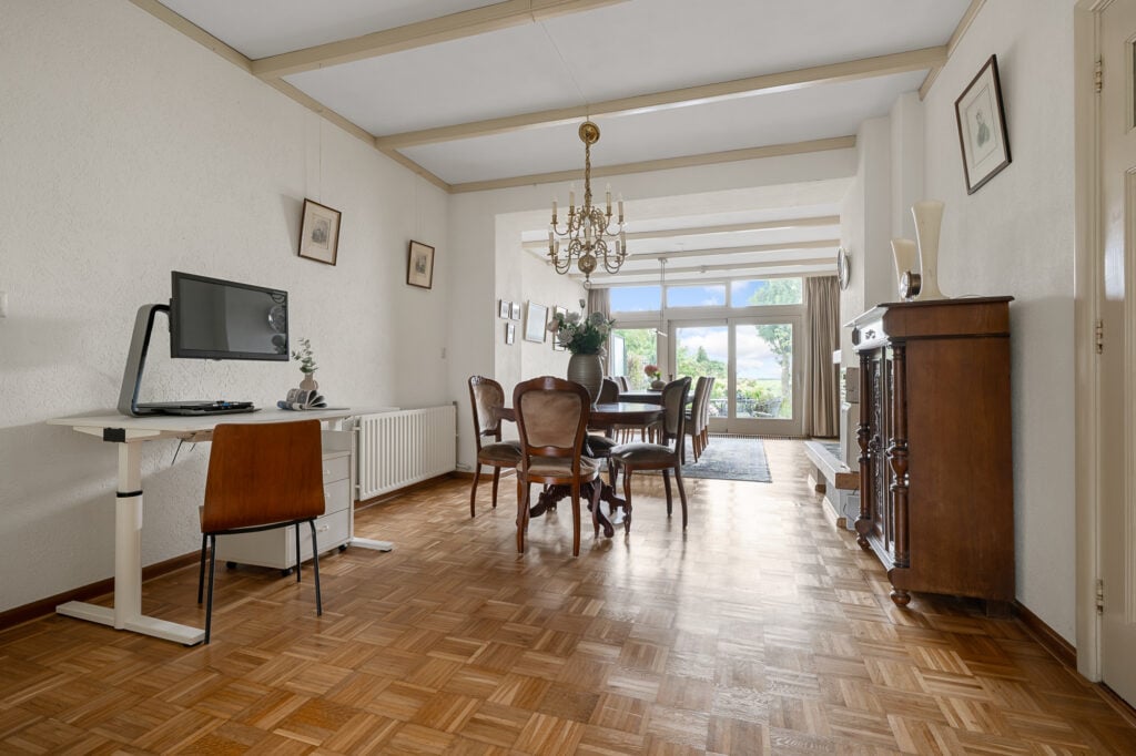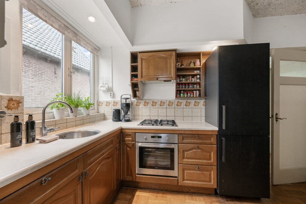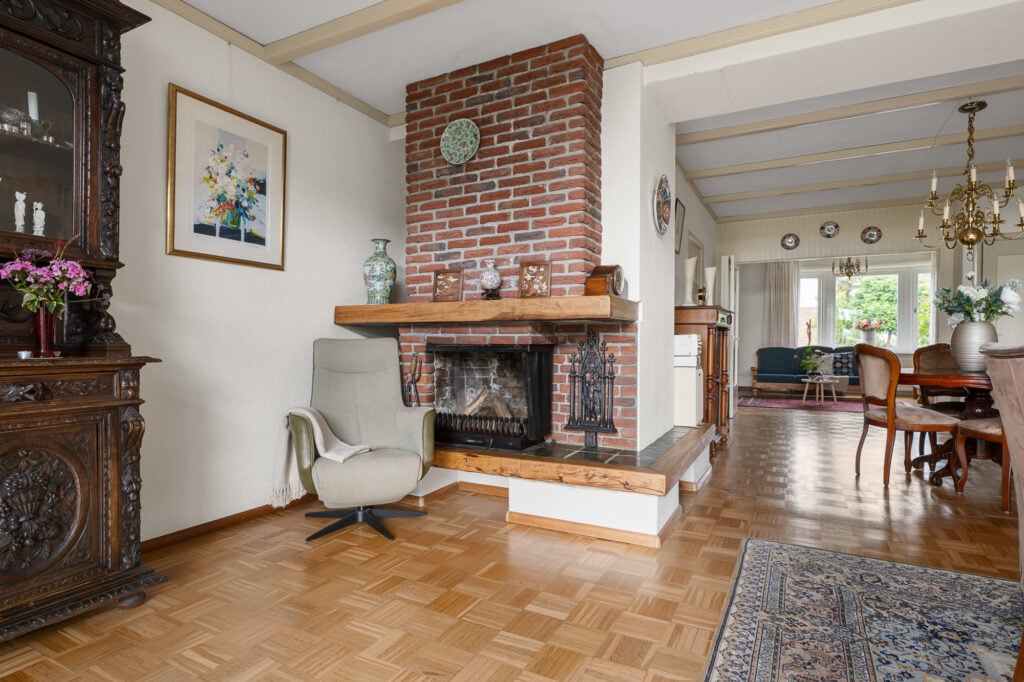 De begane grond verwelkomt je met een ruime hal die de toon zet voor de rest van het huis. De sfeervolle woonkamer, compleet met een knusse openhaard, vormt het hart van het huis waar familie en vrienden graag samenkomen. De keuken, hoewel klassiek van opzet, is voorzien van alle benodigde apparatuur en biedt voldoende ruimte om culinaire hoogstandjes te bereiden. Een praktische bijkeuken zorgt voor extra bergruimte en werkplek.