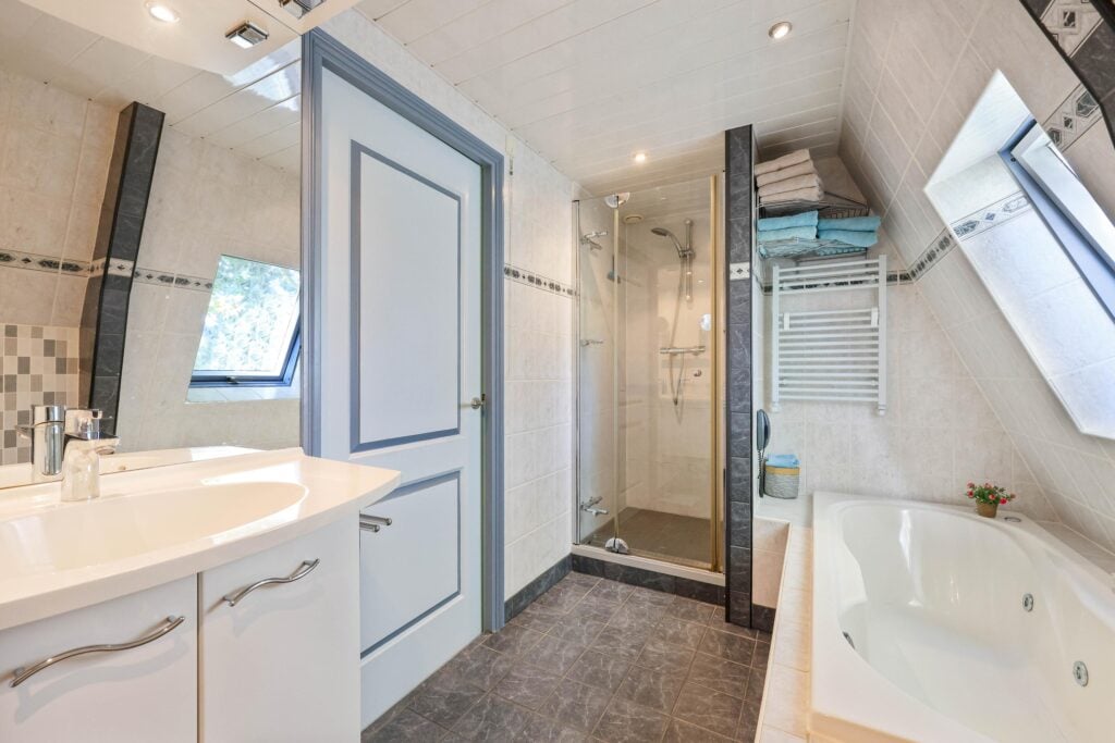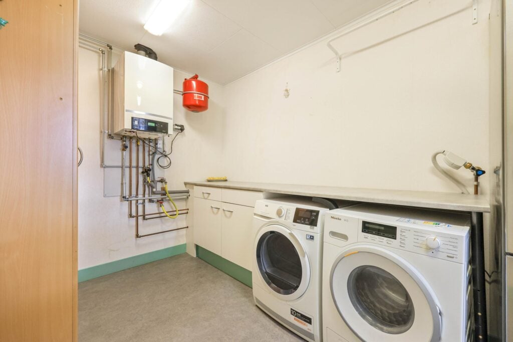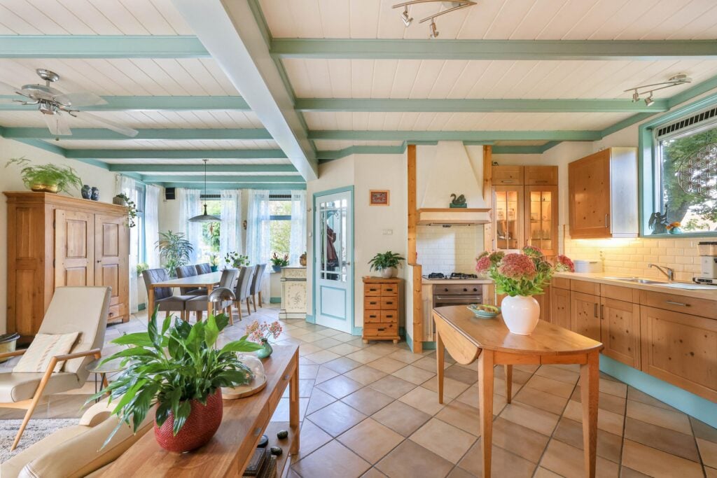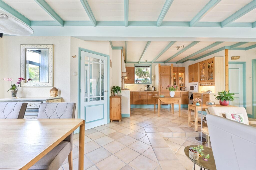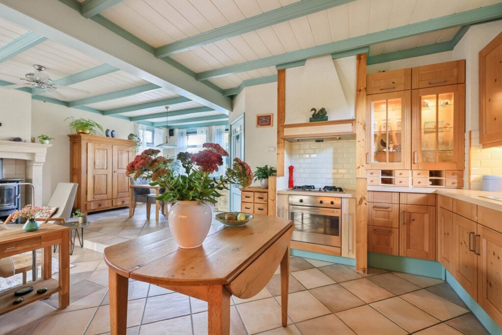 Binnen word je verwelkomd door de royale woonkamer, waar licht en ruimte de boventoon voeren. Dankzij de grote ramen valt het daglicht rijkelijk naar binnen en ontstaat er een warme, uitnodigende sfeer. De landelijke keuken vormt het hart van het huis: een plek waar koken en samenzijn naadloos in elkaar overlopen. Extra praktisch is de bijkeuken met aansluitingen voor wasmachine en droger – ideaal voor het dagelijkse gemak.
