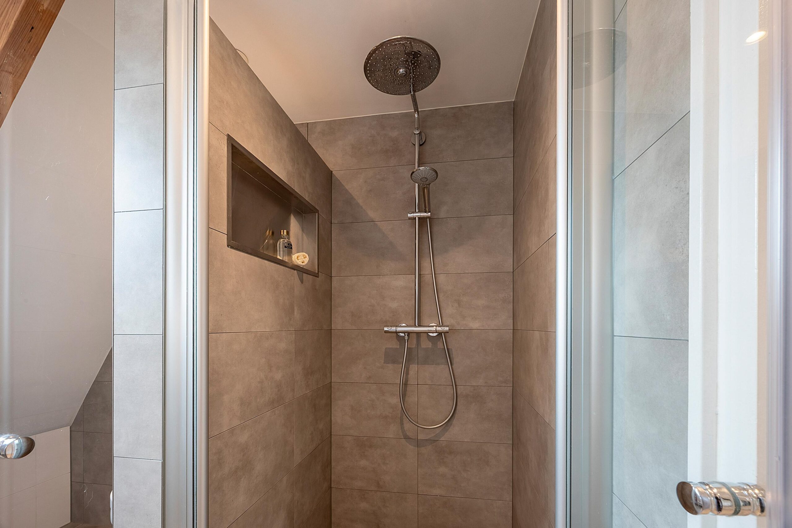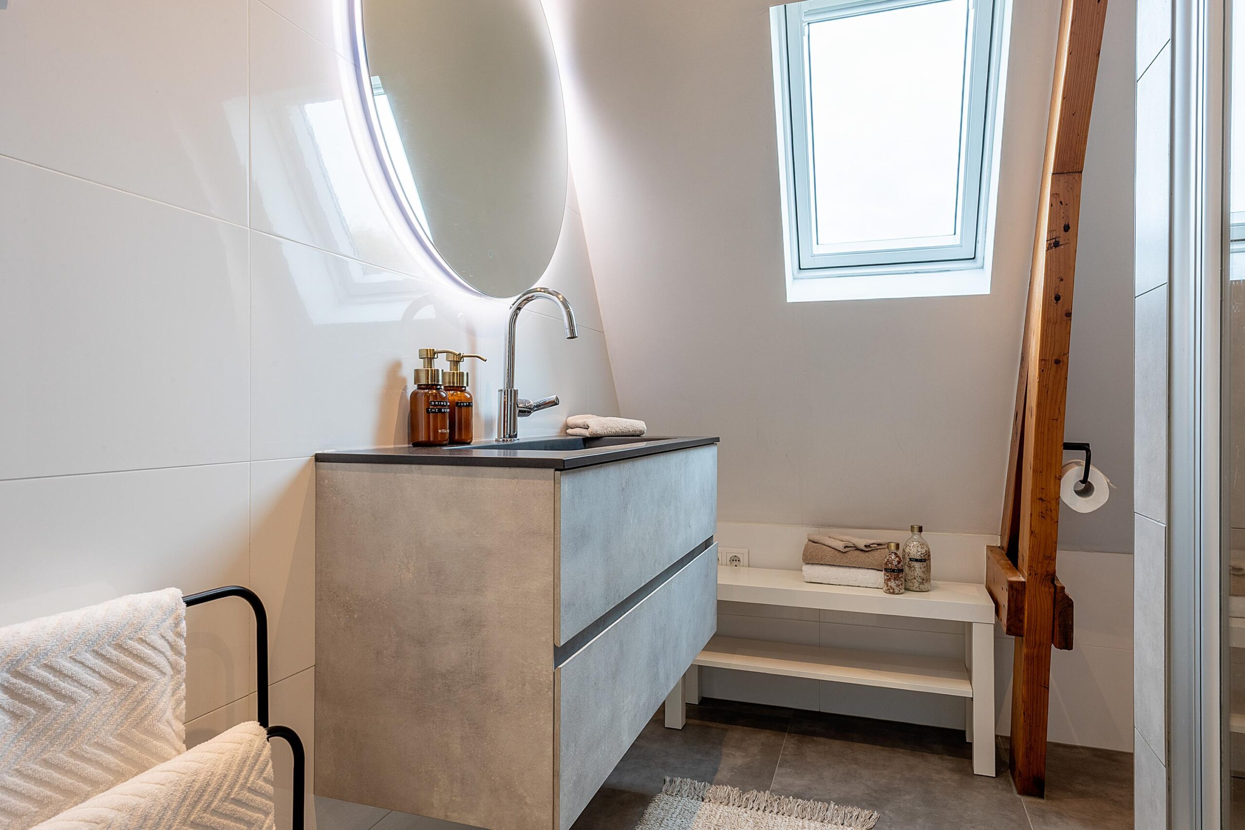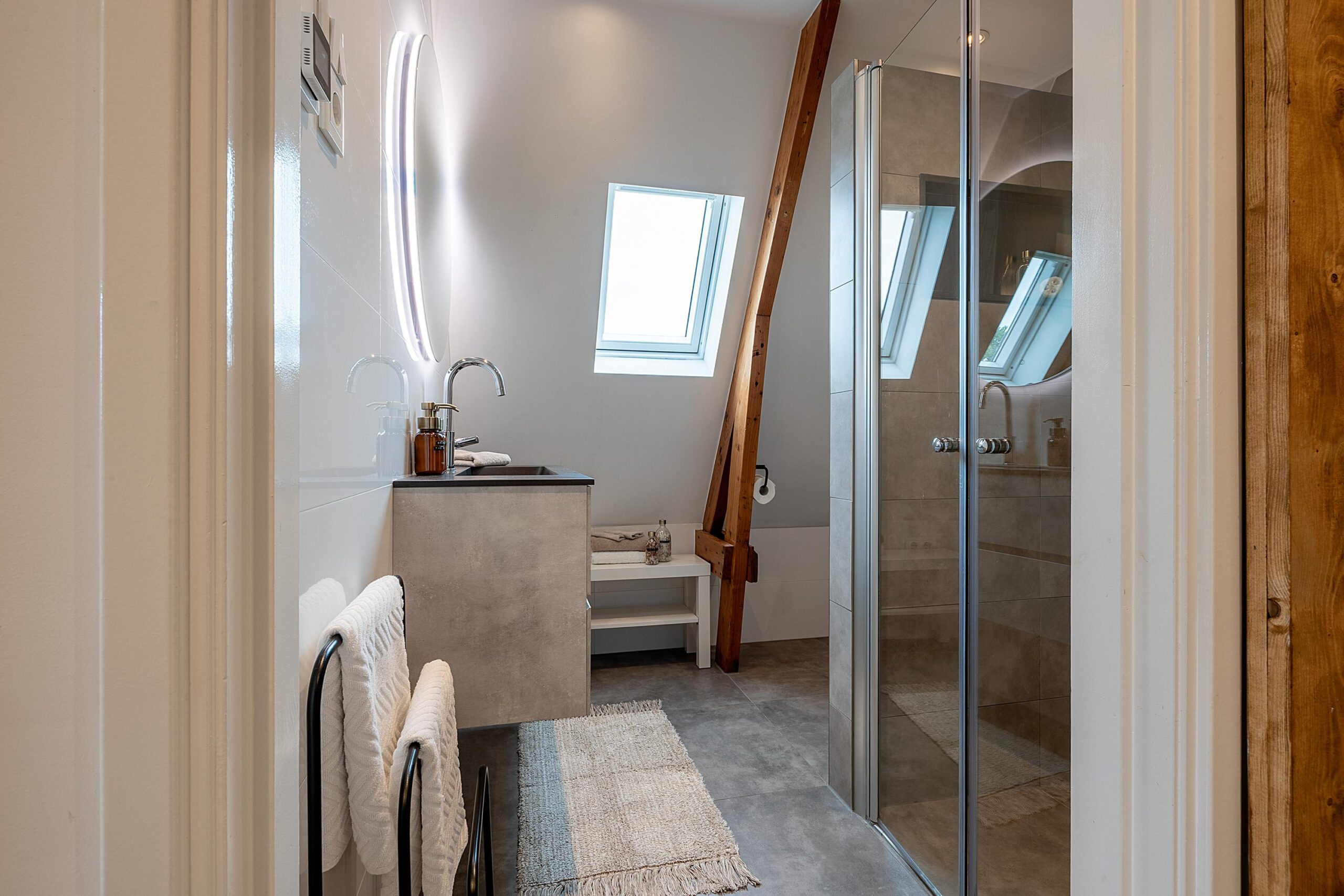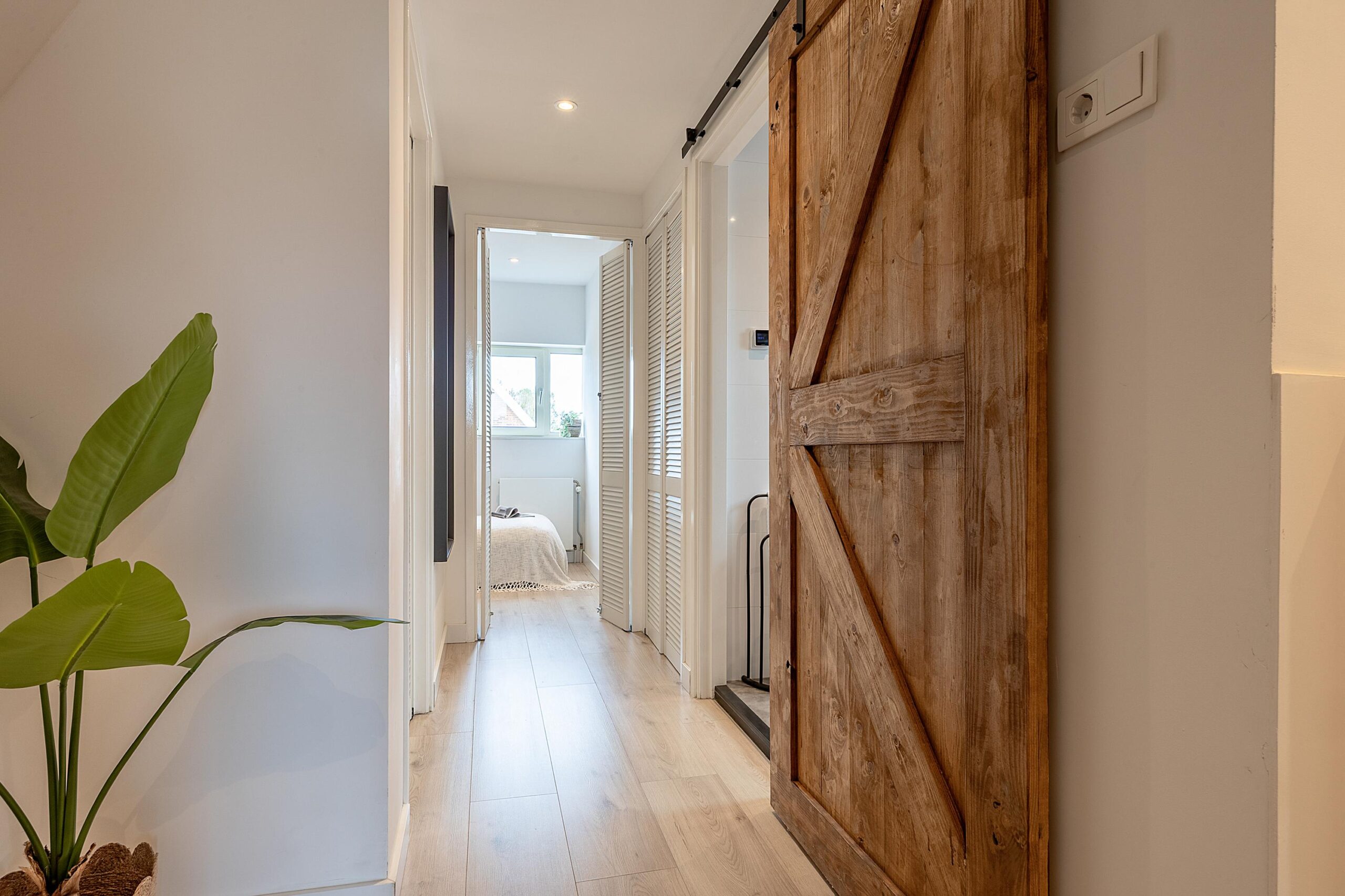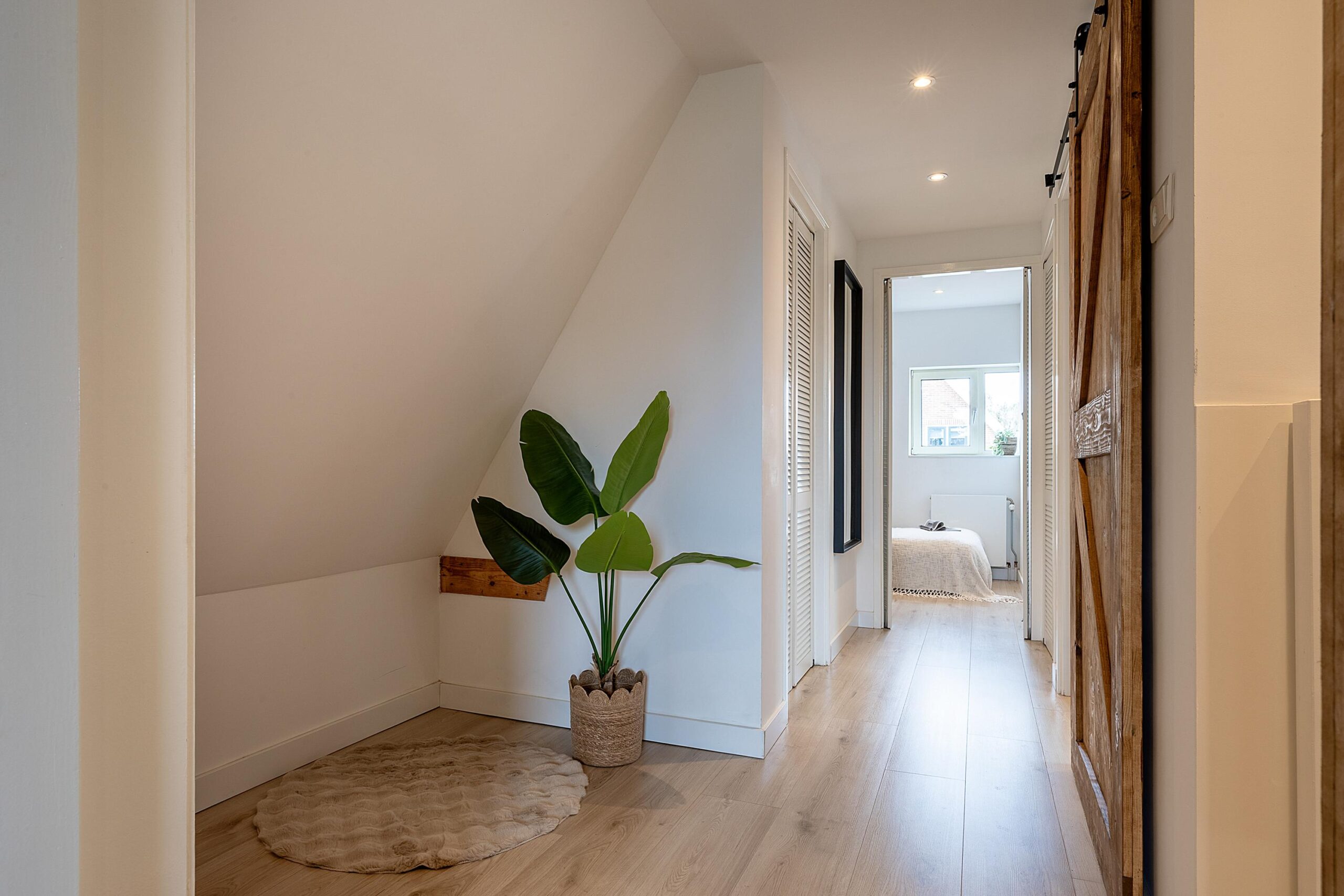 Ook boven is alles tot in detail verzorgd. Op de eerste verdieping bevinden zich drie slaapkamers, waaronder een ruime master bedroom met voldoende plek en een rustige, verzorgde uitstraling. De andere twee kamers zijn perfect te gebruiken als kinder- of werkkamer, of zelfs als inloopkast. De badkamer is in 2023 volledig vernieuwd en verkeert in uitstekende staat. Je vindt hier een moderne inloopdouche, een strak wastafelmeubel en een tweede toilet. Alles is netjes betegeld en voorzien van elektrische vloerverwarming – heerlijk comfortabel in de koudere maanden. Op de overloop is een nette kast met aansluitingen voor de wasmachine en droger, praktisch weggewerkt achter deuren zodat het geheel verzorgd oogt. Bovendien is er een extra vliering aanwezig, ideaal voor het opbergen van seizoensspullen.