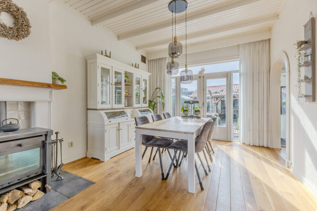 Bij aankomst valt direct de prettige opzet op, met een voortuin en parkeergelegenheid op eigen terrein. Via de entree kom je binnen in de hal, die toegang geeft tot de sfeervolle woonkamer. Hier zorgt de open haard voor extra warmte en gezelligheid, terwijl de raampartijen zorgen voor een aangename lichtinval. De massief houten vloer op de begane grond draagt bij aan de warme en karaktervolle uitstraling van het geheel. Aansluitend bevindt zich de dichte keuken, praktisch ingericht en in directe verbinding met de bijkeuken, waar zich de aansluitingen voor wasmachine en droger bevinden.