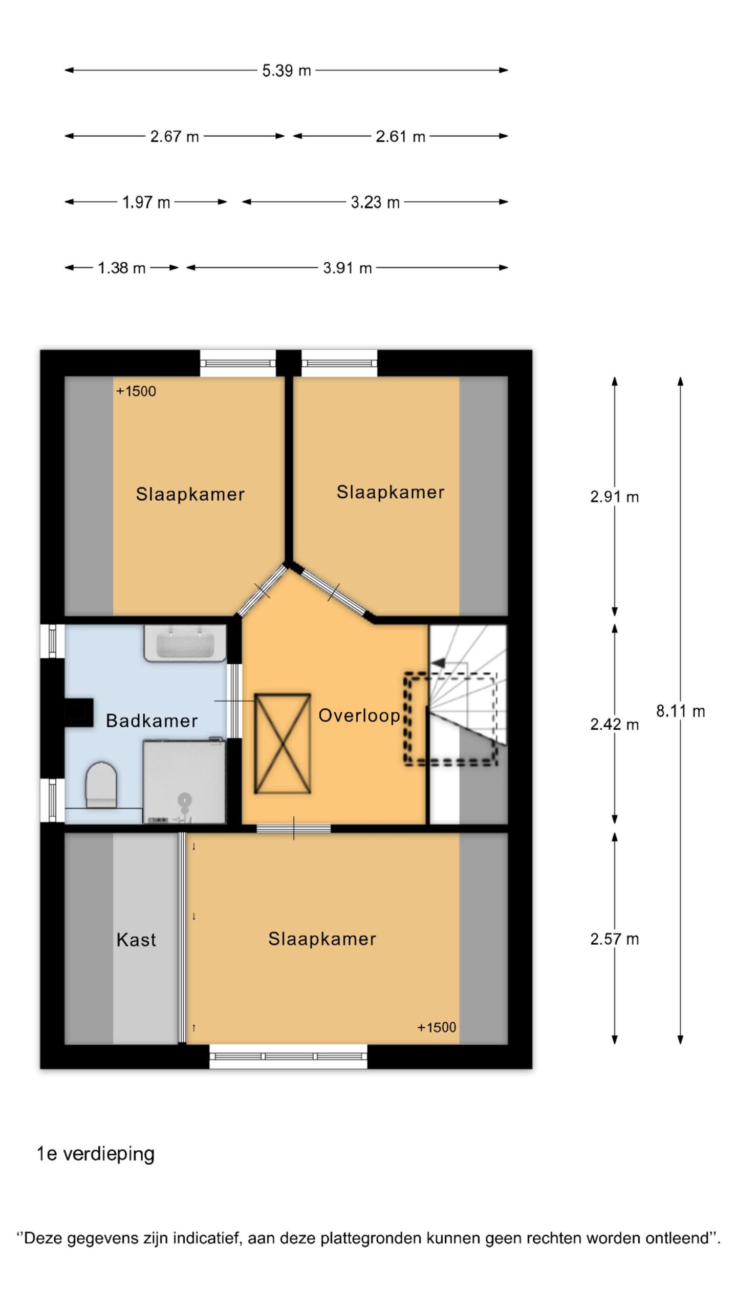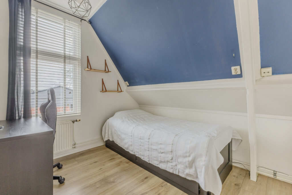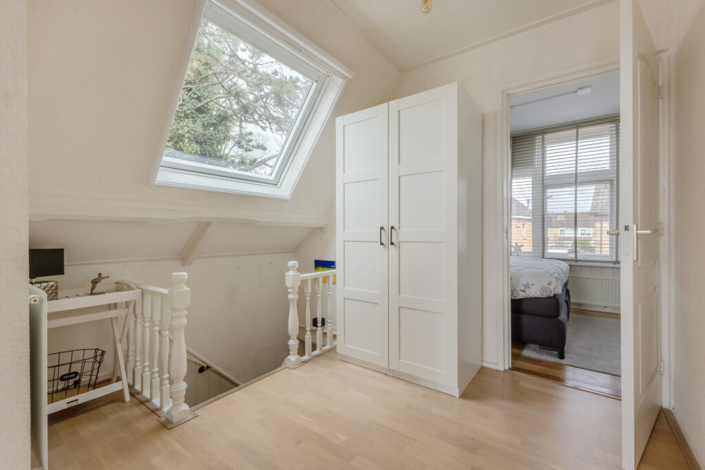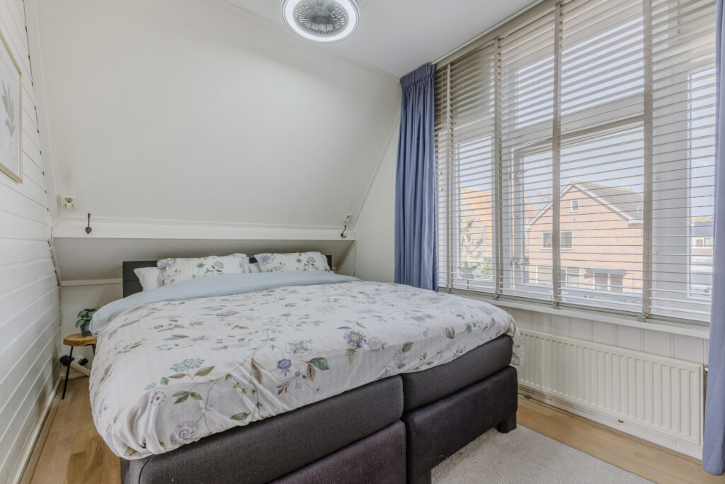 Op de verdieping zijn drie slaapkamers gesitueerd, elk met een prettige lichtinval en bruikbare indeling. De badkamer is compleet uitgevoerd en beschikt over een dubbele wastafel, douche en toilet, wat het geheel comfortabel en functioneel maakt.