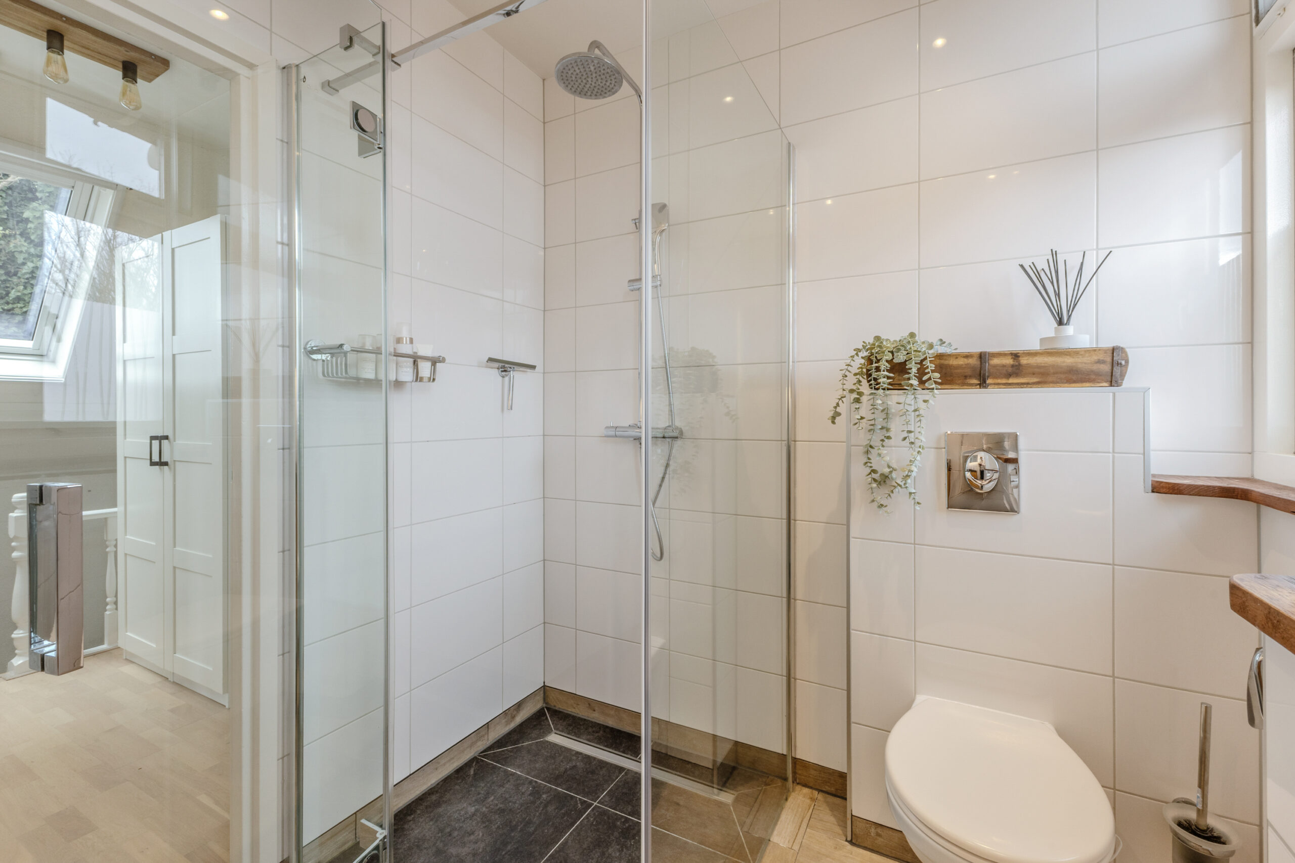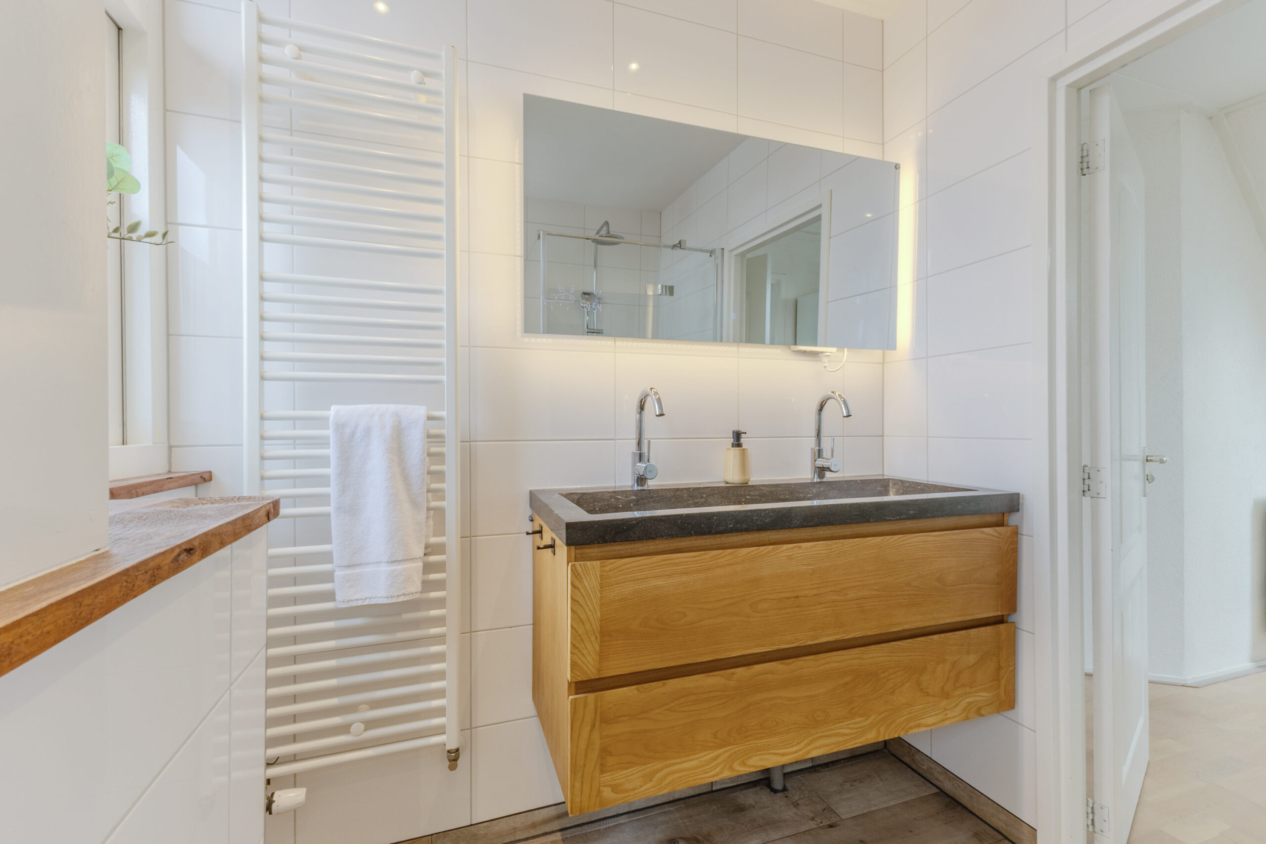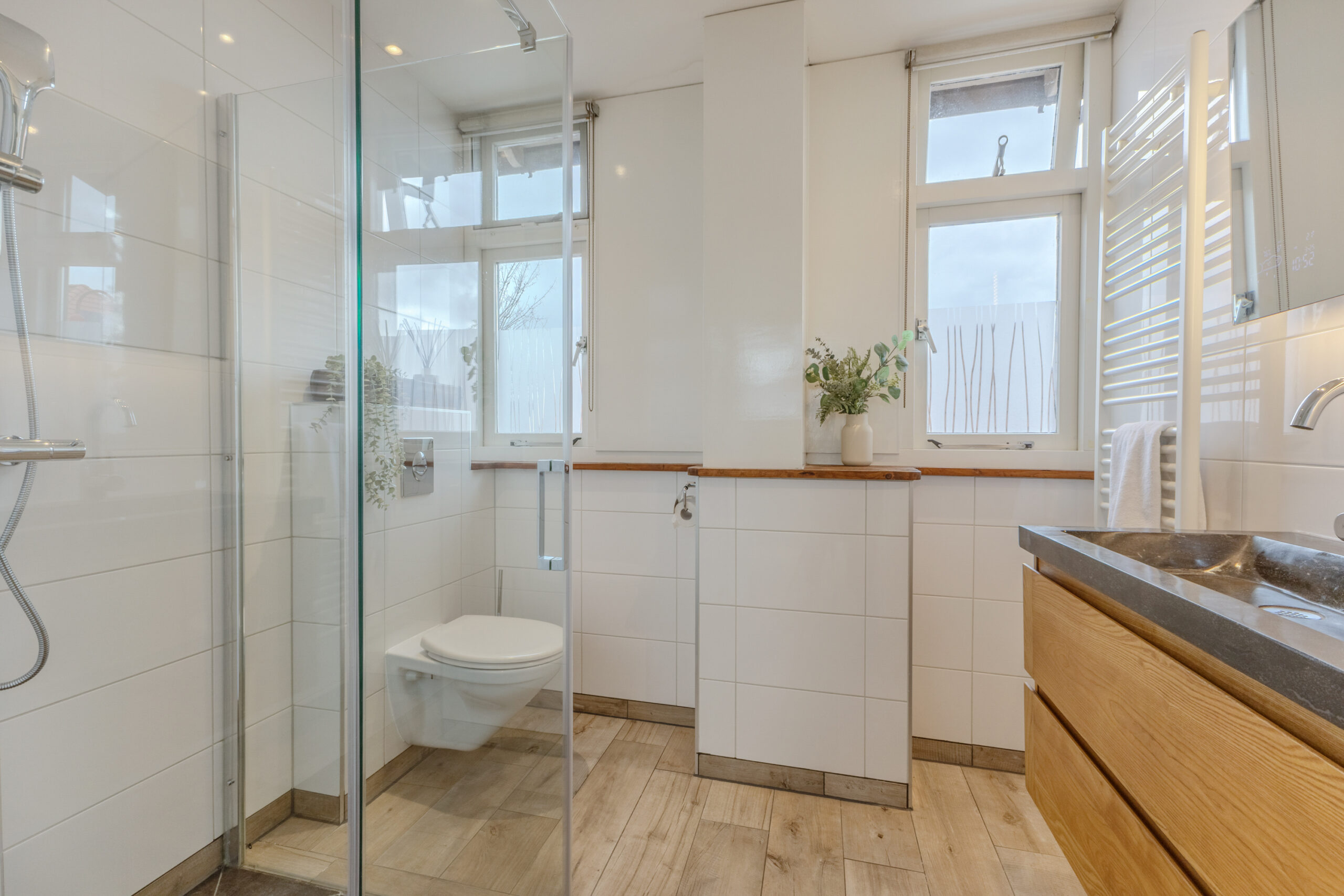 Op de verdieping zijn drie slaapkamers gesitueerd, elk met een prettige lichtinval en bruikbare indeling. De badkamer is compleet uitgevoerd en beschikt over een dubbele wastafel, douche en toilet, wat het geheel comfortabel en functioneel maakt.