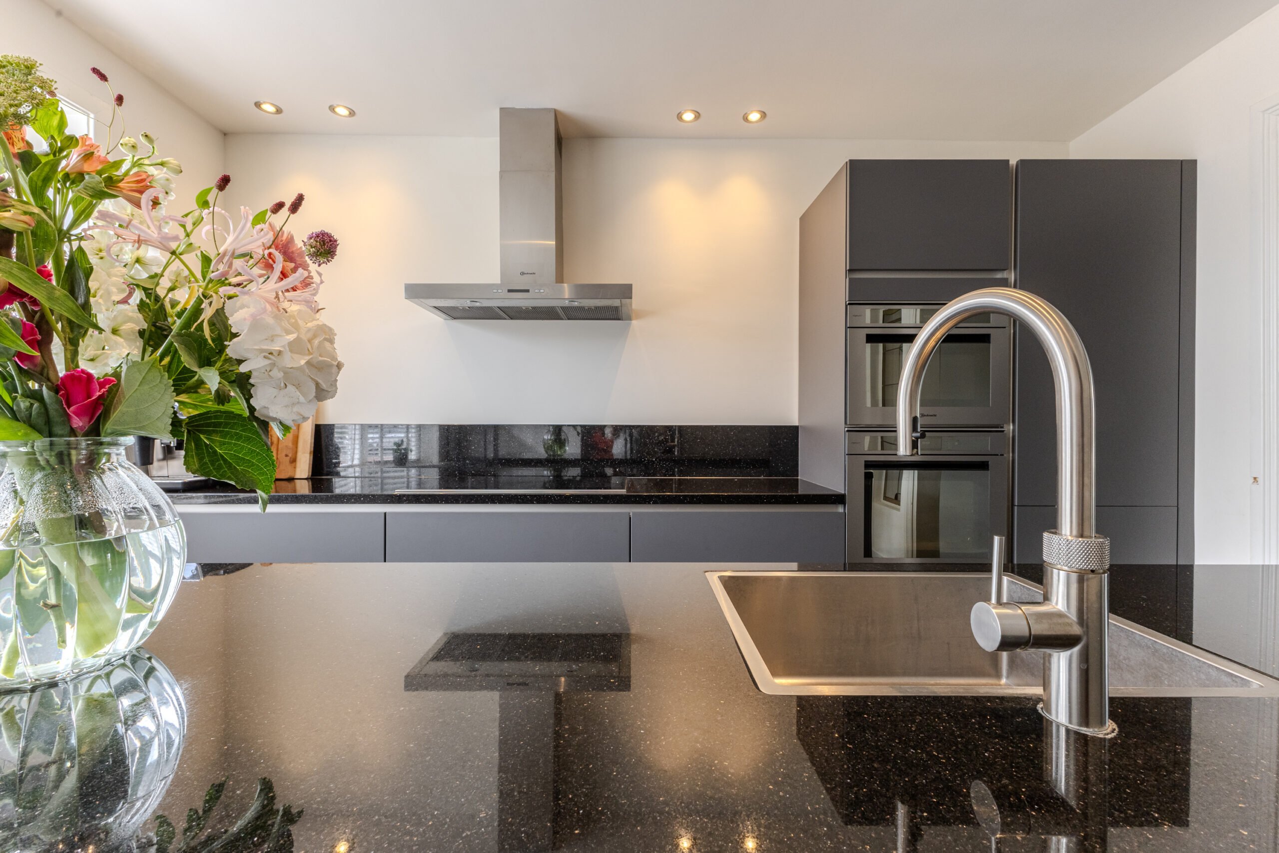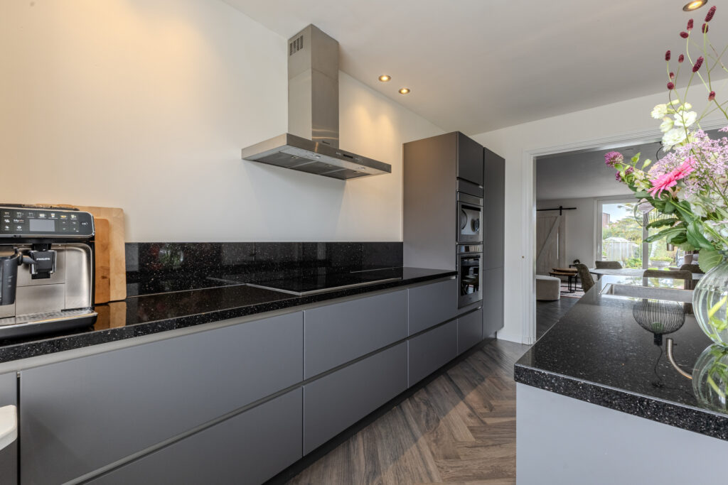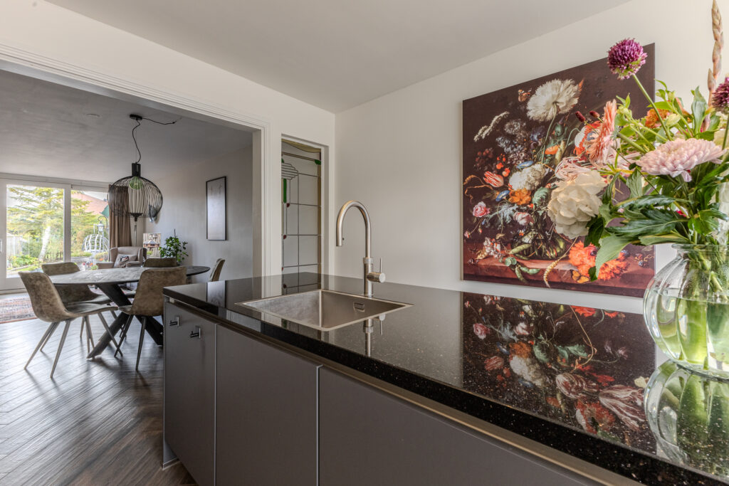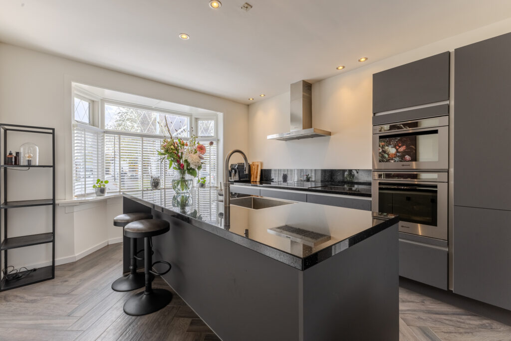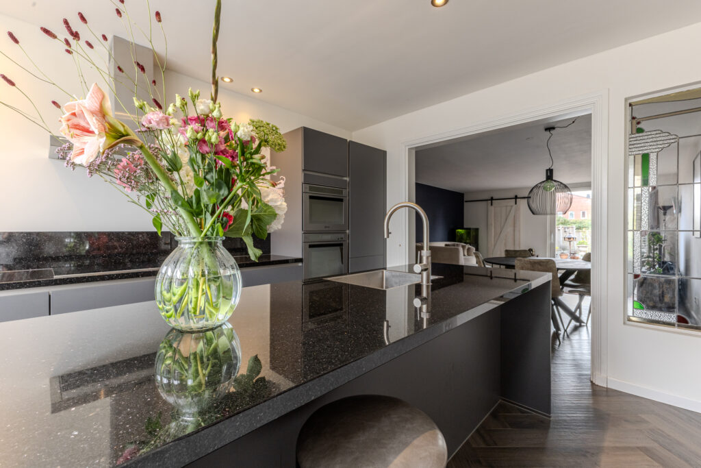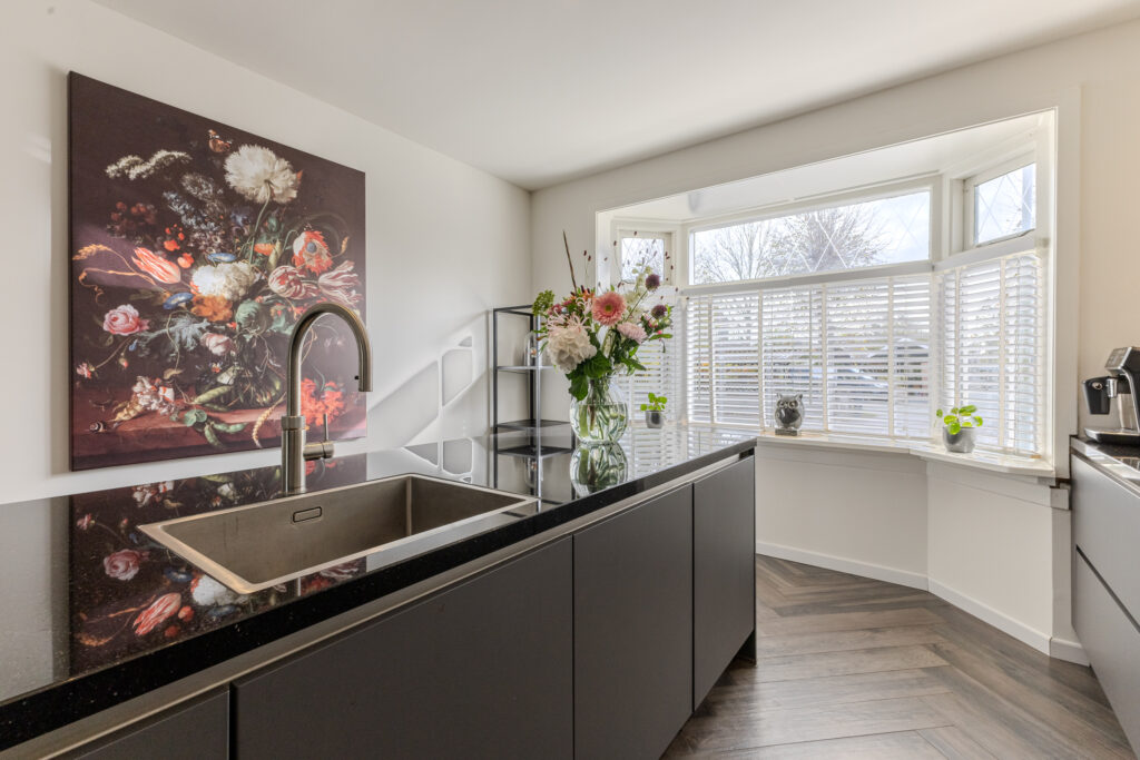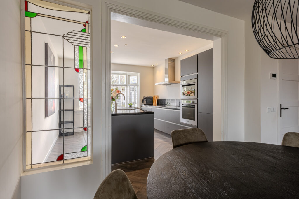 Aan de voorzijde bevindt zich de sfeervolle keuken, waar het spoeleiland met barretje direct het hart van de ruimte vormt. Hier kun je gezellig aanschuiven met een kop koffie of borrel, terwijl er wordt gekookt. De keuken is in 2018 vernieuwd en uitgerust met een inductiekookplaat, oven, vaatwasser en een Quooker. De erker aan de voorzijde laat royaal daglicht binnen en de authentieke details, zoals het glas-in-lood, geven het geheel een warme en karaktervolle uitstraling. Perfect voor wie houdt van koken én gezelligheid.