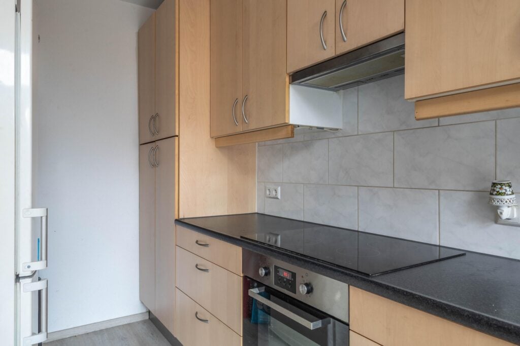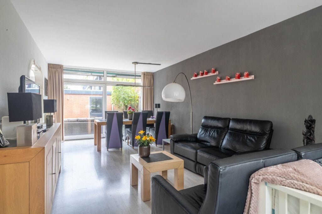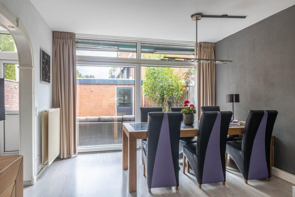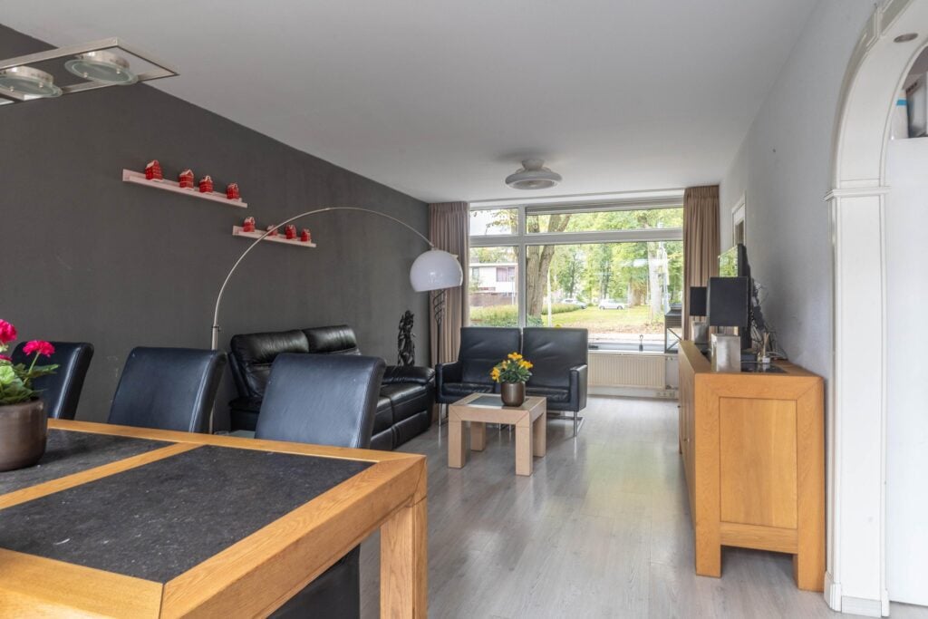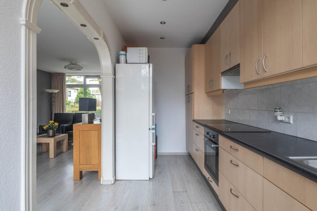 Bij binnenkomst stap je de lichte woonkamer binnen, waar het daglicht van beide kanten rijkelijk naar binnen stroomt. Het grote raam aan de voorzijde met vrij uitzicht en de schuifpui aan de achterzijde zorgen voor een open, uitnodigende sfeer. Er is volop ruimte voor een gezellige zithoek én een eettafel waar je samen met vrienden of familie heerlijk kunt tafelen. De keuken bevindt zich achterin de woning en is voorzien van moderne inbouwapparatuur zoals een inductiekookplaat, oven en vaatwasser. Hier kook je met plezier, terwijl je altijd contact houdt met de woonkamer en de tuin.