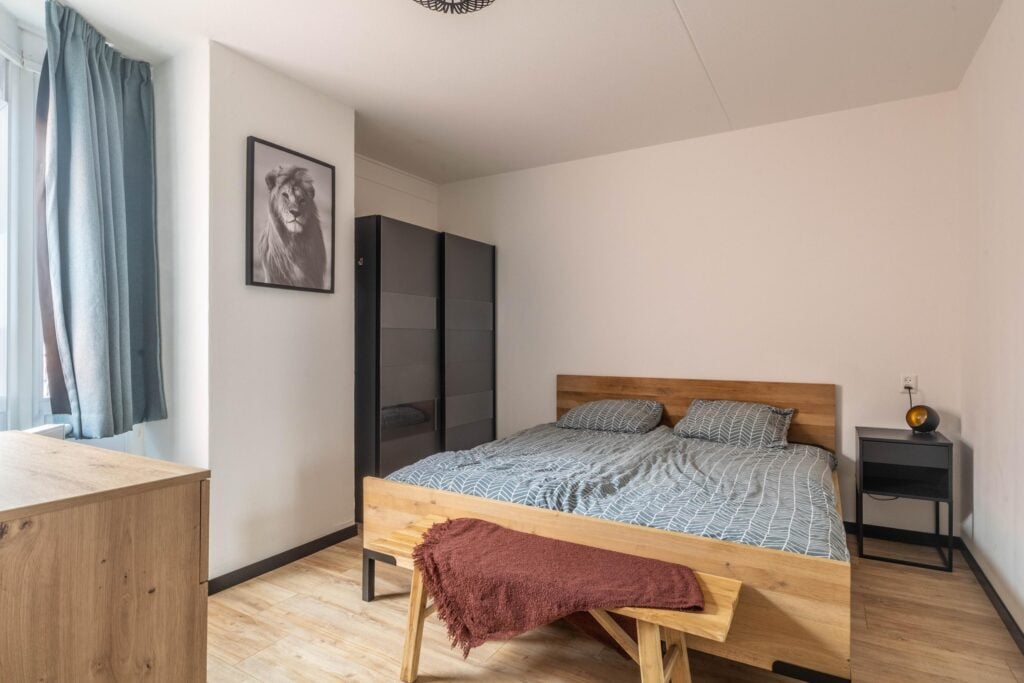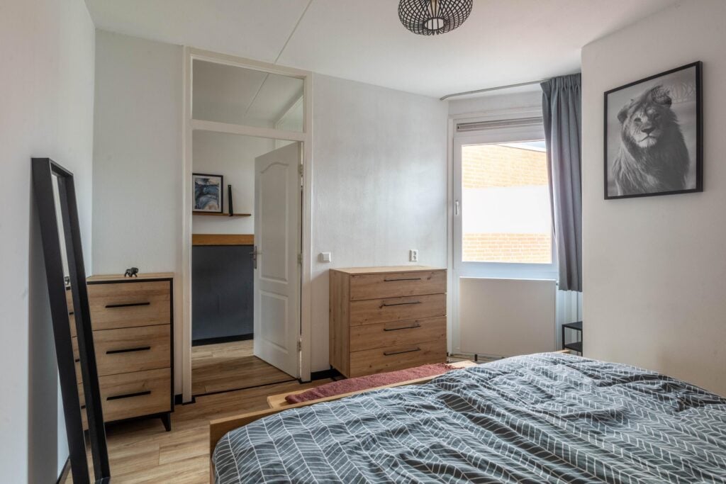 De slaapkamer is ruim genoeg voor een tweepersoonsbed en kledingkast en voelt dankzij de rustige ligging prettig aan. De badkamer is toegankelijk vanuit de hal en modern en compleet ingericht met douche, wastafel en toilet.