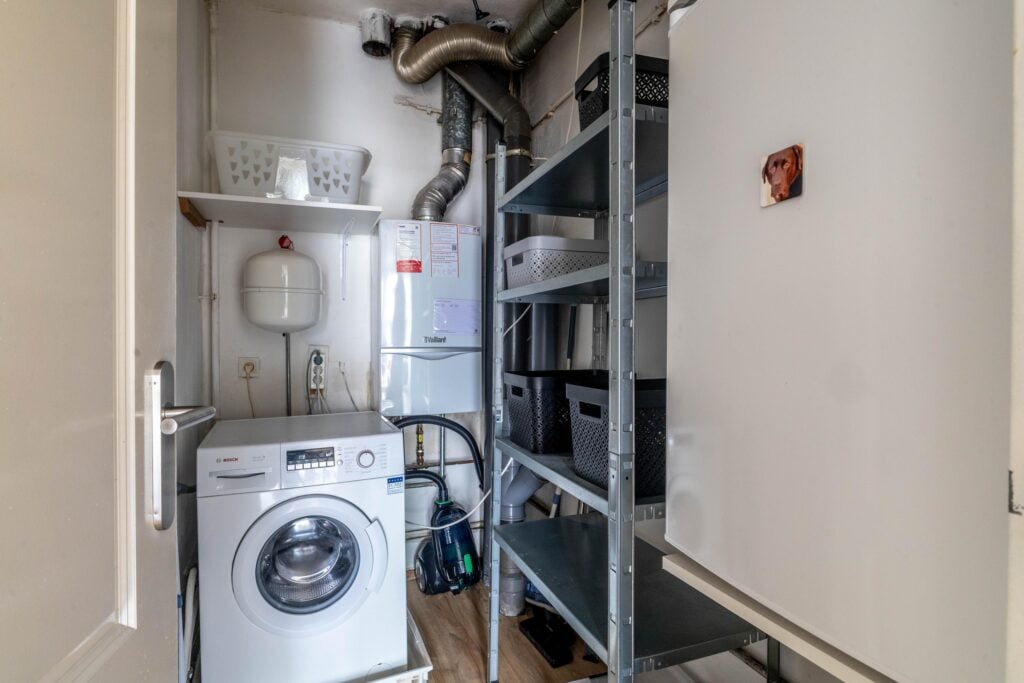 Deze royale ruimte is de echte eyecatcher: dankzij de brede schuifpui valt het daglicht rijkelijk binnen en kijk je uit over het water. Het privé zonneterras van circa 17 m² ligt direct aan de woonkamer en vormt een prachtig verlengstuk van het leefgedeelte. Hier geniet je ’s ochtends van een kop koffie in alle rust of sluit je de dag af met een drankje bij een ondergaande zon. Stap je in je bootje, dan vaar je vanuit je eigen achtertuin zo naar de Jagersplas en verder de Zaanstreek in, een unieke combinatie van wonen en recreëren. De woonkamer biedt bovendien alle ruimte voor een gezellige zithoek en een eettafel, grenzend aan de open keuken. Aangrenzend bevindt zich een praktische berging met plek voor de cv-ketel en wasmachineaansluiting.