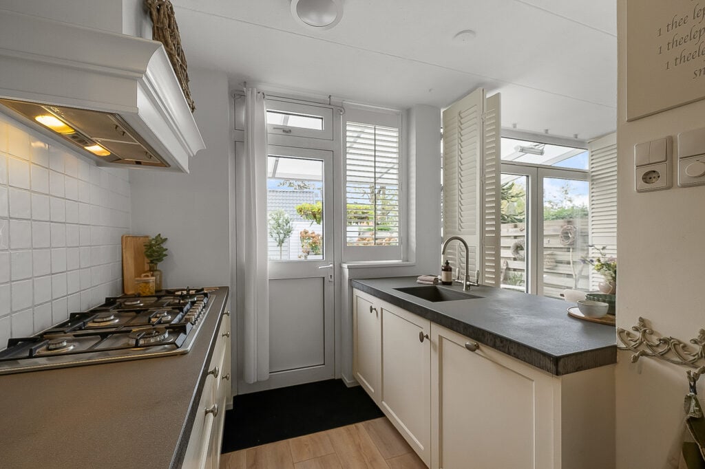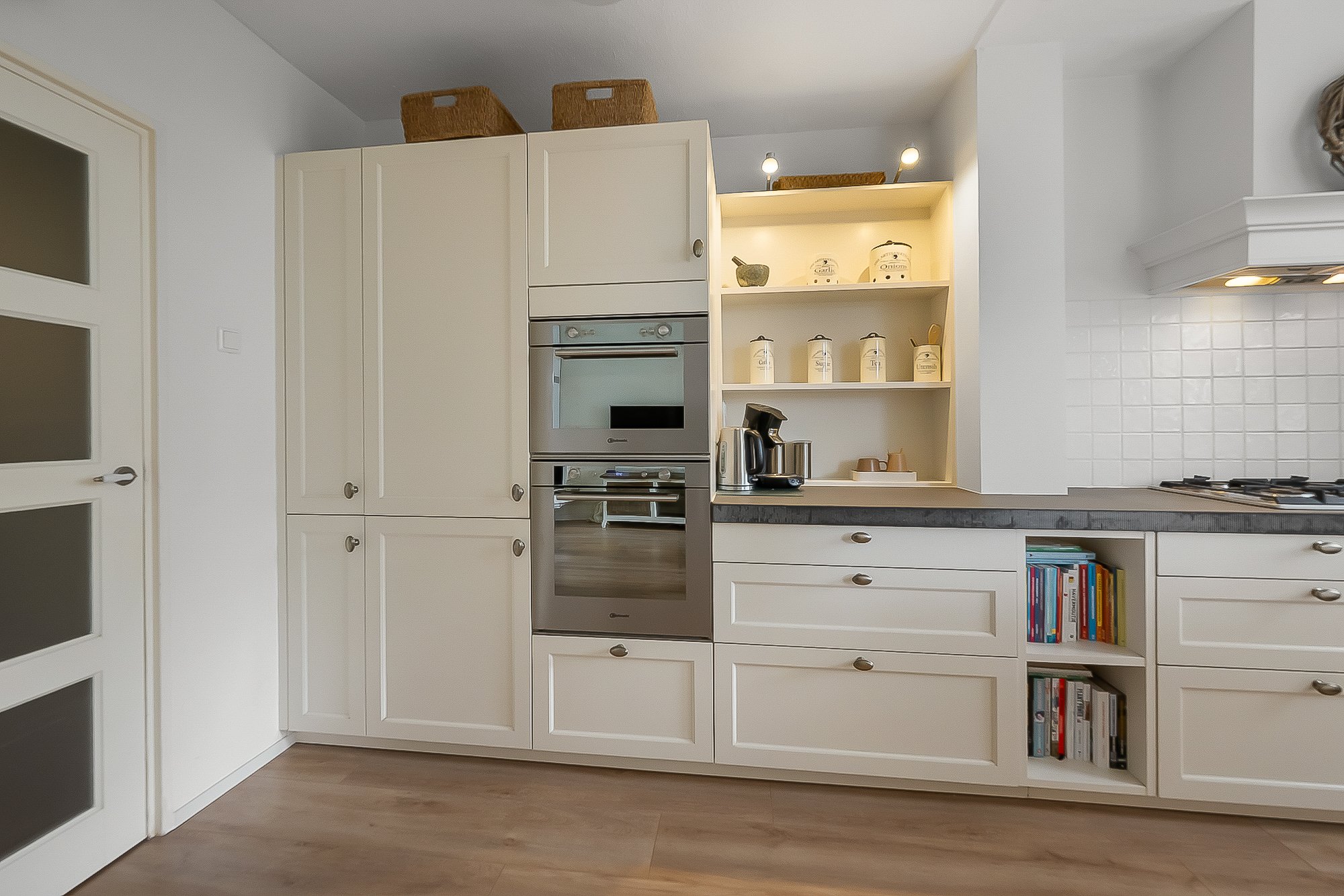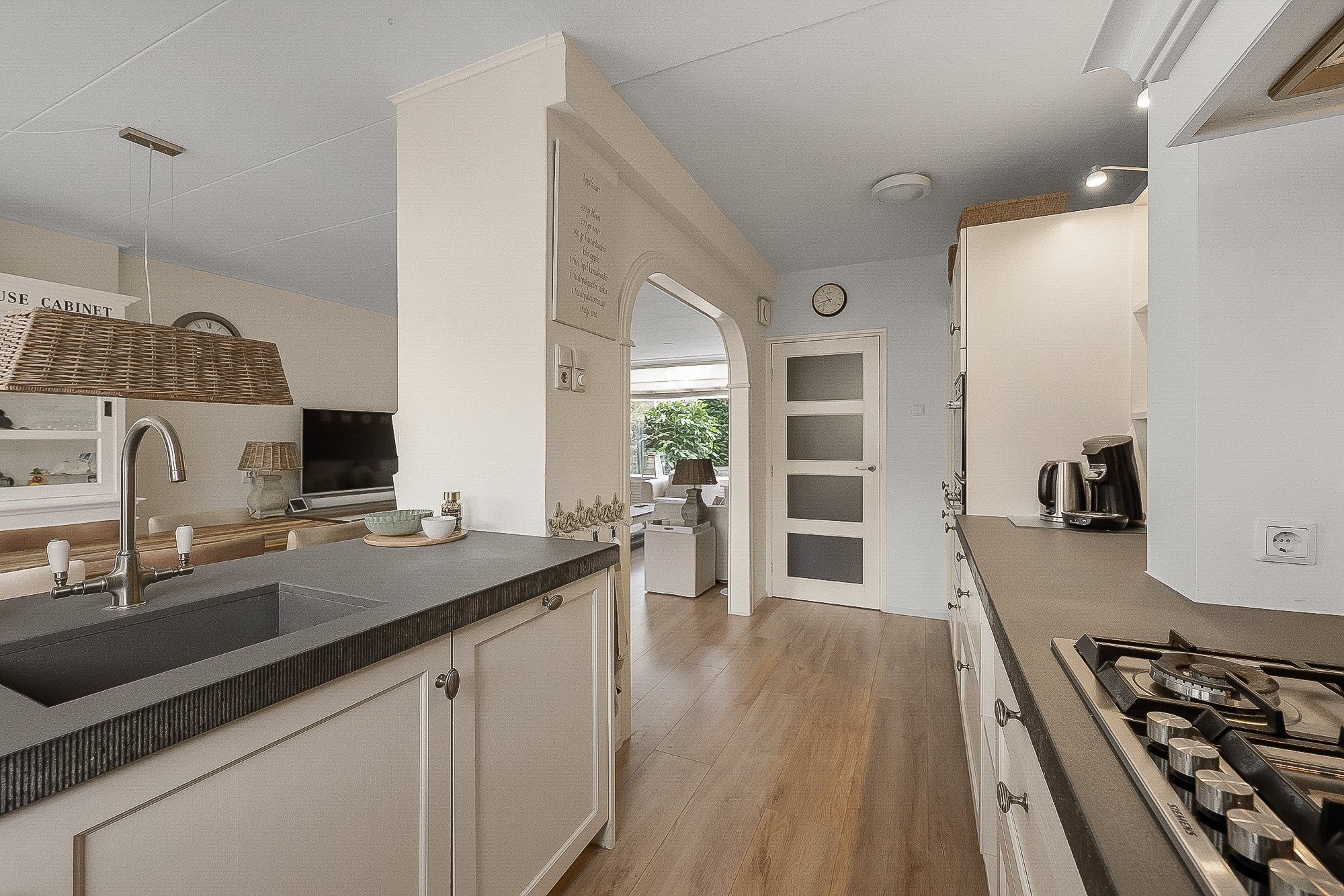 De keuken bevindt zich in de aanbouw en is in 2011 vernieuwd. De opstelling biedt veel werk- en opbergruimte en is voorzien van diverse inbouwapparatuur, waaronder een vaatwasser uit 2022. Via de serre loop je zo de zonnige, op het zuiden gelegen tuin in.