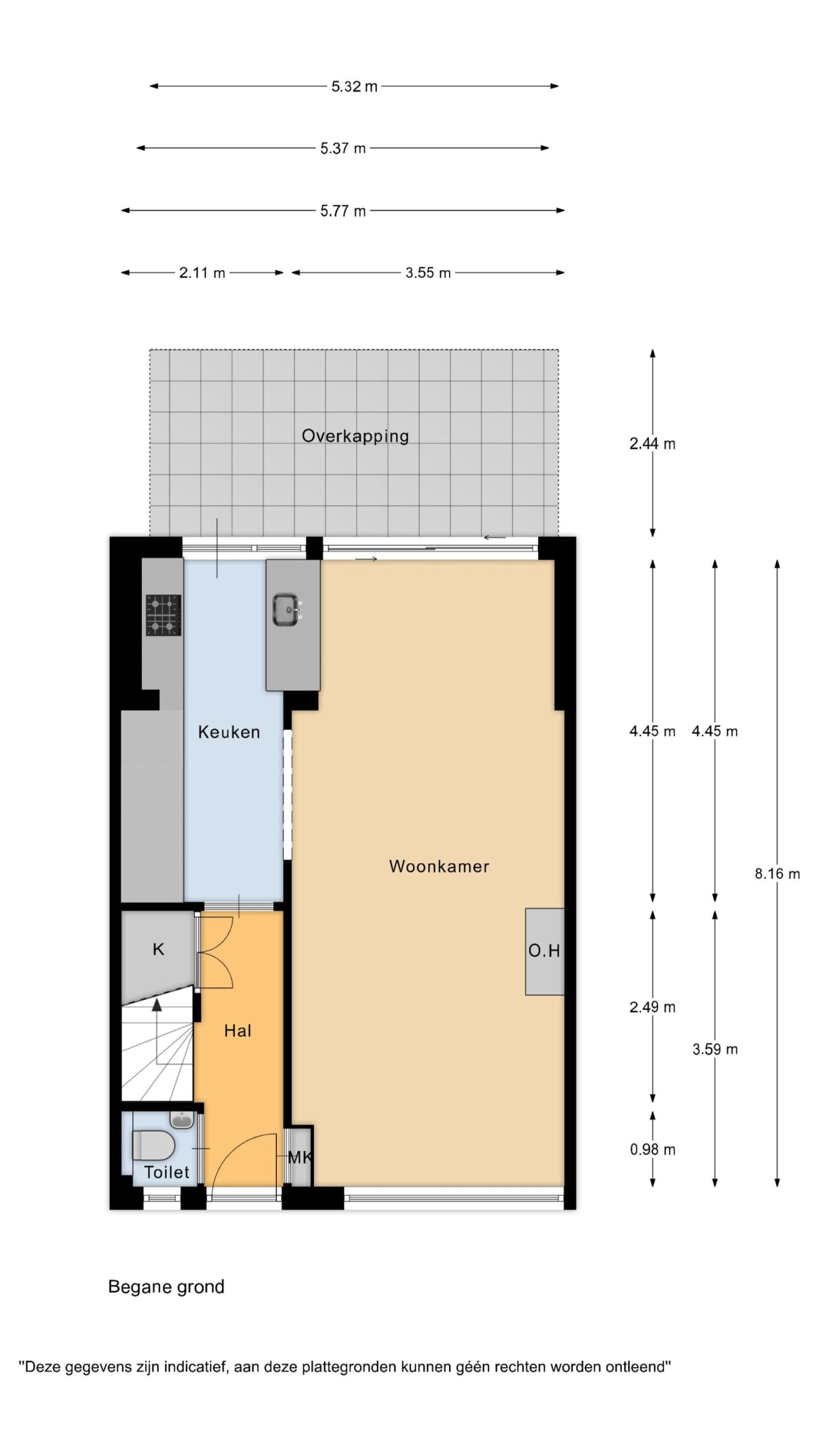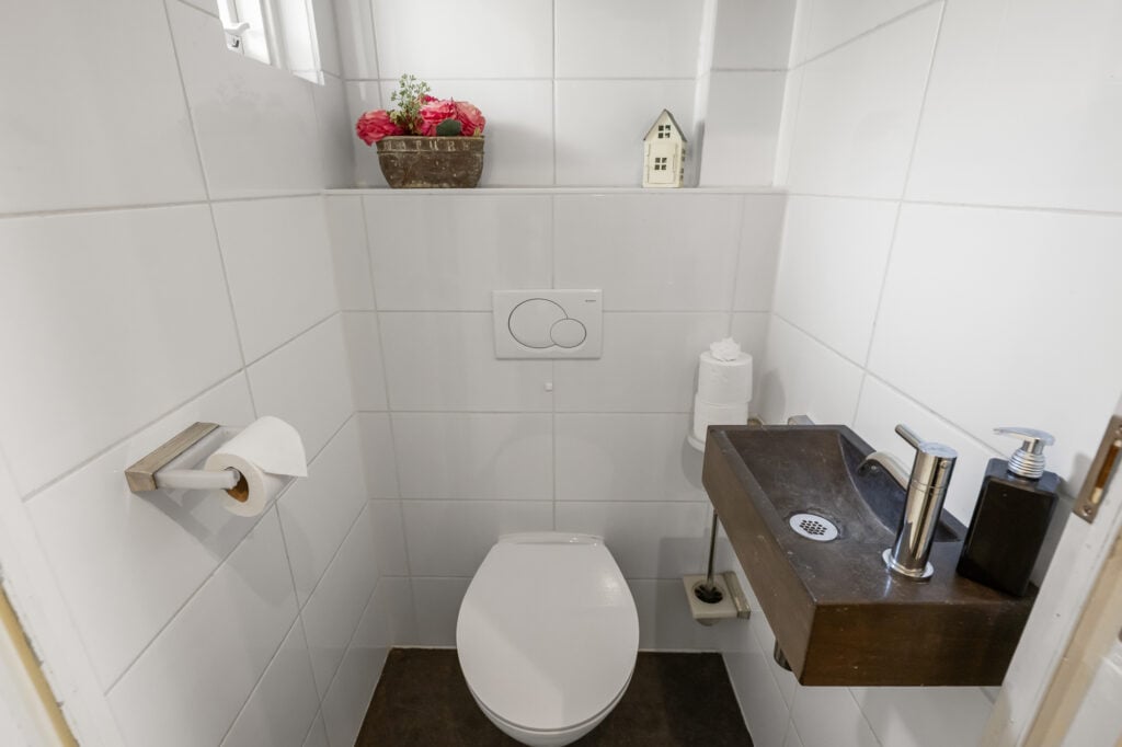 Je komt binnen in de hal met meterkast, toilet en ruimte voor jassen en schoenen. Vanuit hier stap je de lichte doorzonwoonkamer binnen, waar de grote ramen zorgen voor een fijne, warme sfeer. Aan de voorzijde maak je een gezellige zithoek en aan de achterzijde is volop ruimte voor een grote eettafel.