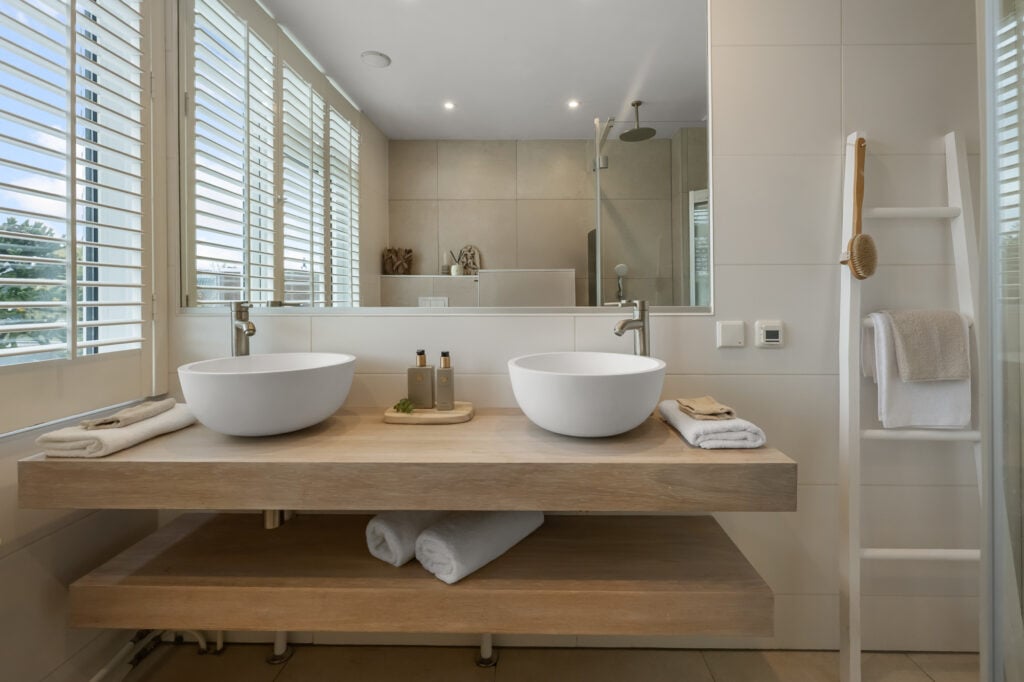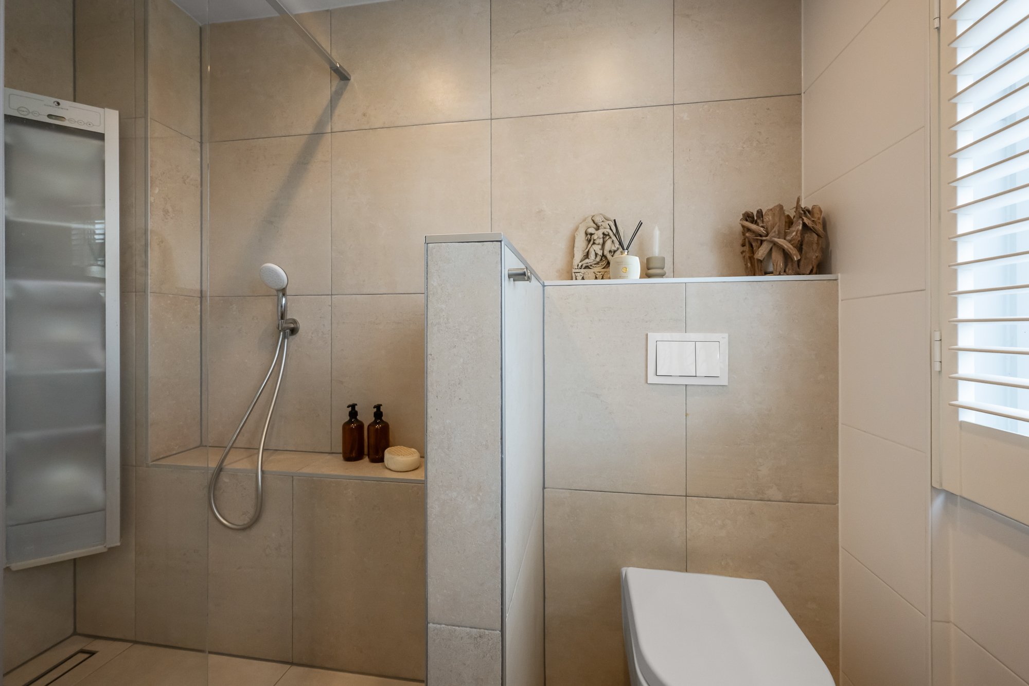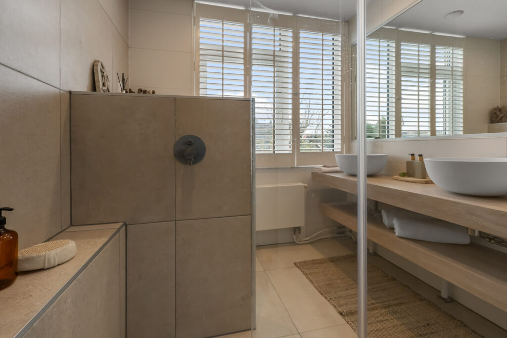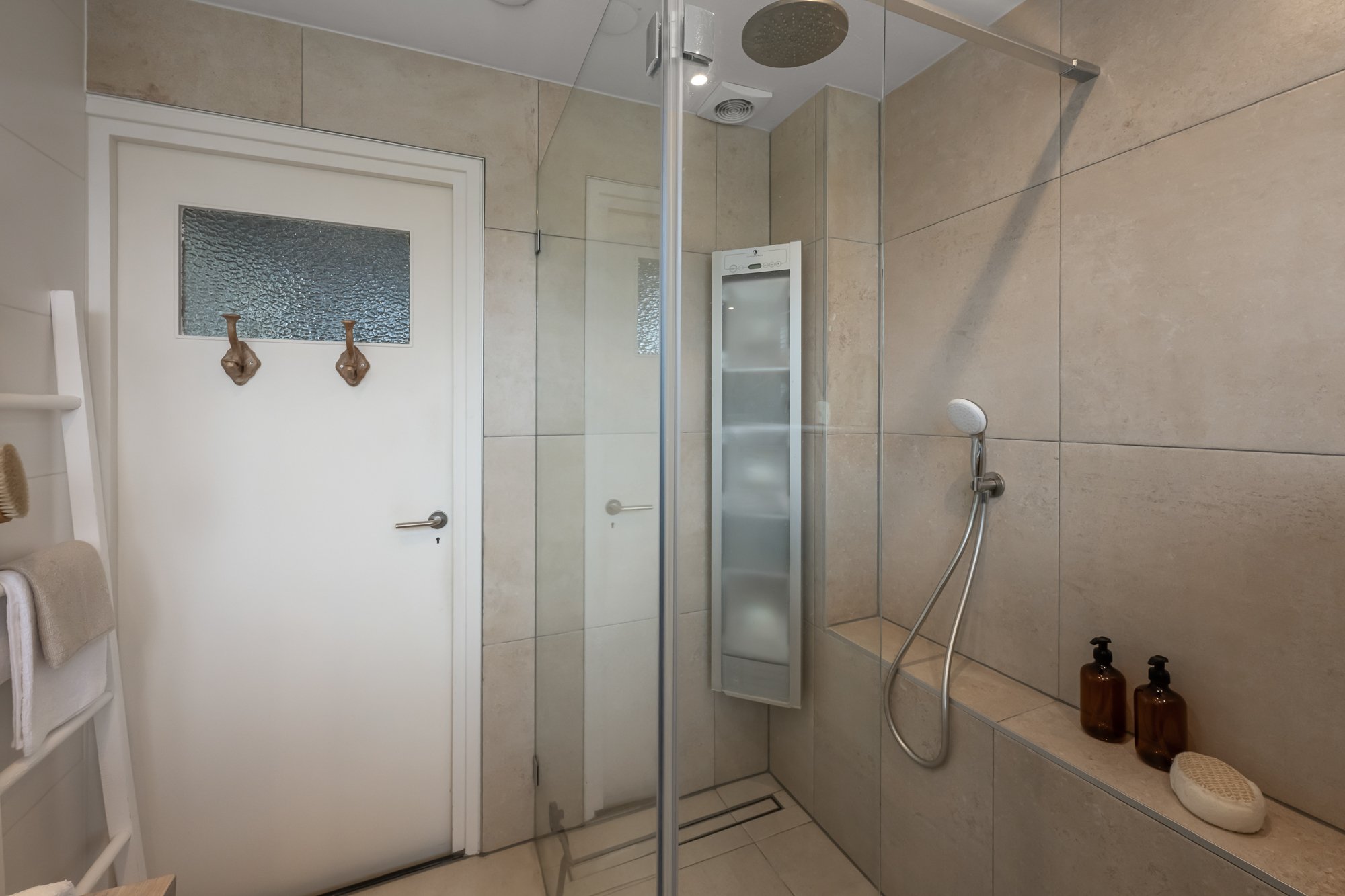 De badkamer (2014) heeft een frisse, moderne uitstraling en is voorzien van een douche, wastafelmeubel en aansluitingen voor de wasmachine.