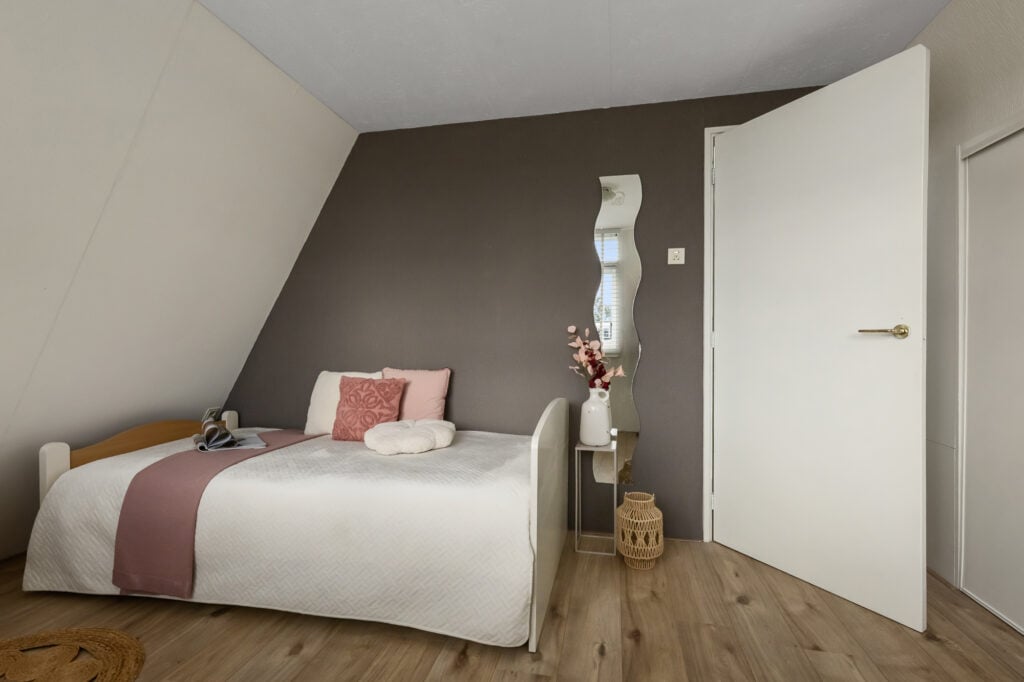 Via de vaste trap bereik je de tweede verdieping, waar dankzij de opbouw twee volwaardige slaapkamers zijn gerealiseerd. Beide kamers profiteren van daglicht en voelen door de hoogte ruim aan.