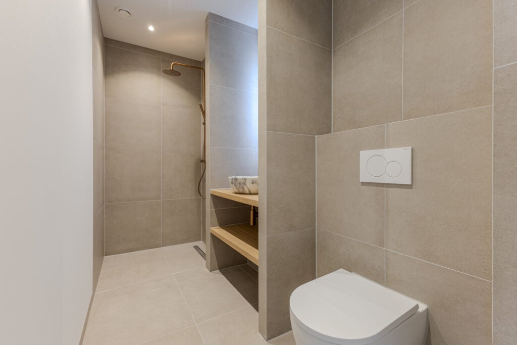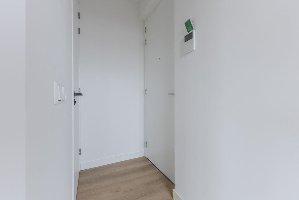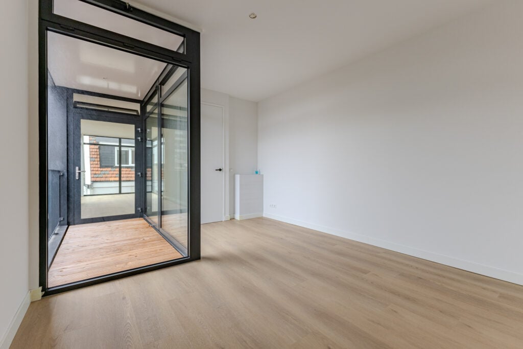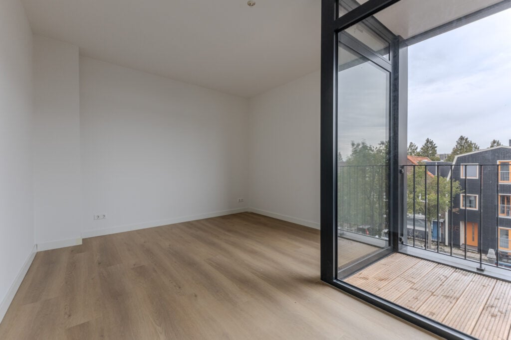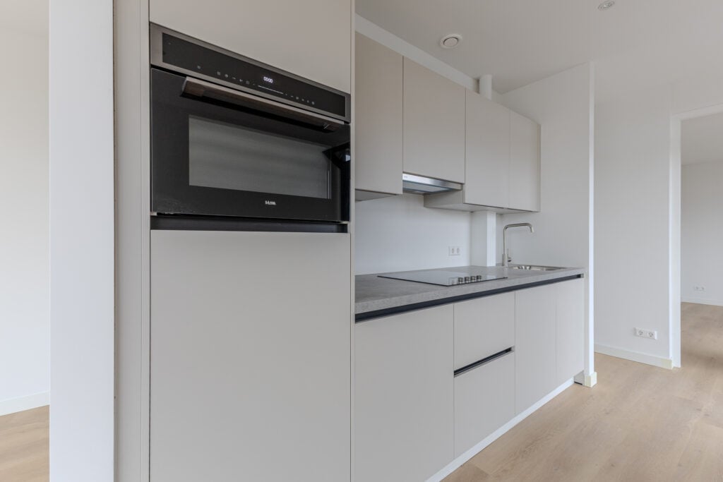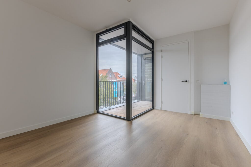 Aan de andere zijde van het appartement bevindt zich de verrassend ruime slaapkamer. Ook hier zorgen de grote raampartijen voor een fijne lichtinval en heb je direct zicht op je eigen balkon – een heerlijke plek om je dag ontspannen te beginnen of juist rustig af te sluiten. Er is meer dan genoeg ruimte voor een royaal tweepersoonsbed én een ruime kastenwand. De badkamer is een echte eyecatcher: zeer luxe en stijlvol afgewerkt met een ruime inloopdouche, een strak wastafelmeubel en een toilet. Deze badkamer geeft je elke dag een hotelachtige ervaring. Alles is splinternieuw, dus je kunt er zonder enige verbouwing zó in – instap klaar!