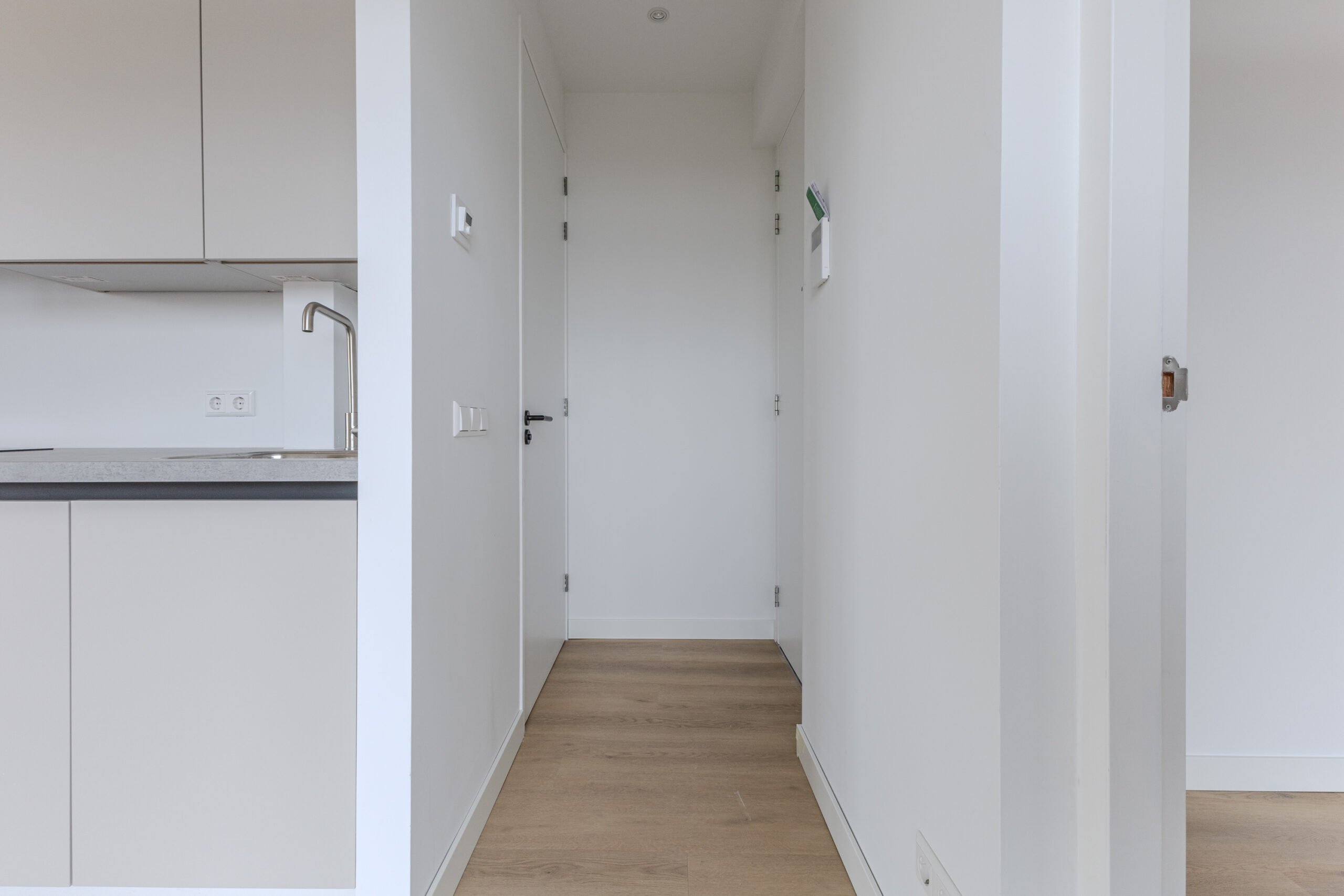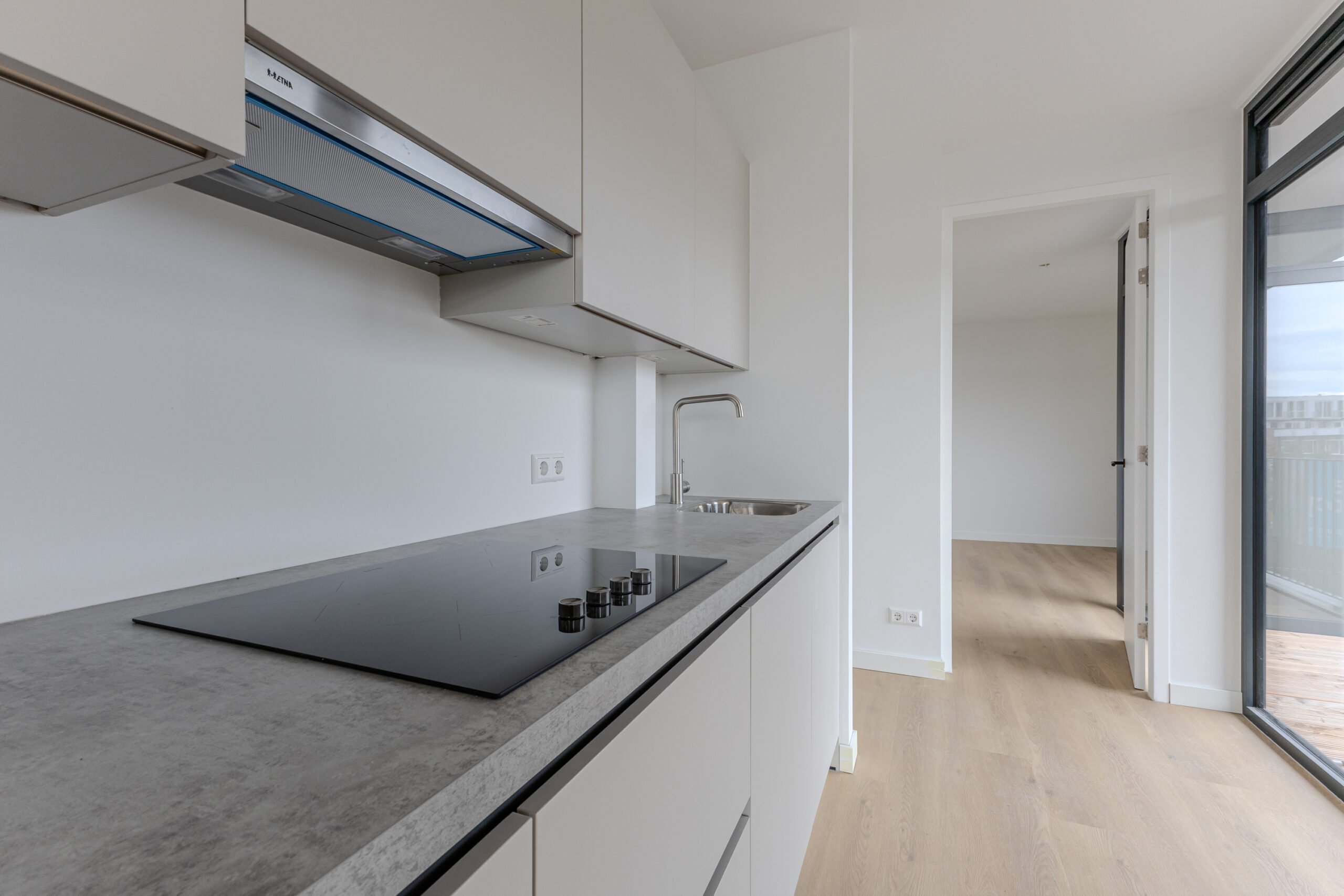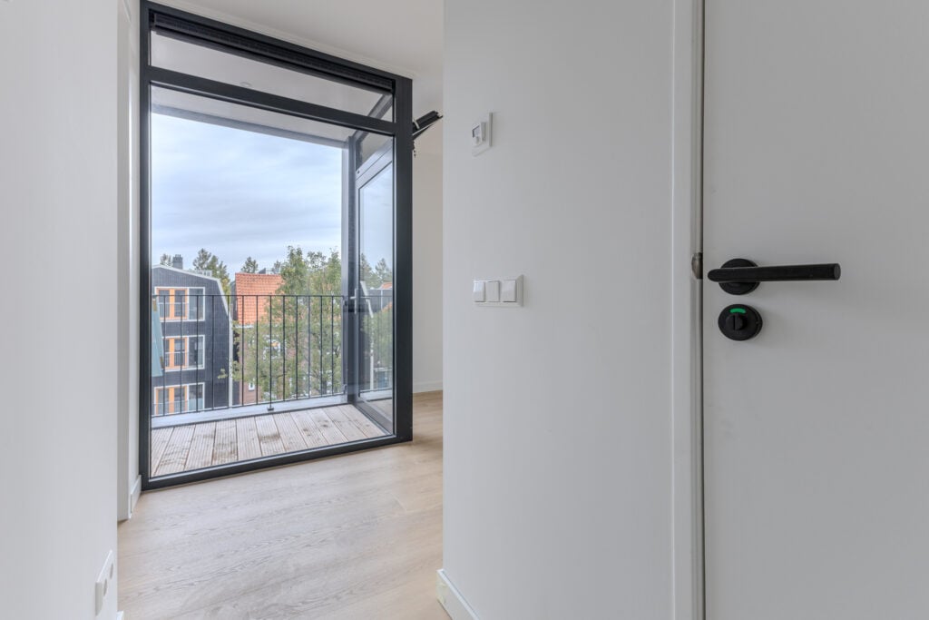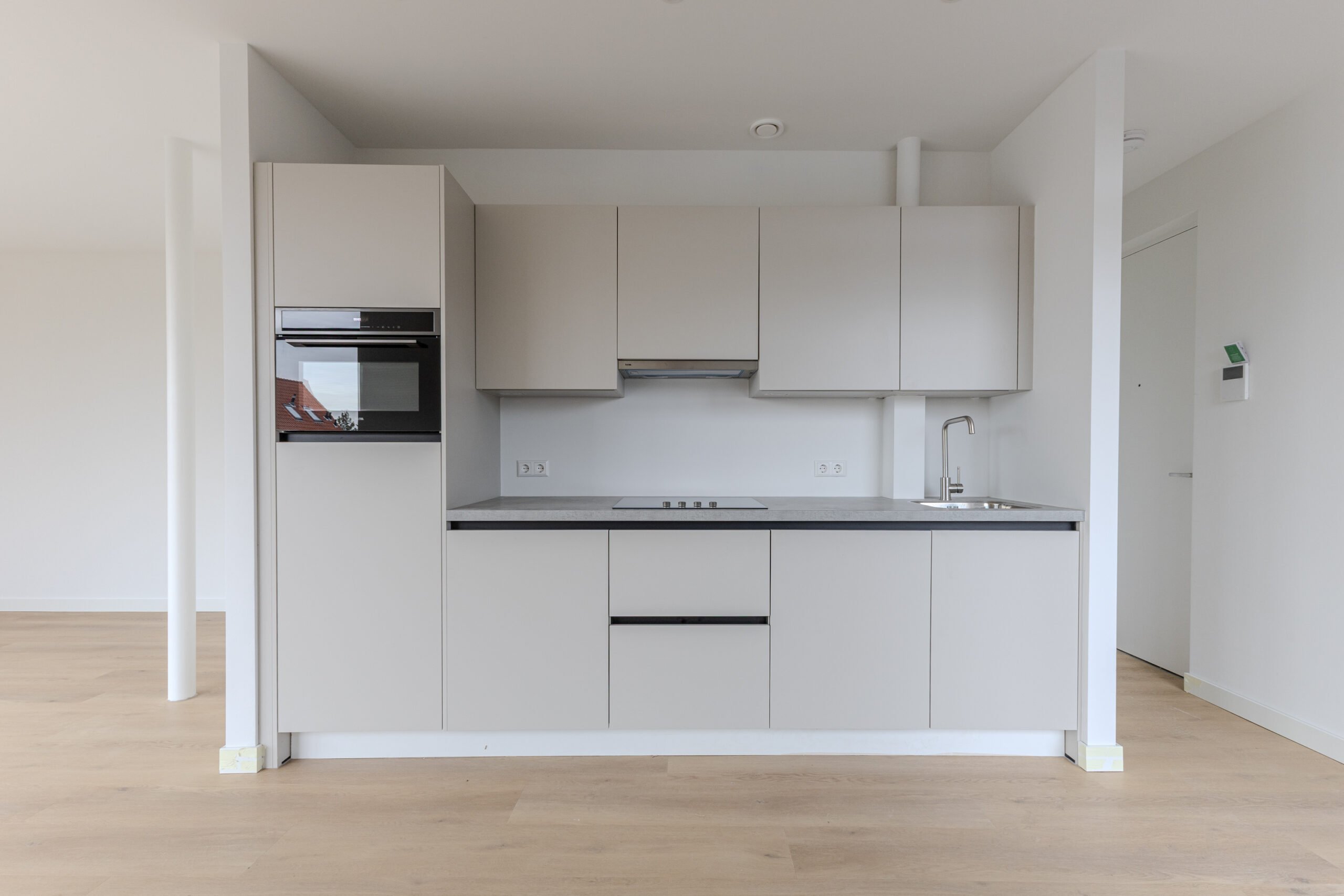 Aan de andere zijde van het appartement bevindt zich de verrassend ruime slaapkamer. Ook hier zorgen de grote raampartijen voor een fijne lichtinval en heb je direct zicht op je eigen balkon – een heerlijke plek om je dag ontspannen te beginnen of juist rustig af te sluiten. Er is meer dan genoeg ruimte voor een royaal tweepersoonsbed én een ruime kastenwand. De badkamer is een echte eyecatcher: zeer luxe en stijlvol afgewerkt met een ruime inloopdouche, een strak wastafelmeubel en een toilet. Deze badkamer geeft je elke dag een hotelachtige ervaring. Alles is splinternieuw, dus je kunt er zonder enige verbouwing zó in – instap klaar!