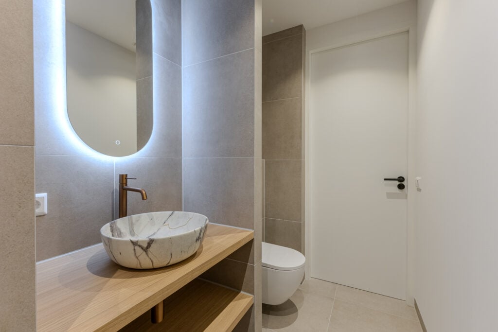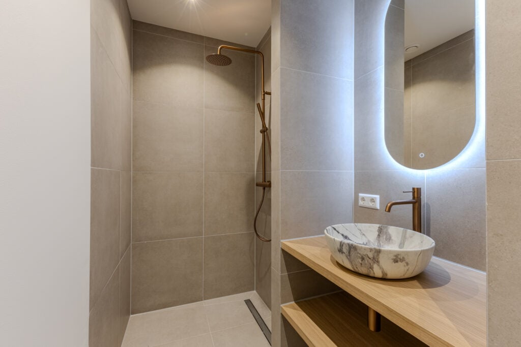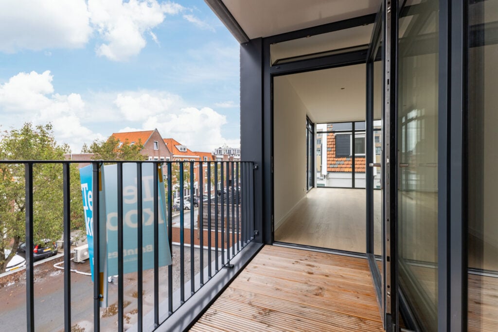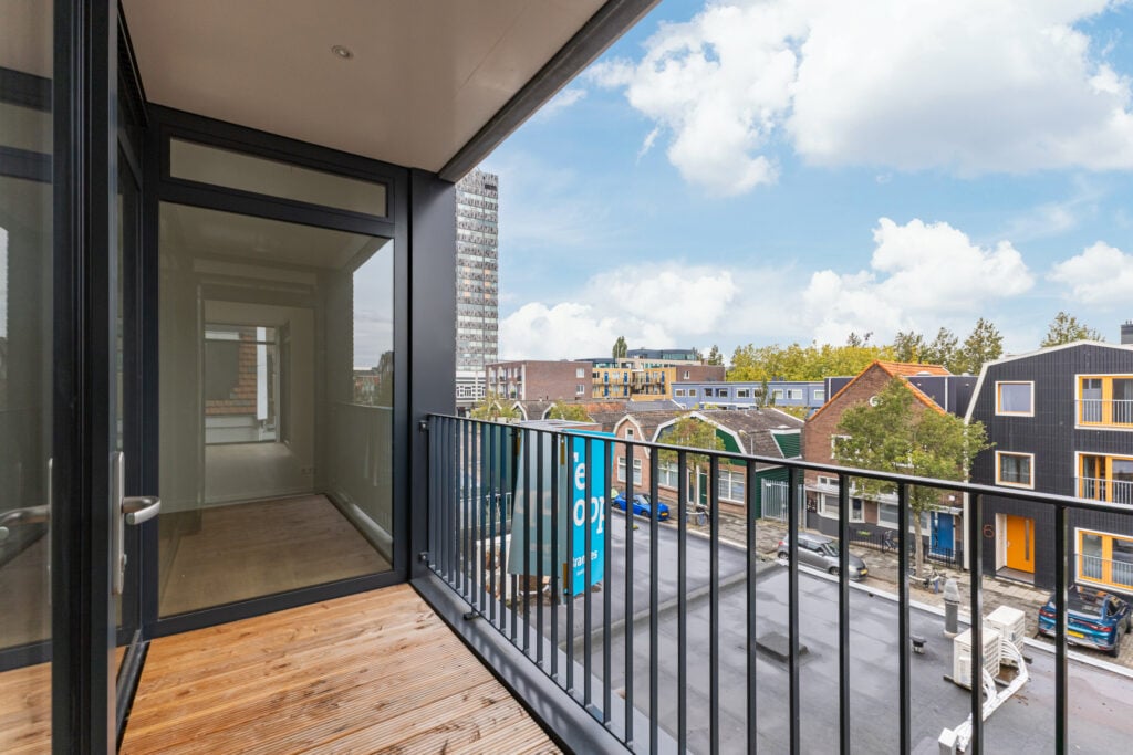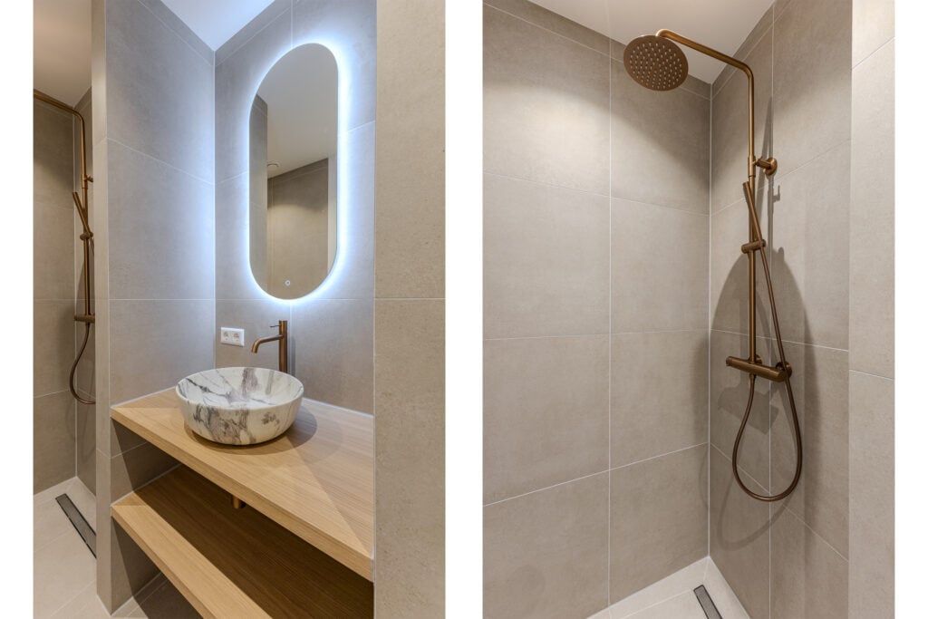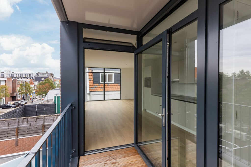 Aan de andere zijde van het appartement bevindt zich de verrassend ruime slaapkamer. Ook hier zorgen de grote raampartijen voor een fijne lichtinval en heb je direct zicht op je eigen balkon – een heerlijke plek om je dag ontspannen te beginnen of juist rustig af te sluiten. Er is meer dan genoeg ruimte voor een royaal tweepersoonsbed én een ruime kastenwand. De badkamer is een echte eyecatcher: zeer luxe en stijlvol afgewerkt met een ruime inloopdouche, een strak wastafelmeubel en een toilet. Deze badkamer geeft je elke dag een hotelachtige ervaring. Alles is splinternieuw, dus je kunt er zonder enige verbouwing zó in – instap klaar!