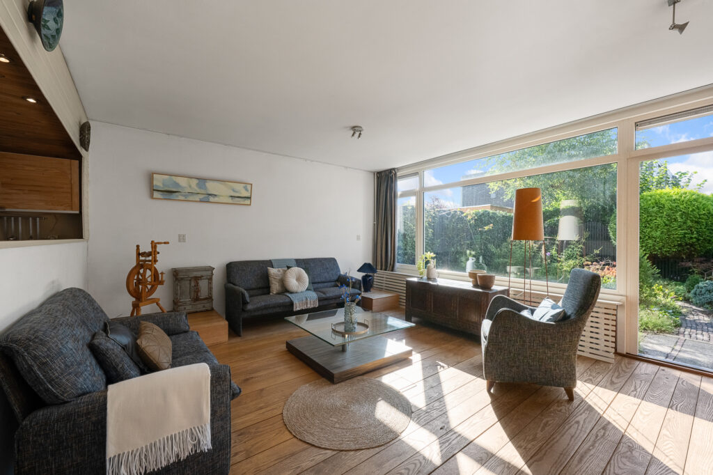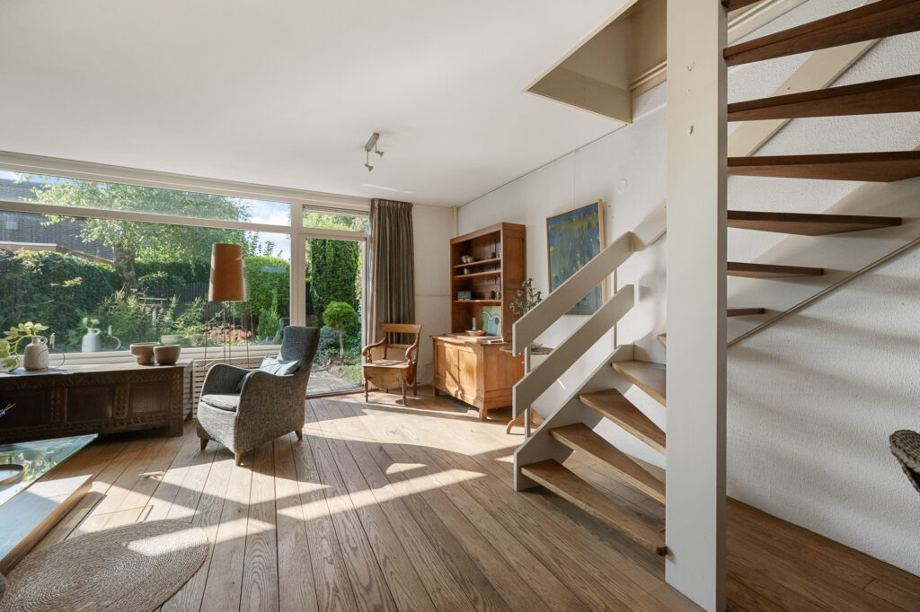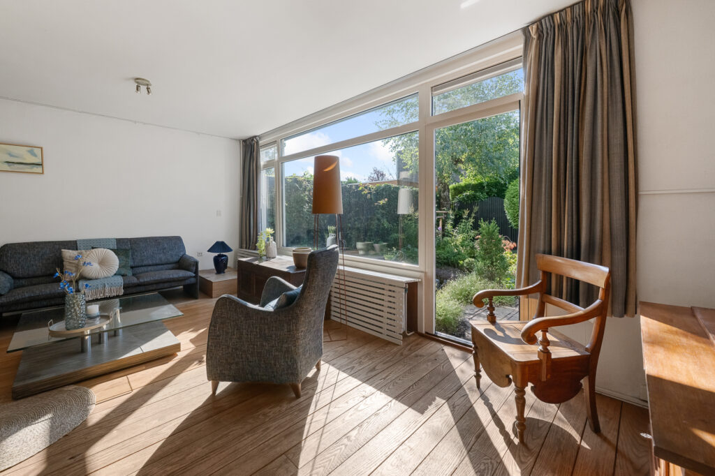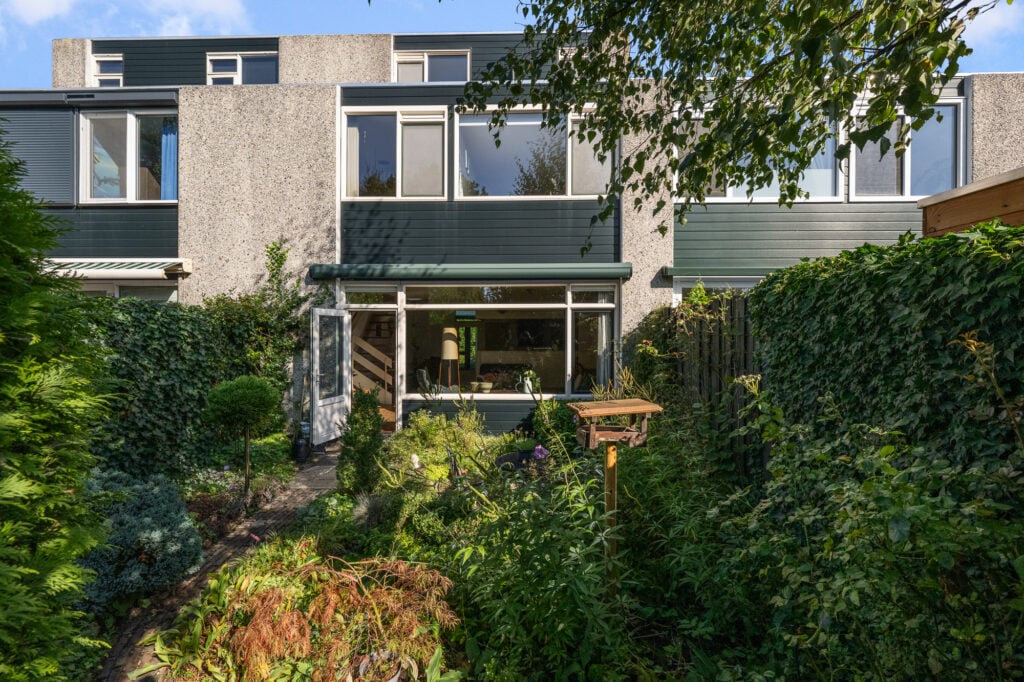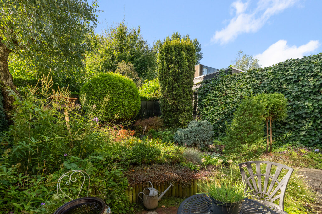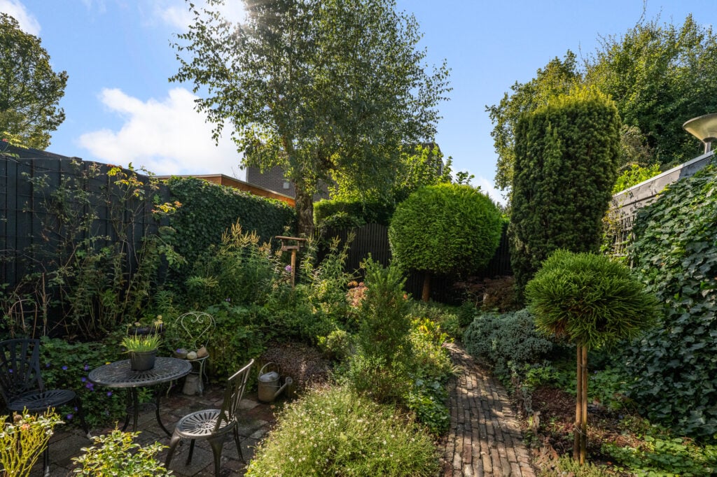 Buiten wacht de zonnige achtertuin, gunstig gelegen op het zuiden. De tuin is groen en speels aangelegd en biedt ruimte genoeg voor zowel een grote eettafel als een comfortabele loungehoek. Dankzij de gunstige ligging geniet je hier vrijwel de hele dag van de zon – ideaal voor lange zomerdagen met een barbecue, spelende kinderen of gewoon heerlijk ontspannen met een boek.