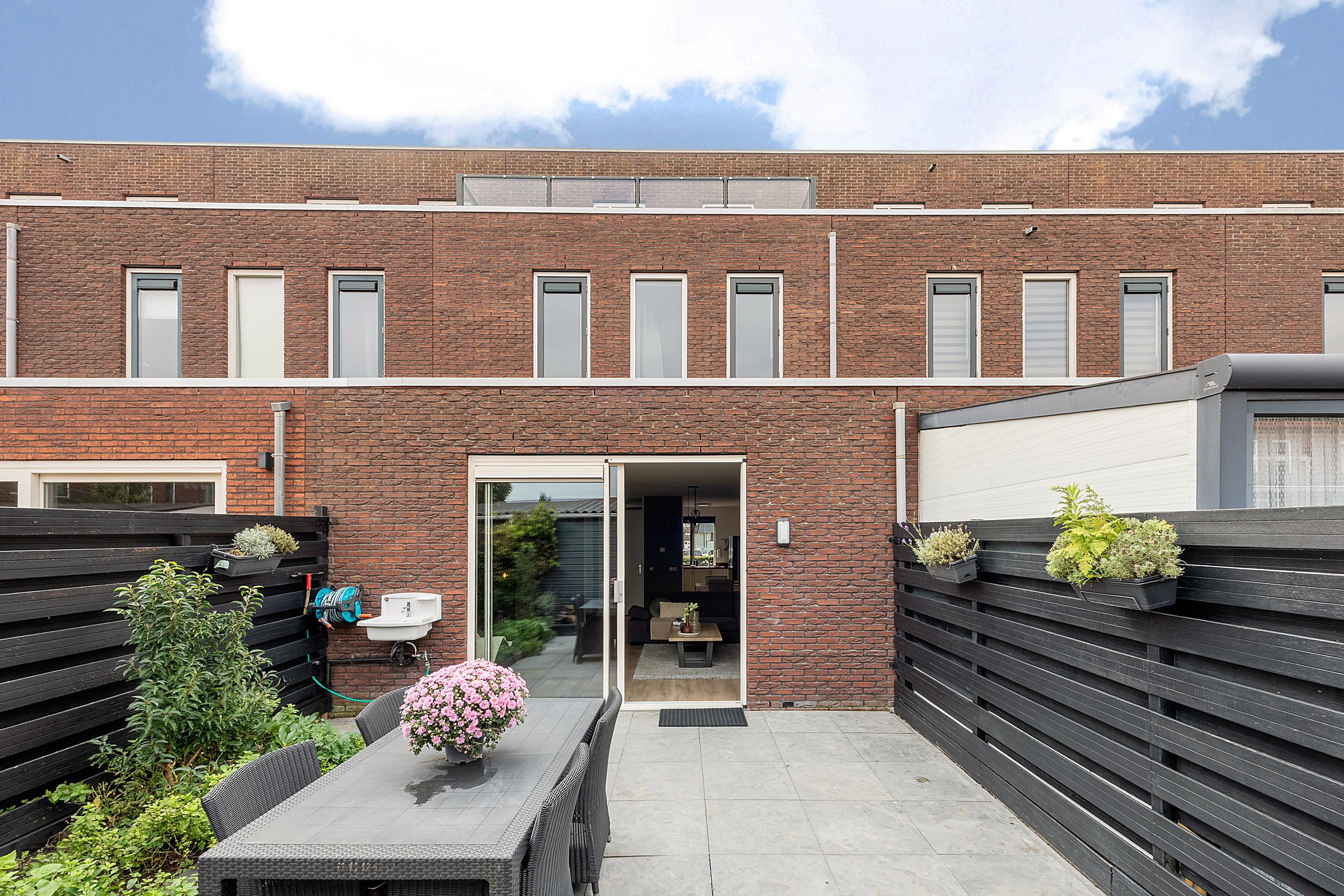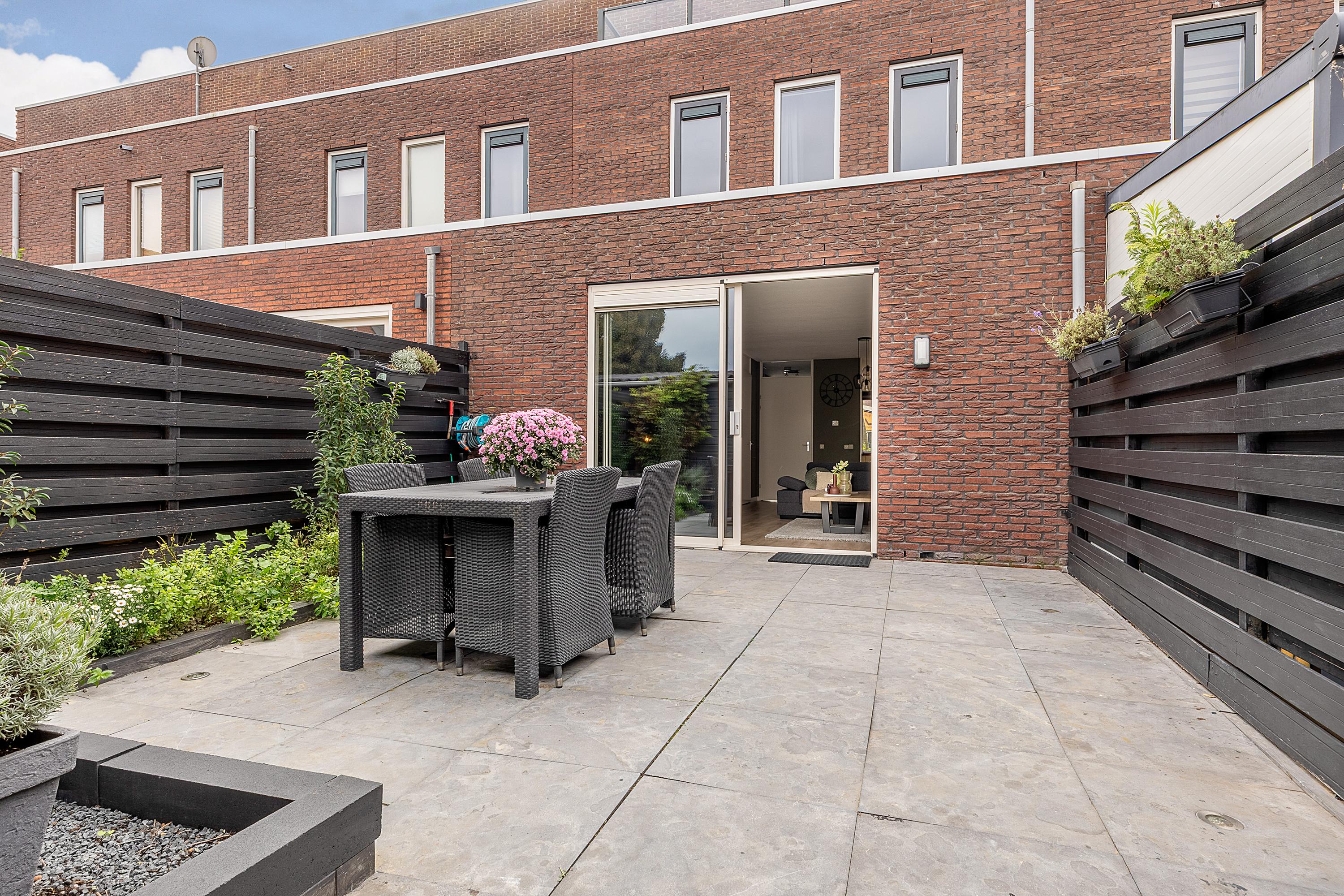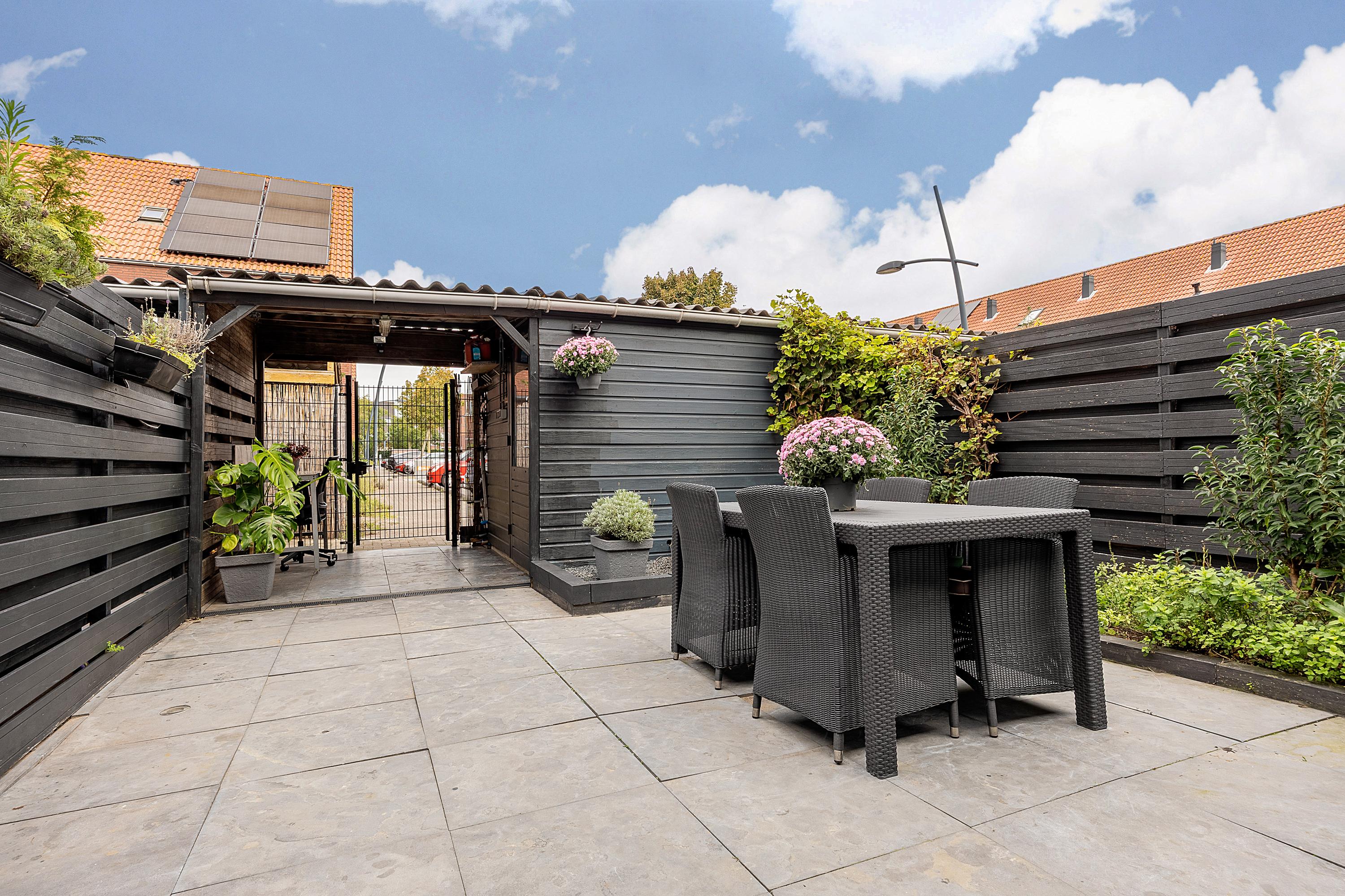 Via de schuifpui stap je de onderhoudsvrije achtertuin in. Deze tuin beschikt over een eigen achterom, een overkapping en een vrijstaande houten berging. In de tuintegels zijn sfeervolle spotjes geïntegreerd, die ’s avonds voor een extra warme ambiance zorgen.