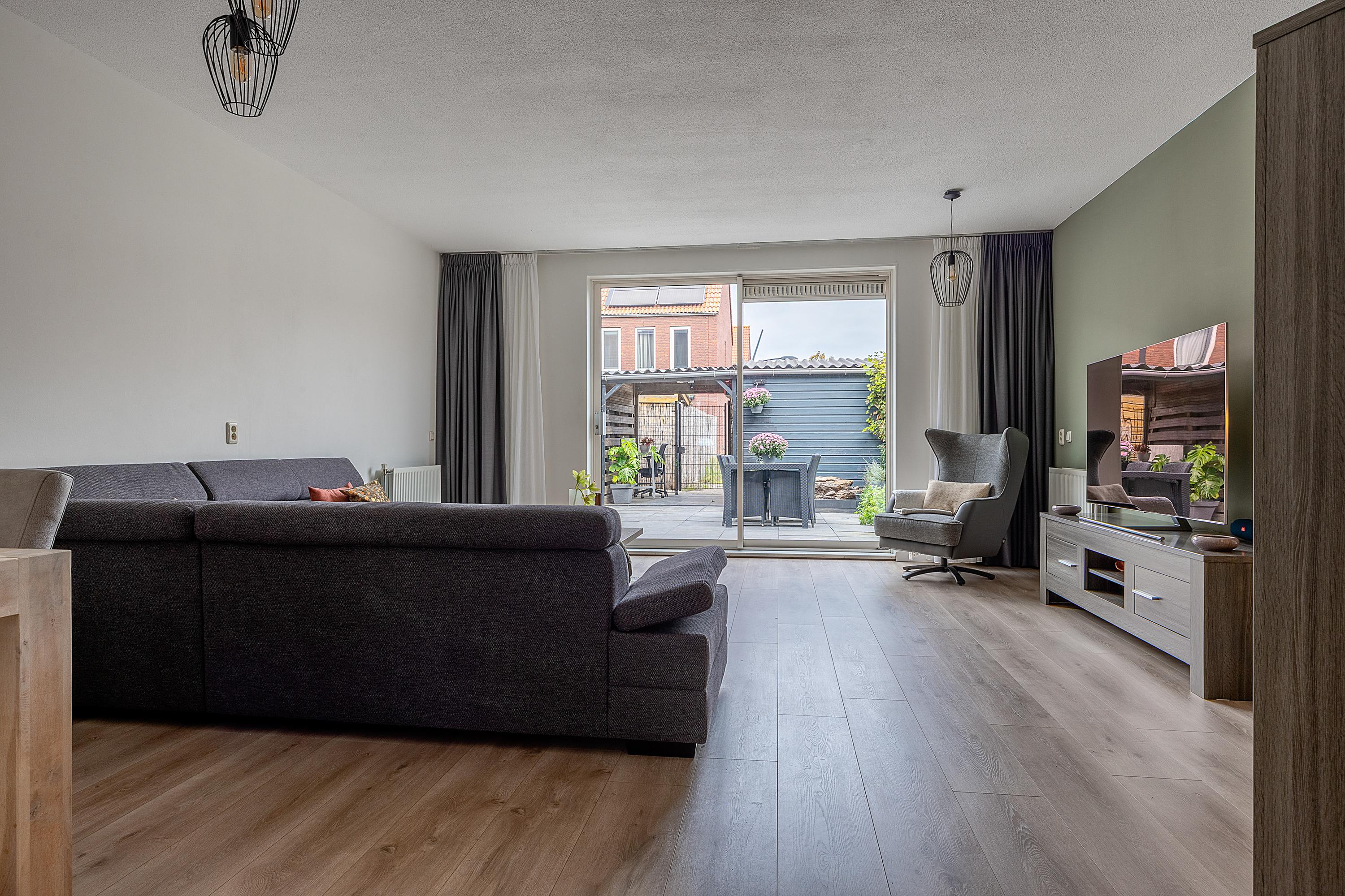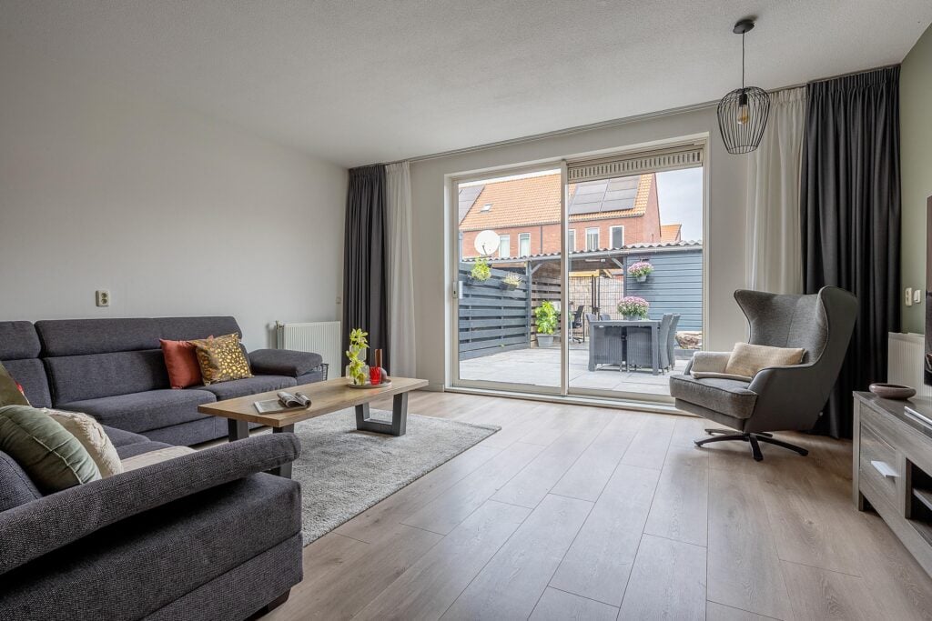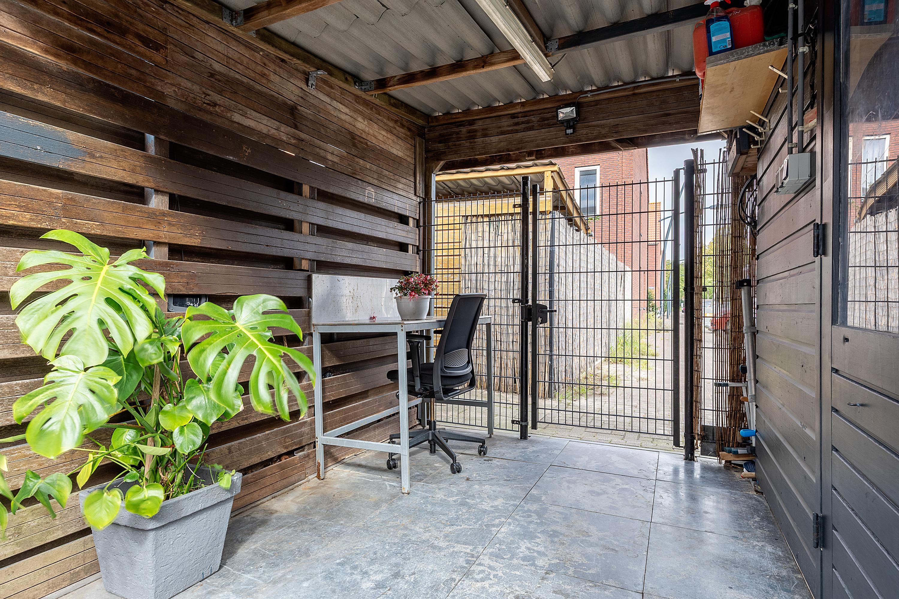 Via de schuifpui stap je de onderhoudsvrije achtertuin in. Deze tuin beschikt over een eigen achterom, een overkapping en een vrijstaande houten berging. In de tuintegels zijn sfeervolle spotjes geïntegreerd, die ’s avonds voor een extra warme ambiance zorgen.