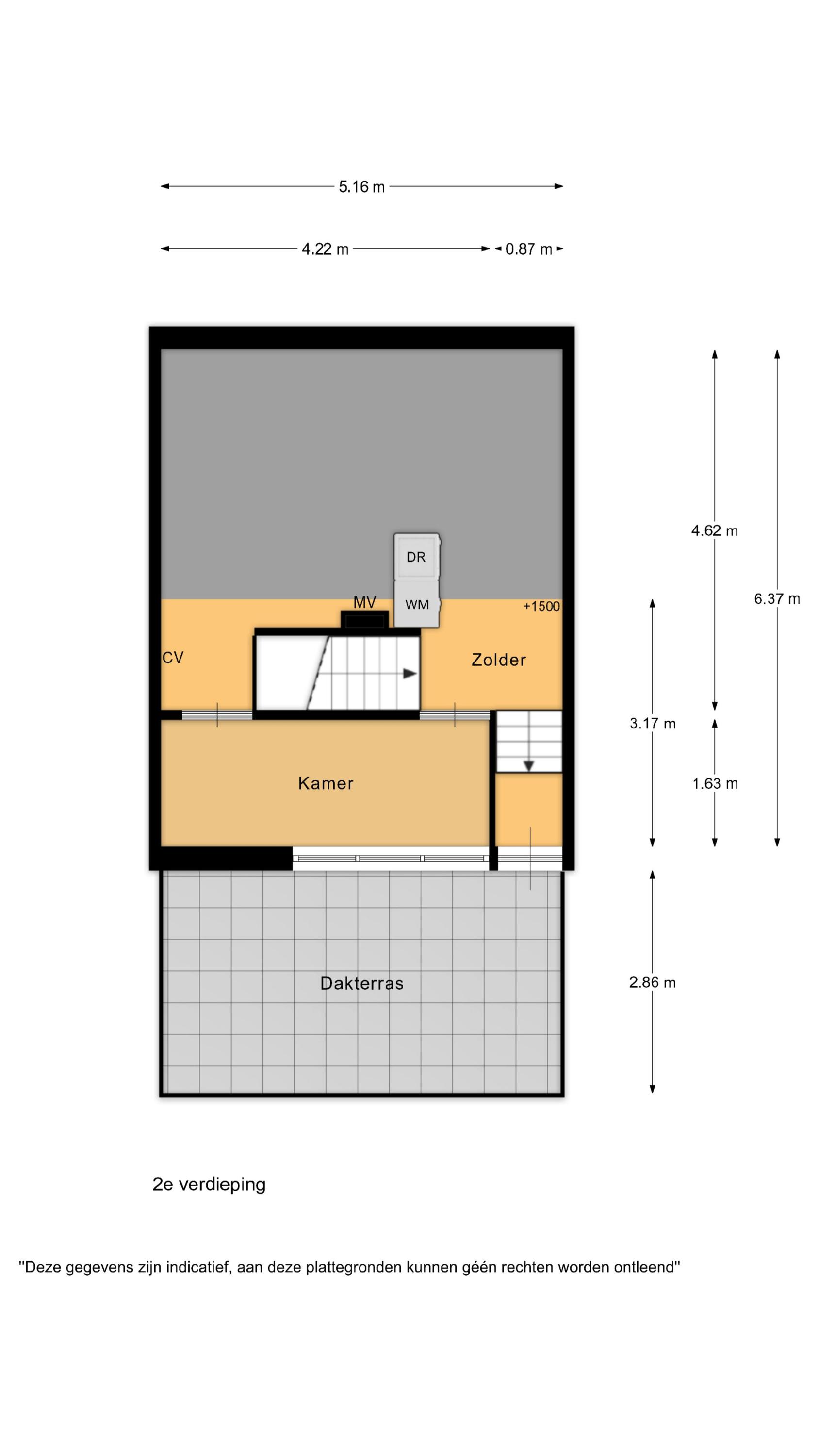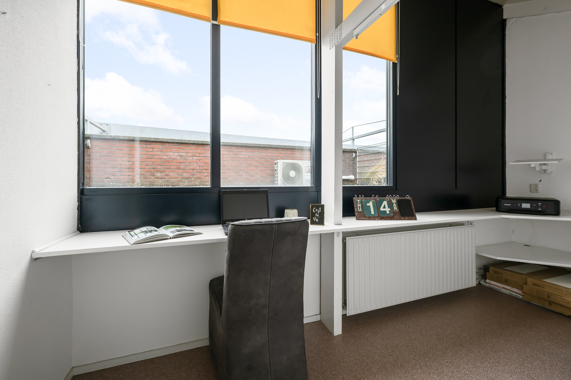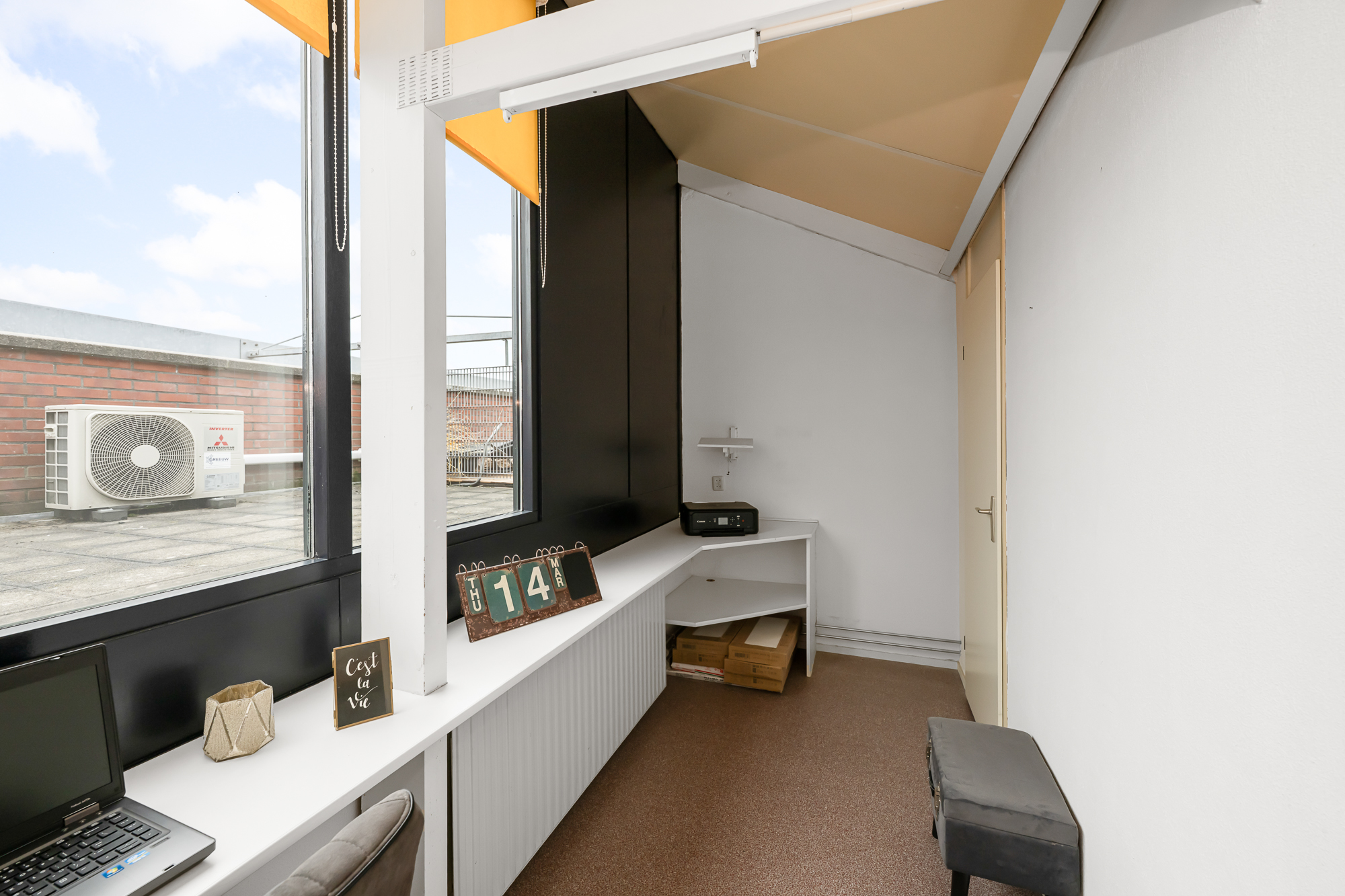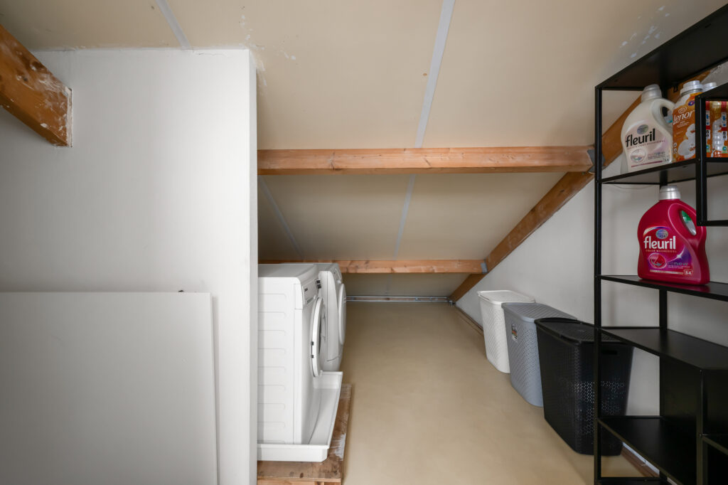 De tweede en tevens bovenste verdieping biedt nog een extra kamer, ideaal als kantoor, hobbyruimte of logeerkamer. Vanuit hier heb je toegang tot het zonnige dakterras op het zuiden – een heerlijke plek om in alle rust van de zon te genieten. Tevens vind je hier praktische bergruimte met aansluitingen voor wasmachine en droger.