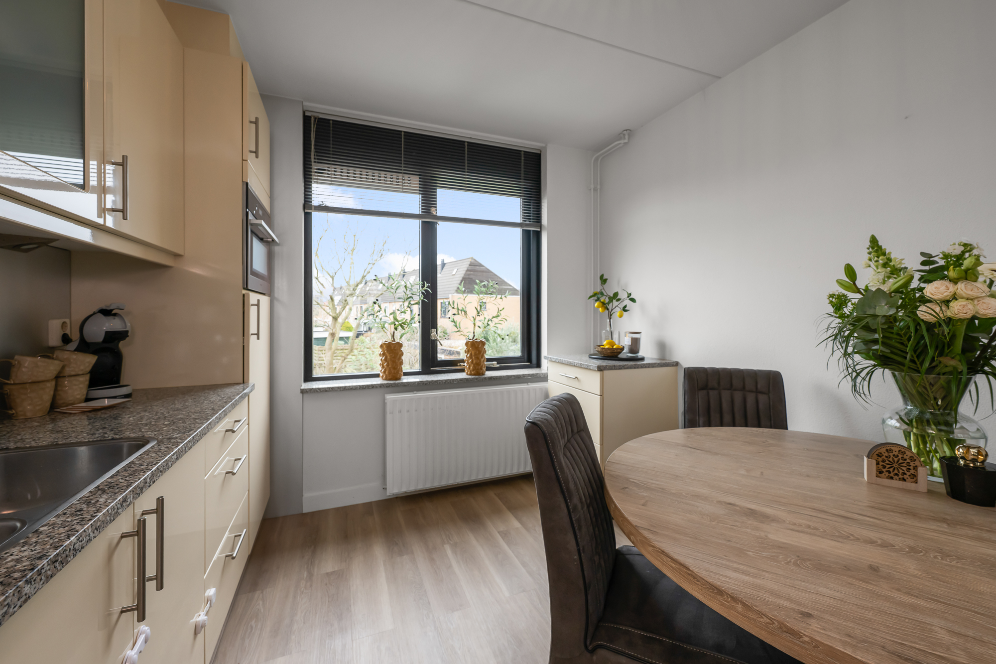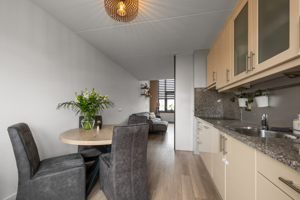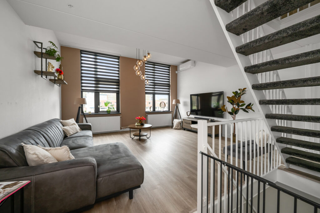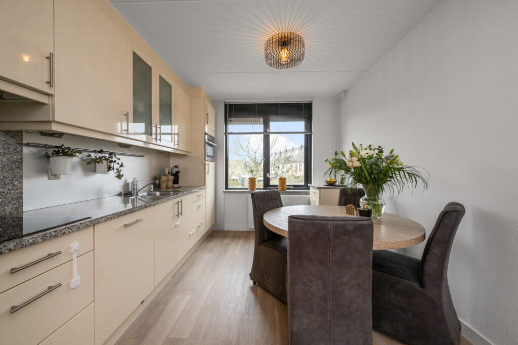 Op de eerste verdieping ervaar je direct de charme die deze woning zo uniek maakt. De royale woonkamer en keuken worden gekenmerkt door hoge raampartijen en een prachtige lichtinval, geïnspireerd op de klassieke Amsterdamse grachtenpanden. De woning is begin jaren ’90 ontworpen door de gerenommeerde architect Liesbeth van der Pol, wat duidelijk terug te zien is in de speelse indeling, de plafondhoogte en de ruimtelijke beleving. Vanuit de woonkamer heb je bovendien een vrij uitzicht over de wijk en het water, wat het gevoel van ruimte en rust versterkt. De woonkamer is ruim opgezet en voorzien van airconditioning voor extra comfort. Aan de voorzijde bevindt zich de keuken, uitgerust met een inductiekookplaat, vaatwasser (2025), combi-oven en koelkast (2020). Op deze verdieping is tevens nog een extra slaapkamer aanwezig.