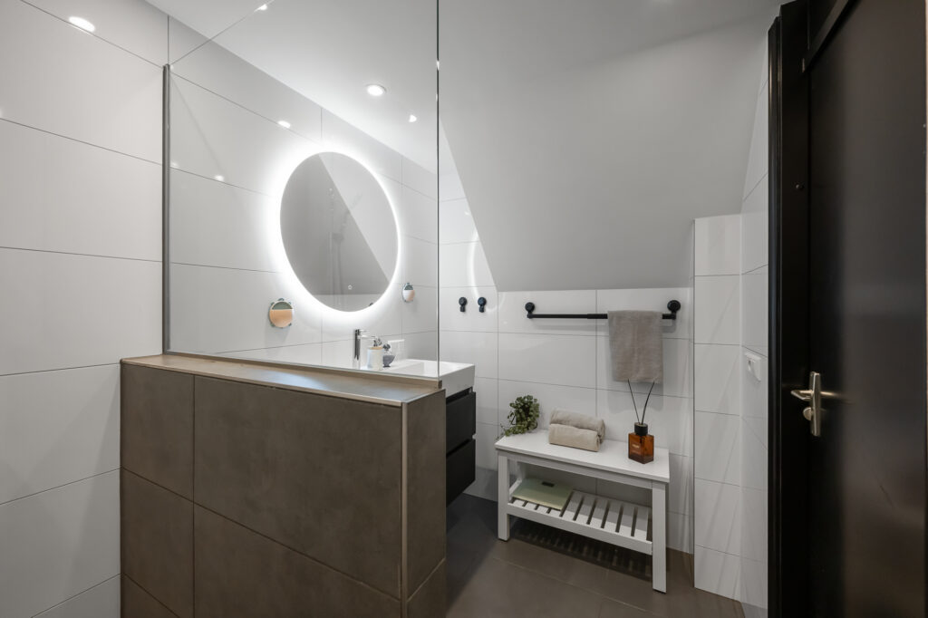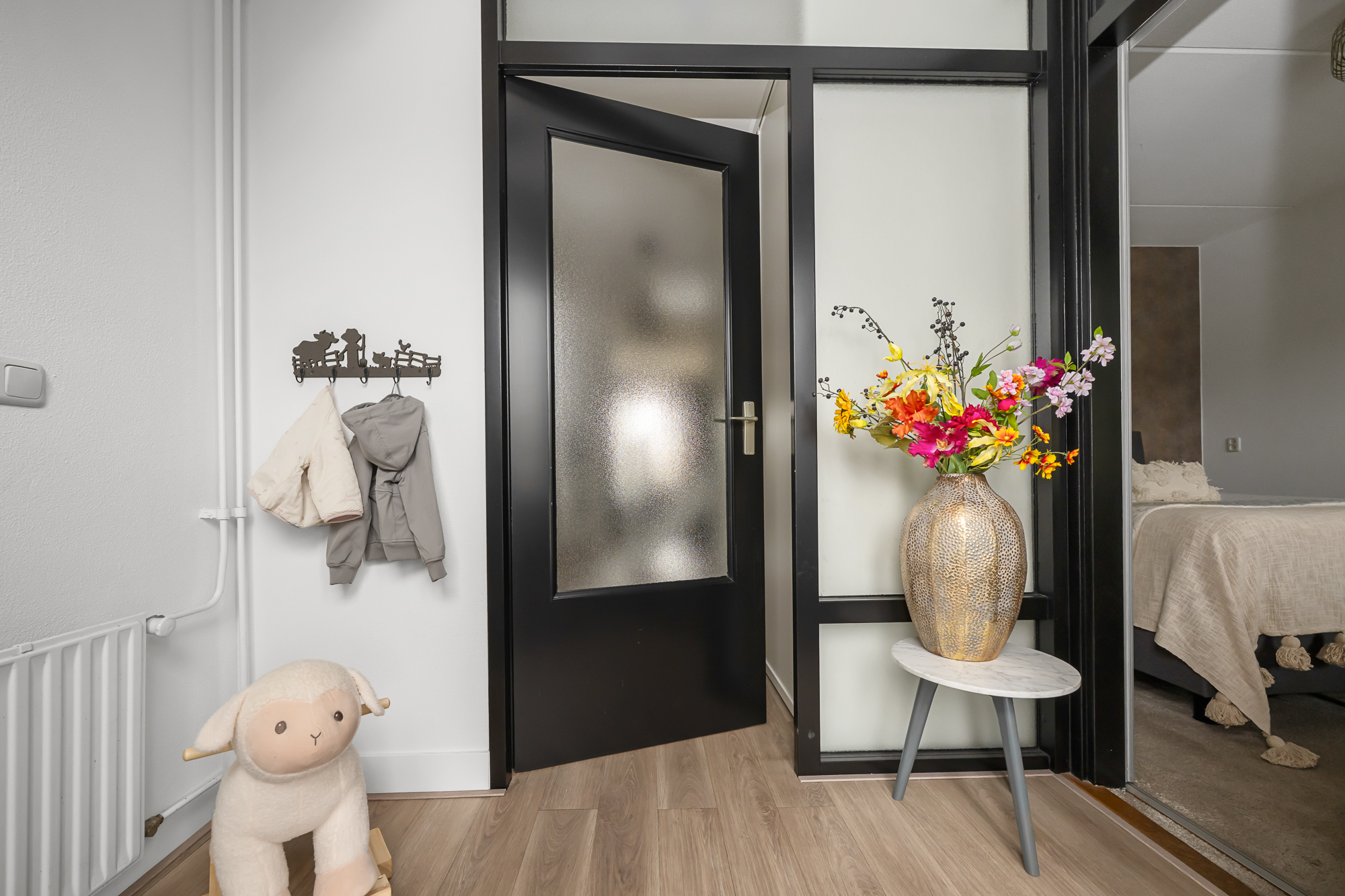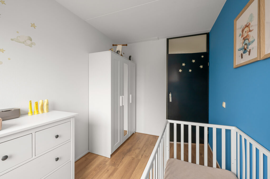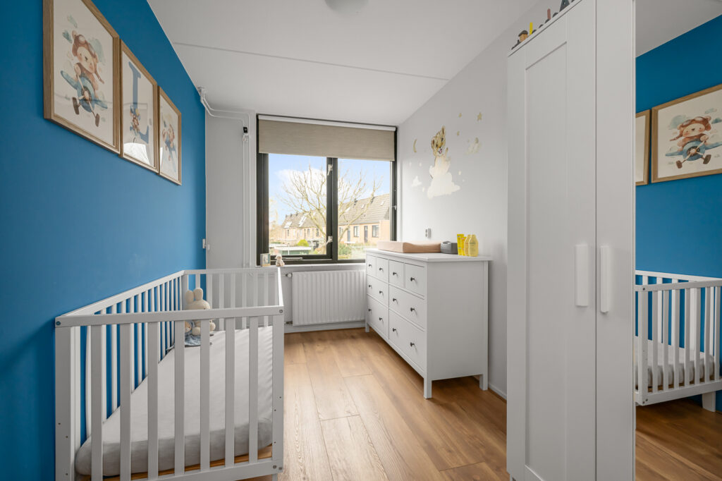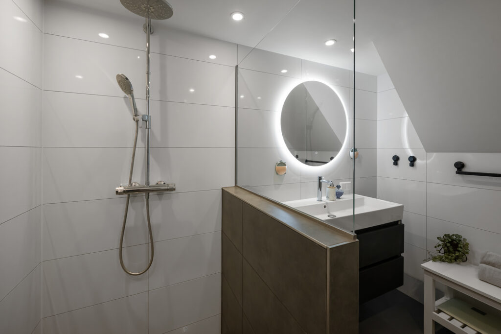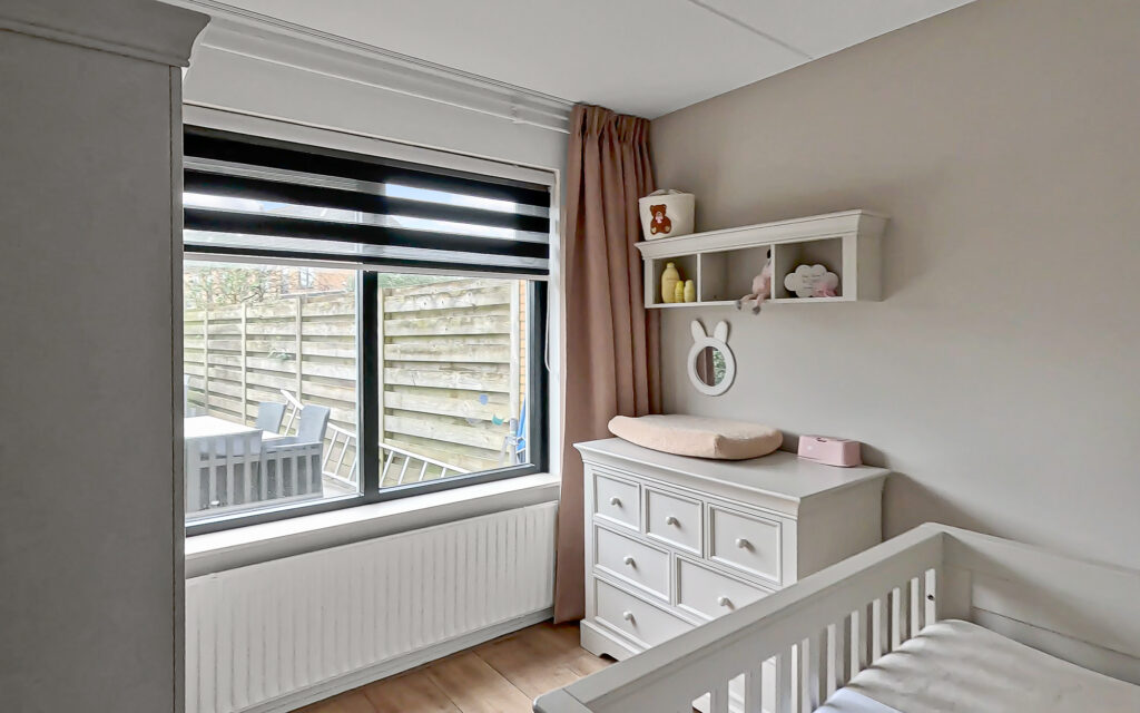 Via de voortuin bereiken we de woning, waar de bijzonderheid direct op de begane grond begint. Hier vind je twee volwaardige slaapkamers en een extra kamer die perfect is als werkruimte, babykamer of inloopkast – een indeling die direct onderstreept dat dit geen standaard woning is. Op deze verdieping bevindt zich tevens de in 2024 vernieuwde badkamer, stijlvol afgewerkt en voorzien van een fraaie inloopdouche en wastafel. Het toilet is separaat, wat zorgt voor extra comfort.