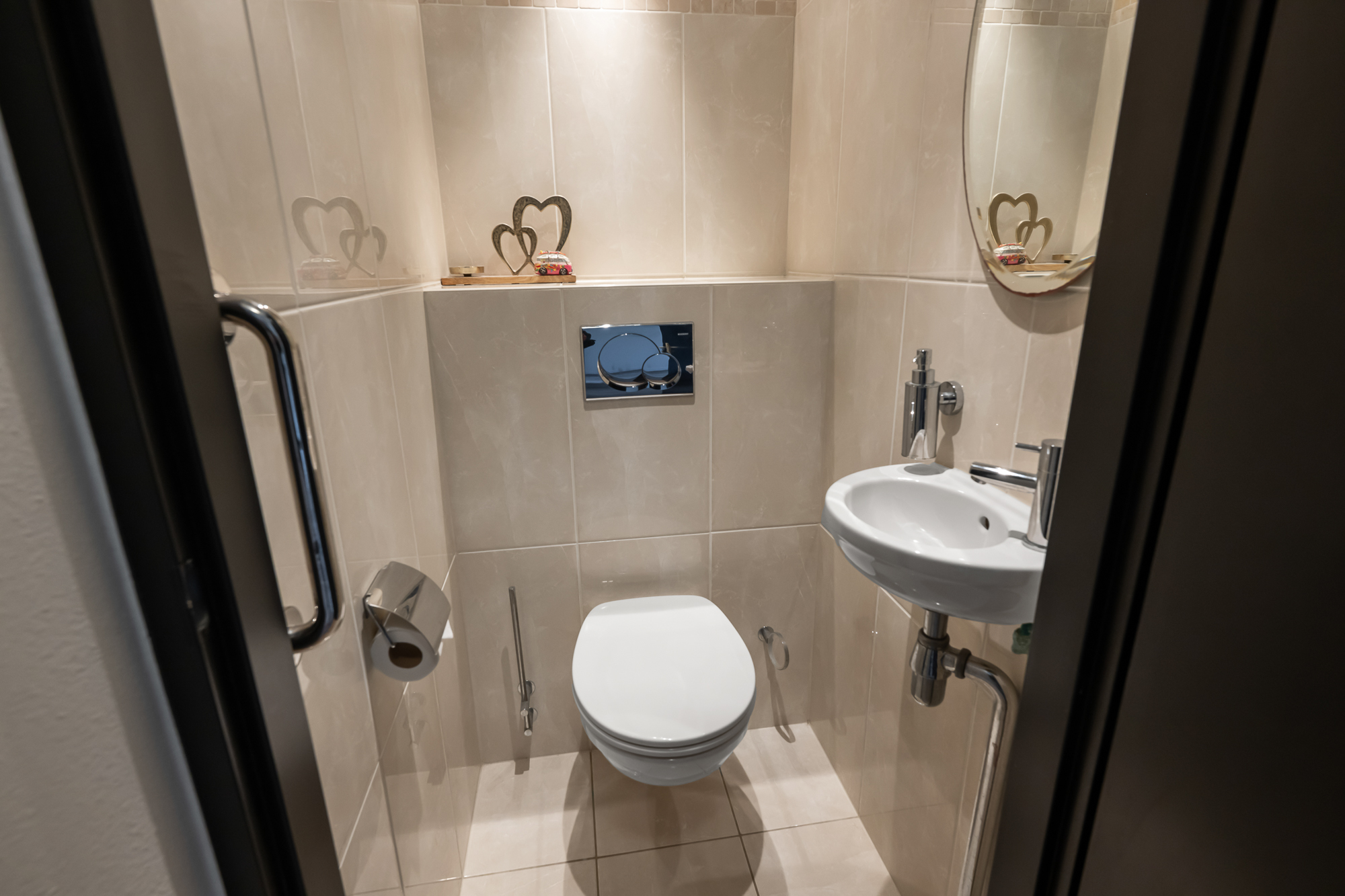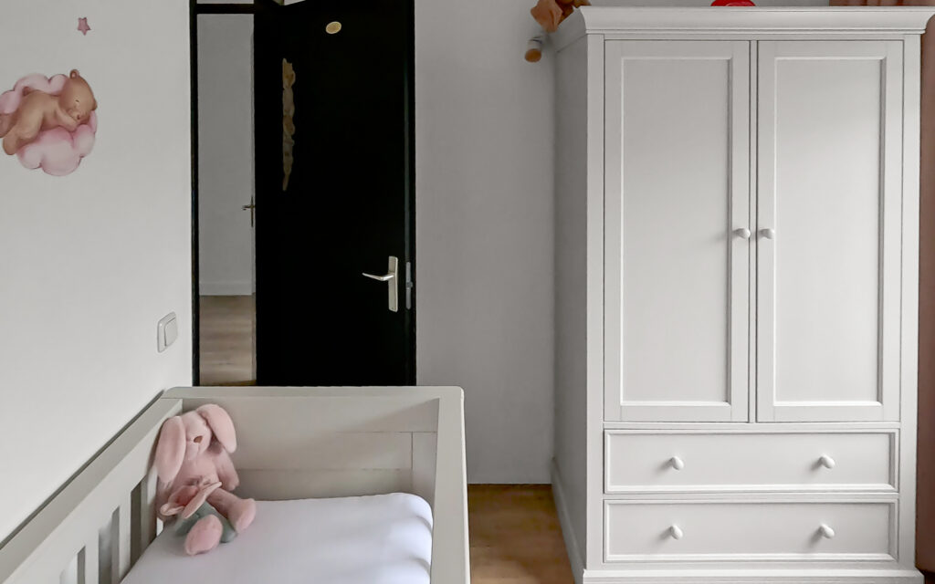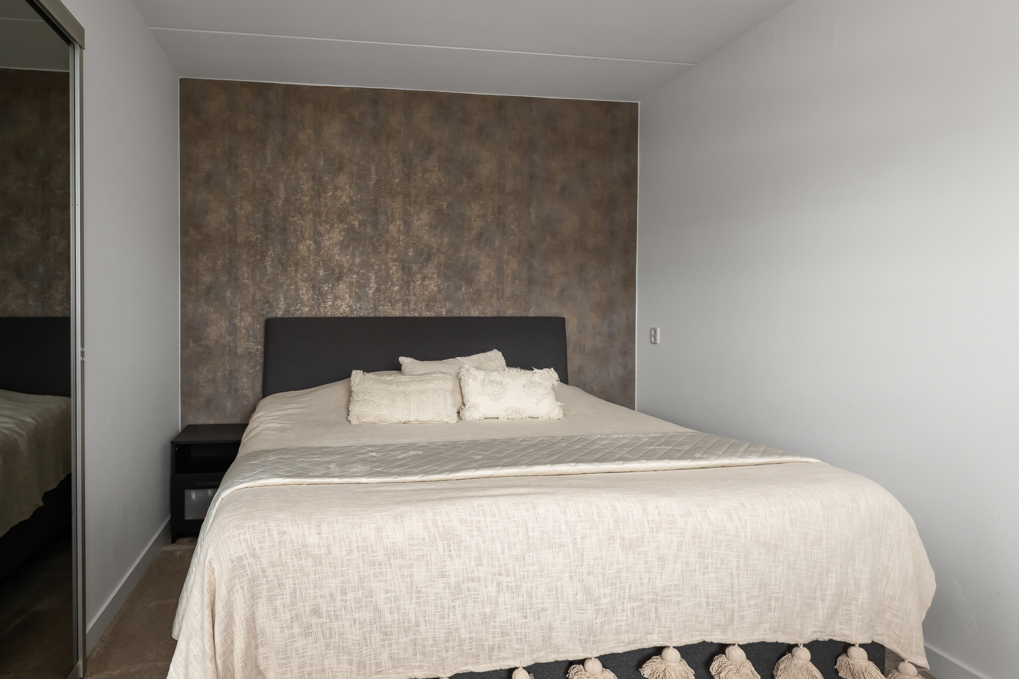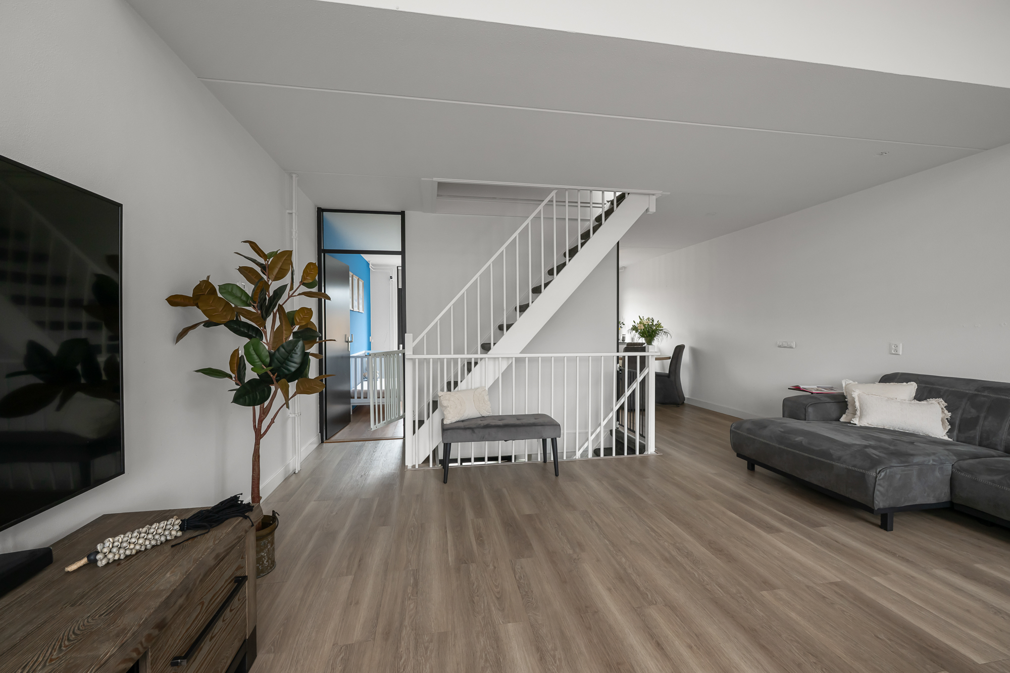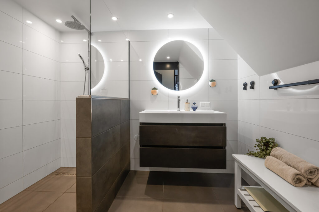 Via de voortuin bereiken we de woning, waar de bijzonderheid direct op de begane grond begint. Hier vind je twee volwaardige slaapkamers en een extra kamer die perfect is als werkruimte, babykamer of inloopkast – een indeling die direct onderstreept dat dit geen standaard woning is. Op deze verdieping bevindt zich tevens de in 2024 vernieuwde badkamer, stijlvol afgewerkt en voorzien van een fraaie inloopdouche en wastafel. Het toilet is separaat, wat zorgt voor extra comfort.