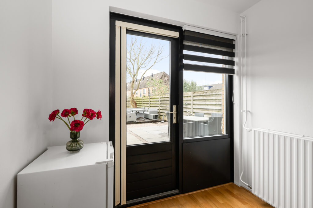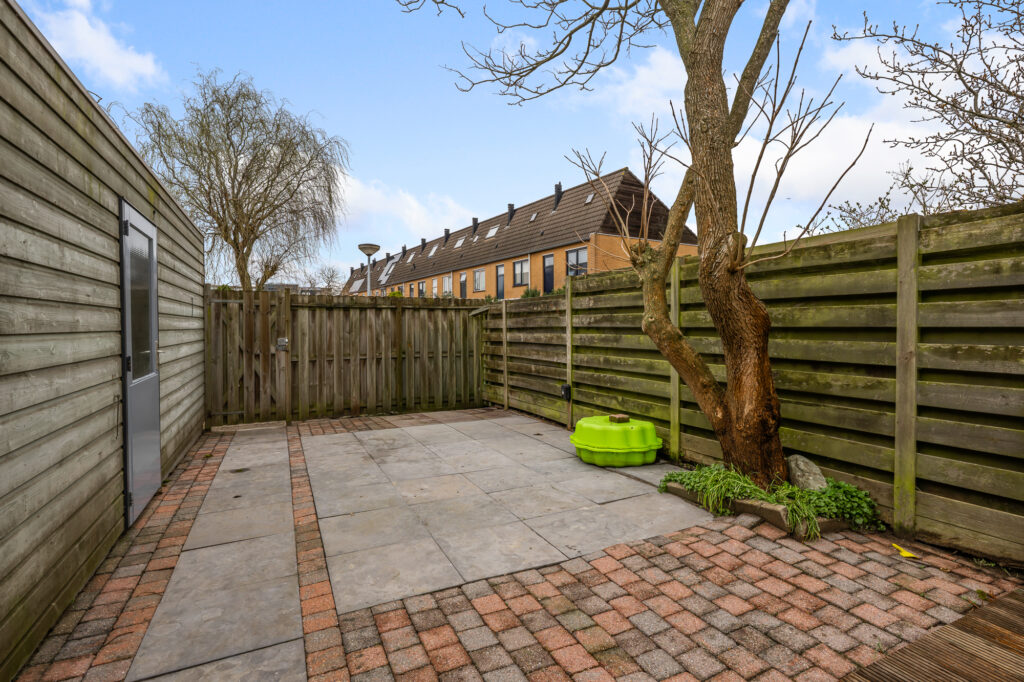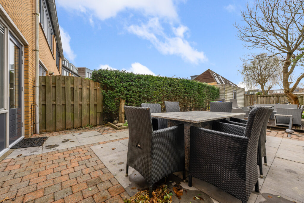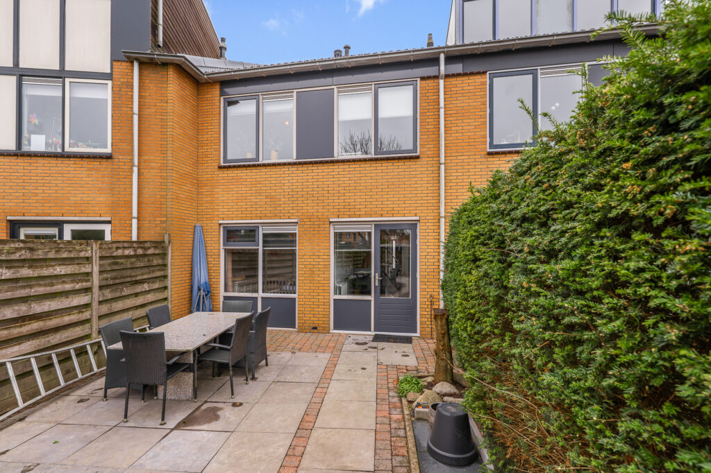 De achtertuin is een absolute eyecatcher. Met een diepte van circa 17,5 meter is dit een uitzonderlijk ruime tuin waar je op elk moment van de dag van zon of schaduw kunt genieten. Achterin bevindt zich een extra berging, ideaal voor fietsen en gereedschap. De tuin is bovendien via de achterzijde bereikbaar. Aan de voorzijde beschikt de woning over een charmant voortuintje.