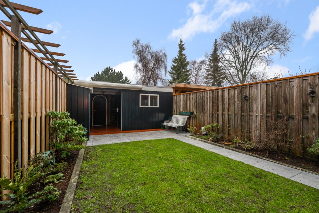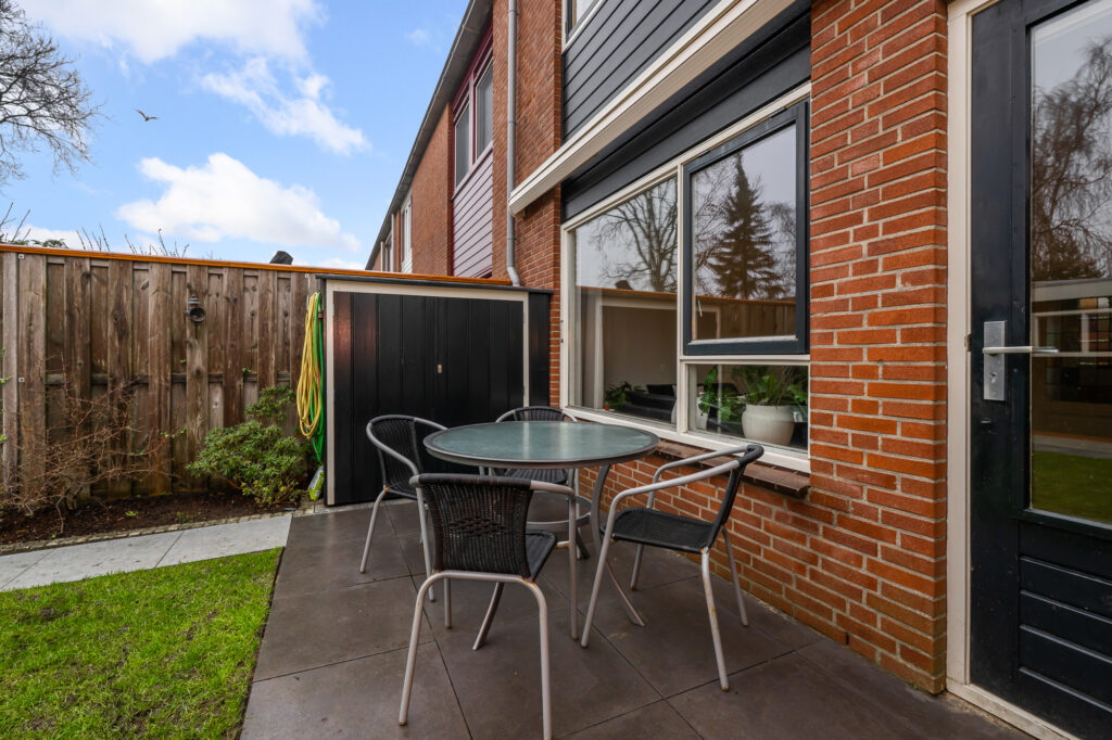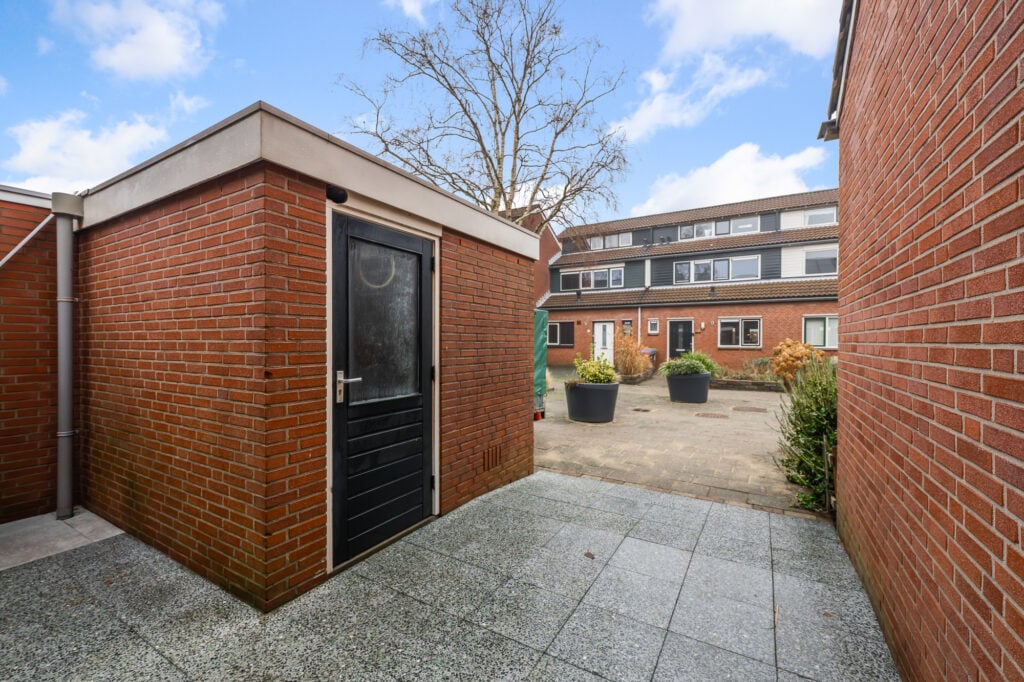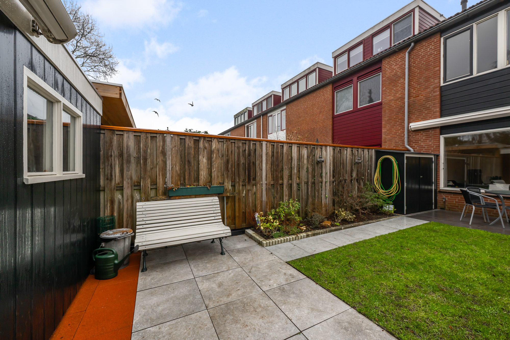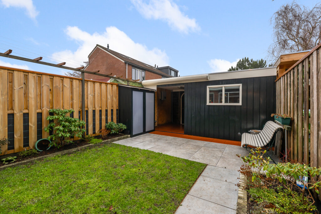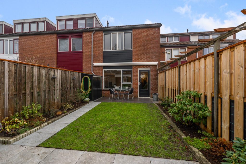 Vanuit de woonkamer heb je toegang tot de prachtige achtertuin, die netjes is aangelegd met een grasmat, mooie sierplanten en een strak en stevig tuinpad van grote terrastegels. De tuin is gelegen op het noordwesten. Doordat er geen direct achtergelegen bebouwing is en er in 2025 een nieuwe schutting is geplaatst, geniet je hier tot in de avonduren van de zon én van een vrij en open gevoel zonder inkijk van achterburen. In de tuin bevindt zich een houten berging met daarop zes zonnepanelen, ideaal voor de opslag van klusmaterialen en tuingereedschap. Daarnaast beschikt de woning over een gemetselde (fiets)berging aan de voorzijde, wat zorgt voor extra praktische bergruimte.