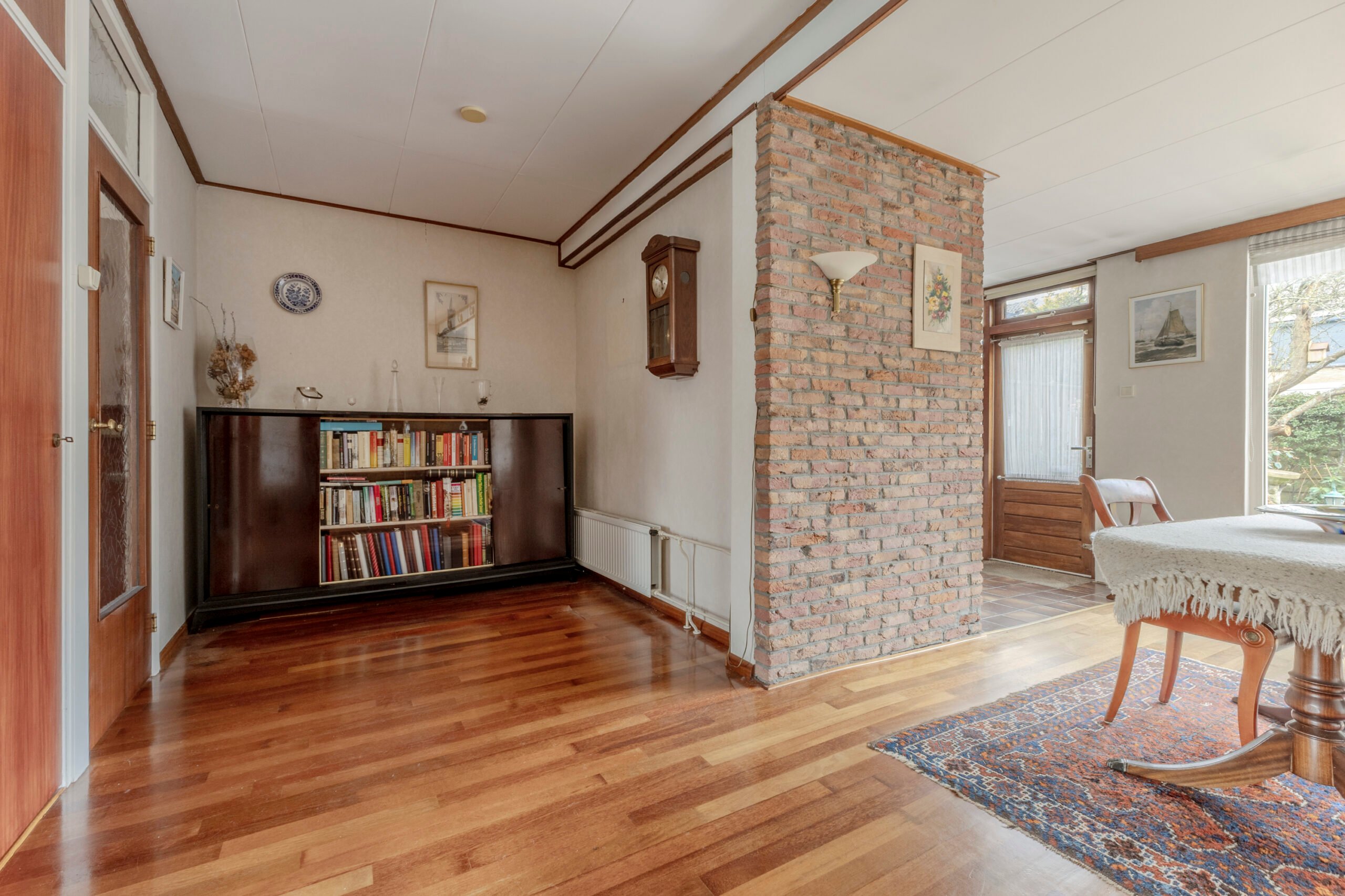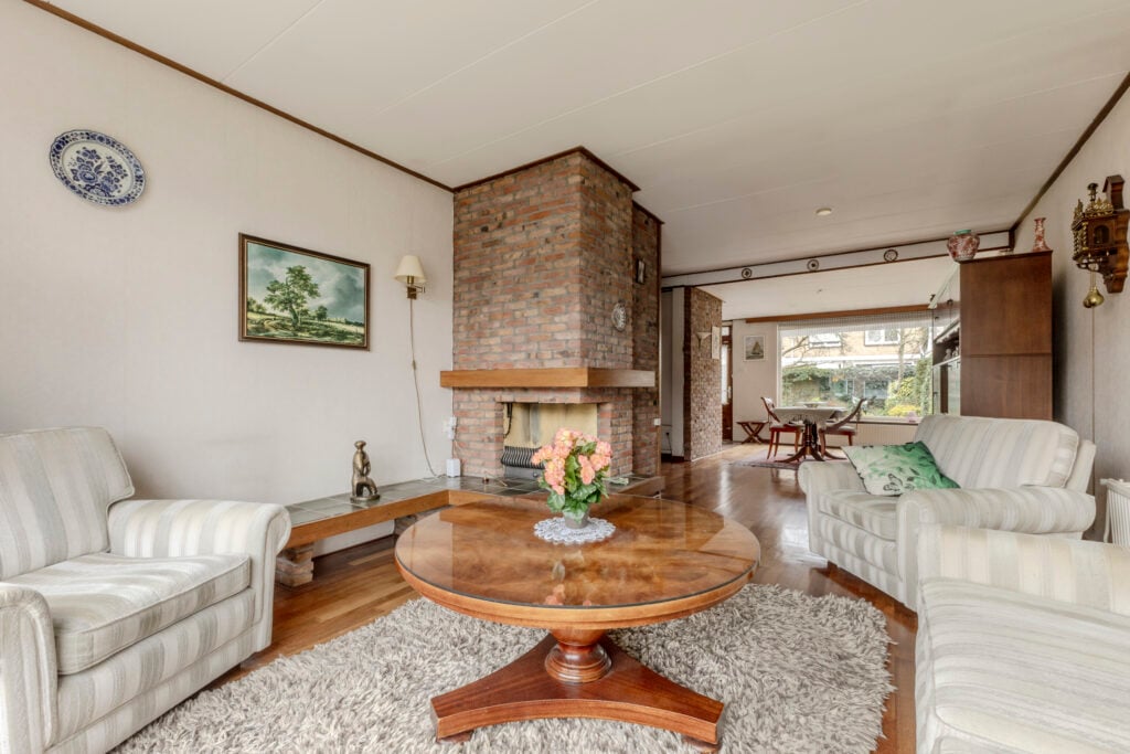 Via de voordeur stap je binnen in de hal, waar direct de degelijkheid van de woning voelbaar is. Vanuit hier bereik je de woonkamer: een aangename, lichte leefruimte die dankzij de uitbouw aan de achterzijde verrassend ruim aanvoelt. Grote ramen zorgen voor een prettige lichtinval en bieden zicht op de tuin, waardoor binnen en buiten mooi met elkaar verbonden zijn.