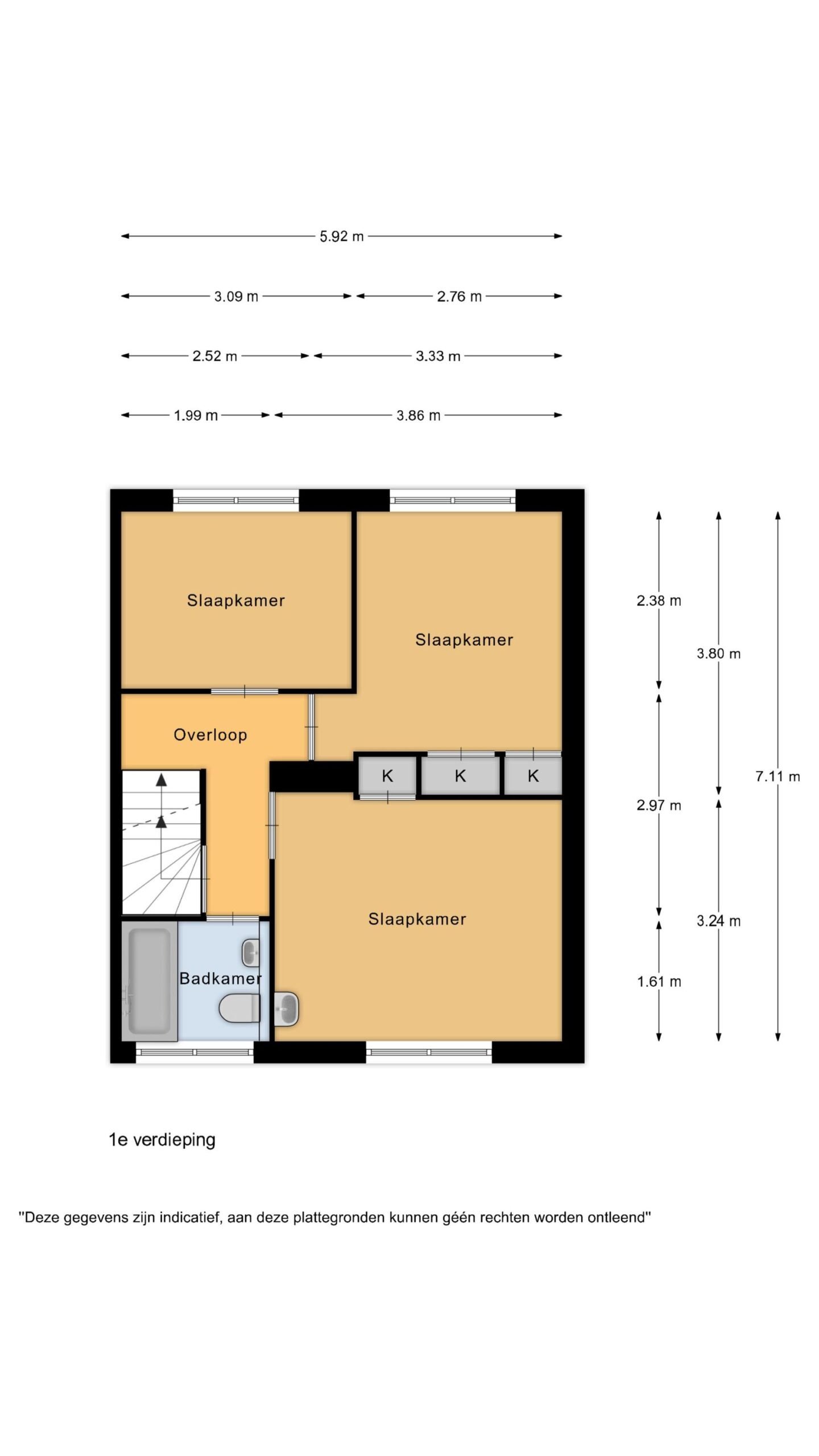 Op de eerste verdieping bevinden zich drie goed bemeten slaapkamers, die allemaal prettig van formaat zijn.
