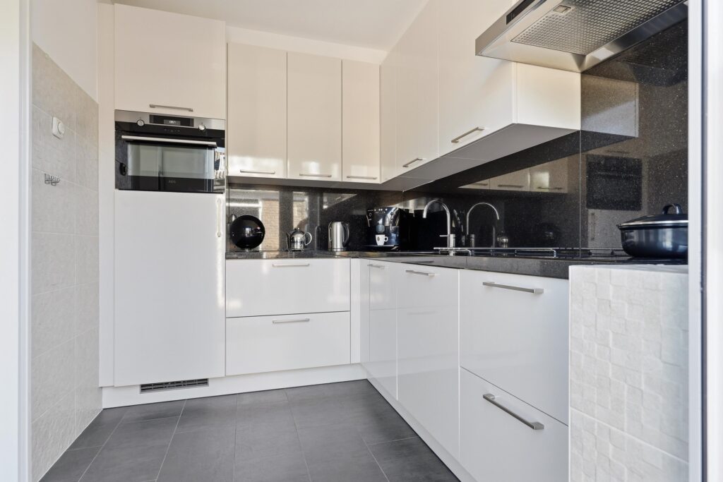 De aangrenzende halfopen keuken, volledig vernieuwd in 2018, is voorzien van een moderne inductiekookplaat en een combi-oven met magnetron. Hier wordt koken een waar genot, terwijl je tegelijkertijd kunt genieten van het overzichtelijke design en de praktische indeling.