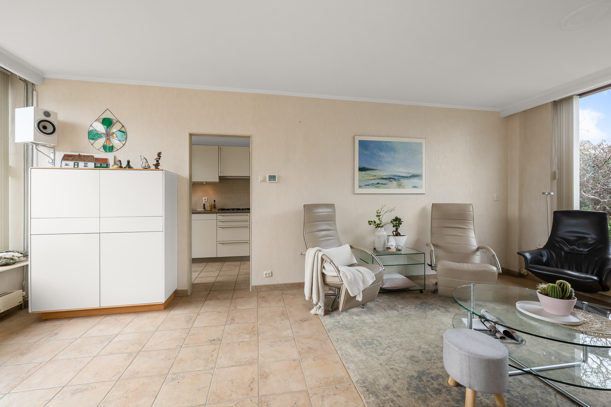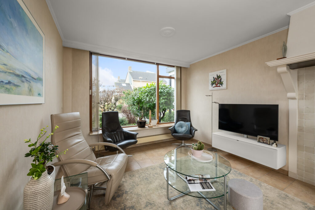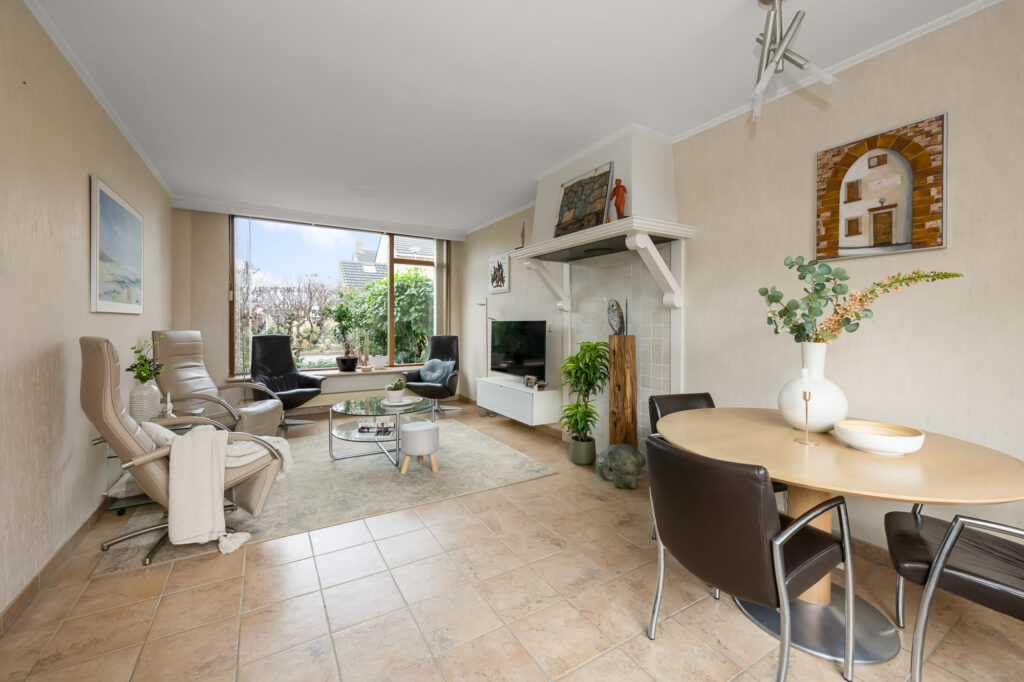 Via de voortuin bereik je de entree van de woning. In de hal bevinden zich het toilet en de trapopgang naar de eerste verdieping. De woonkamer is een aangename leefruimte met grote raampartijen aan zowel de voor- als achterzijde, waardoor het daglicht rijkelijk naar binnen valt en de ruimte prettig en open aanvoelt.