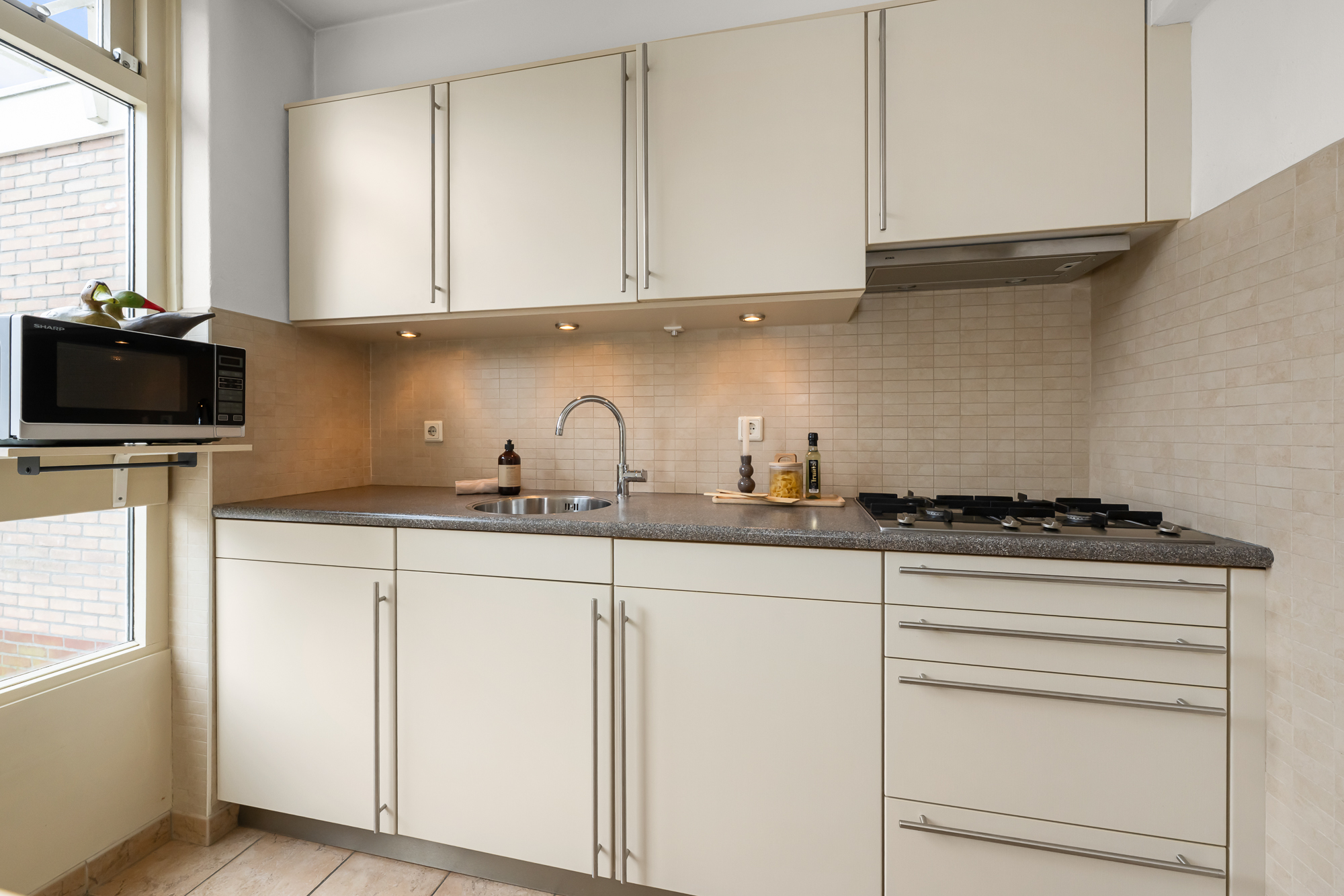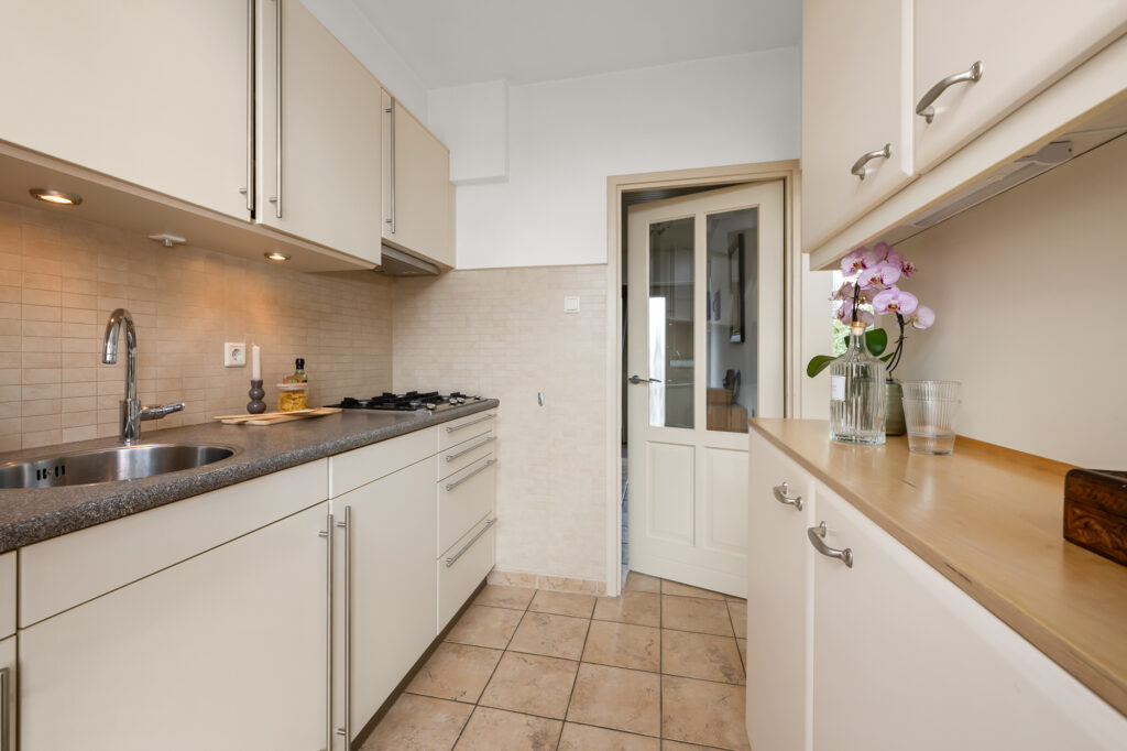 De keuken bevindt zich aan de achterzijde van de woning en heeft directe toegang tot de achtertuin. De keuken is voorzien van een keukenblok met bovenkasten, een kookplaat en een afzuigkap die netjes is weggewerkt in een keukenkastje. Aan beide zijden van de keuken is opbergruimte aanwezig, wat zorgt voor een praktische indeling. Geïntegreerde spotjes en een designradiator geven de ruimte een verzorgde uitstraling.