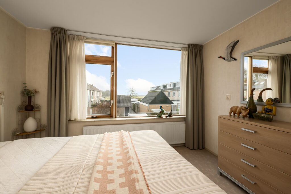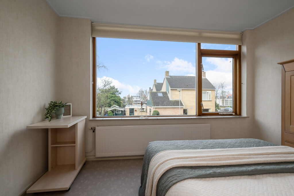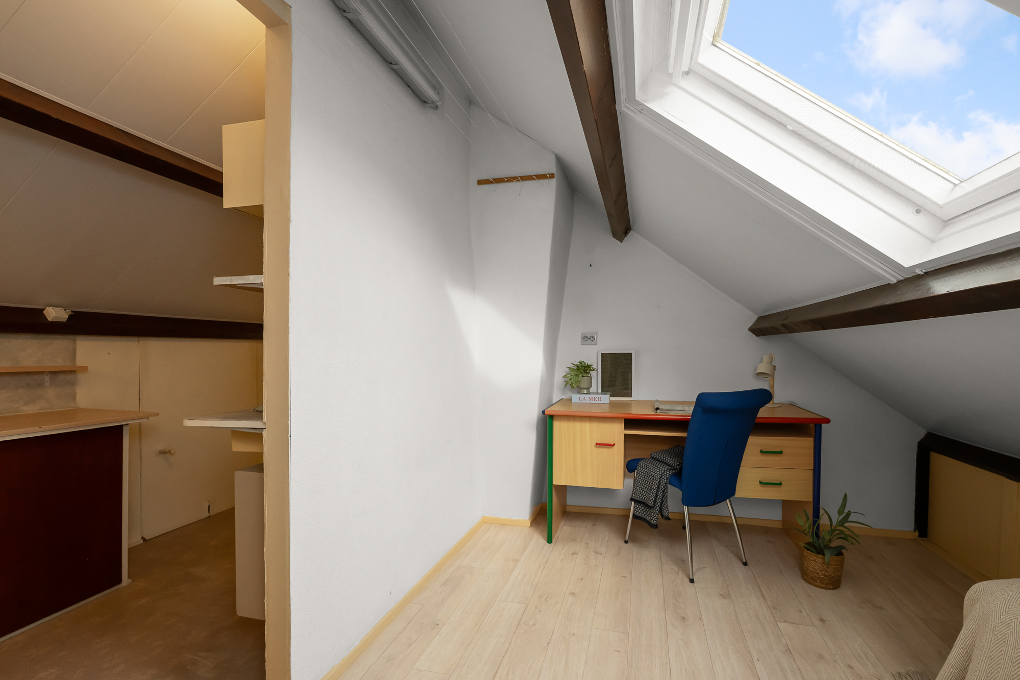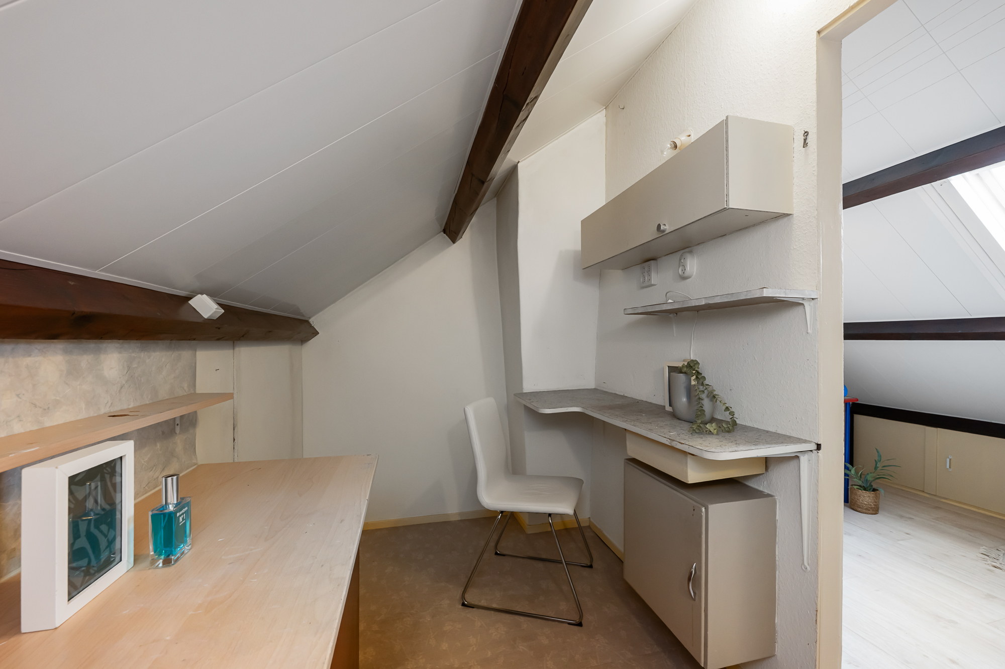 Via een vaste trap bereik je de zolderverdieping. Je komt boven op de overloop waar tevens de cv-ketel is opgesteld (Atag, 2017, eigendom). Vanuit hier loop je door naar de vierde slaapkamer, voorzien van een dakraam dat zorgt voor prettig daglicht. Achter de knieschotten zijn maatwerkkasten gerealiseerd, waardoor de ruimte optimaal wordt benut en er verrassend veel bergruimte aanwezig is. Deze verdieping biedt volop mogelijkheden en is uitstekend geschikt als slaapkamer, werkruimte of hobbykamer.