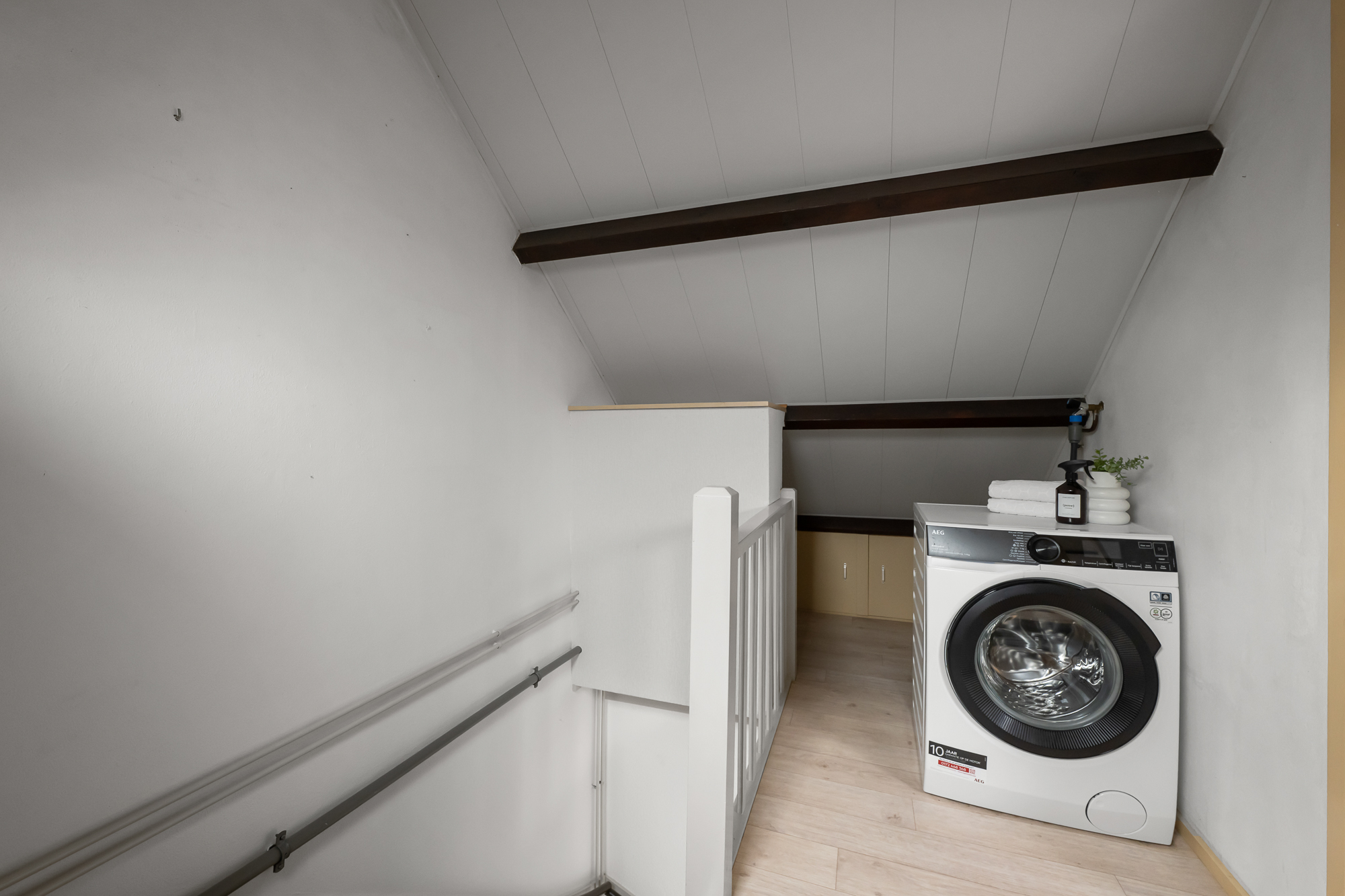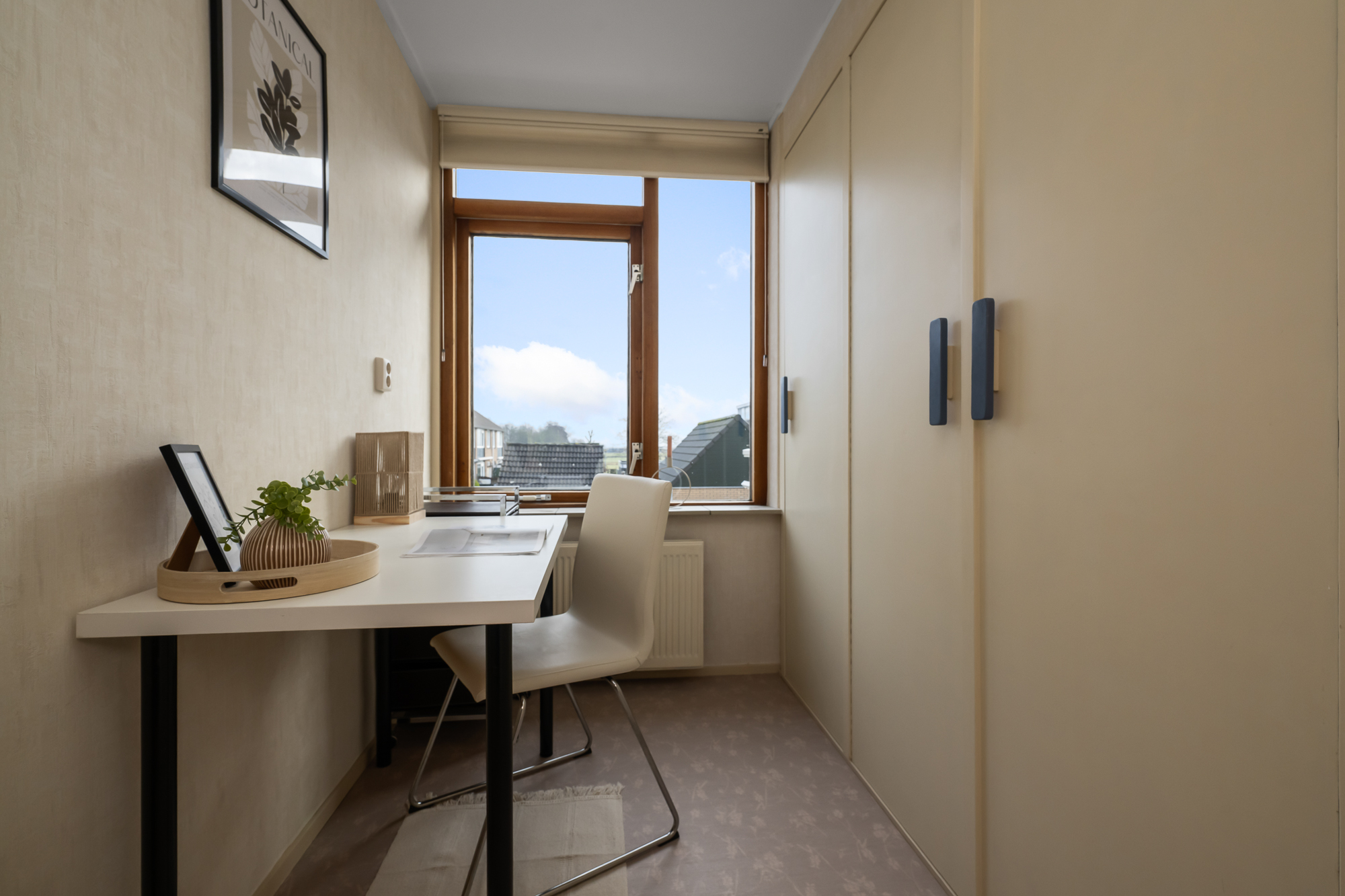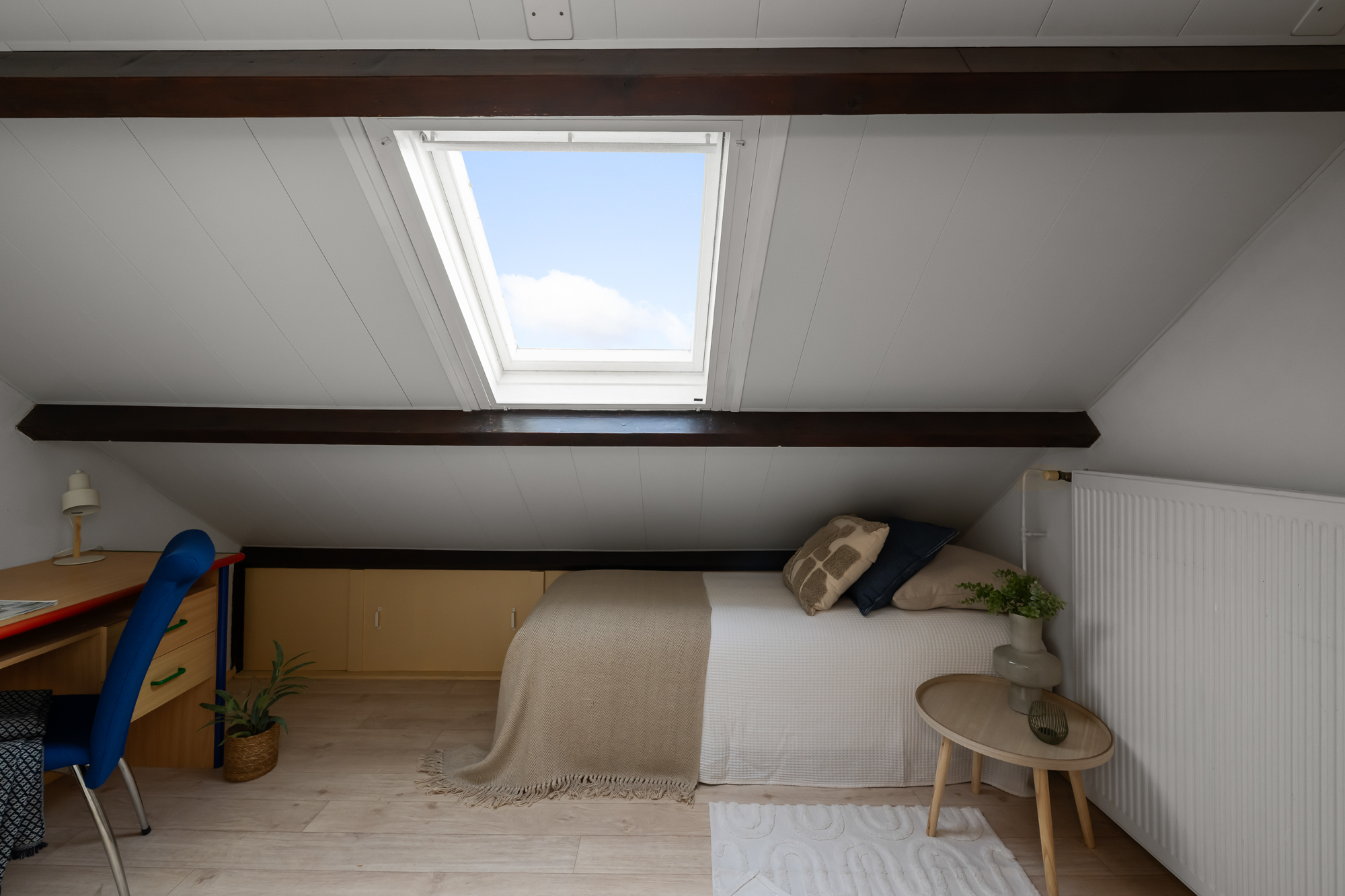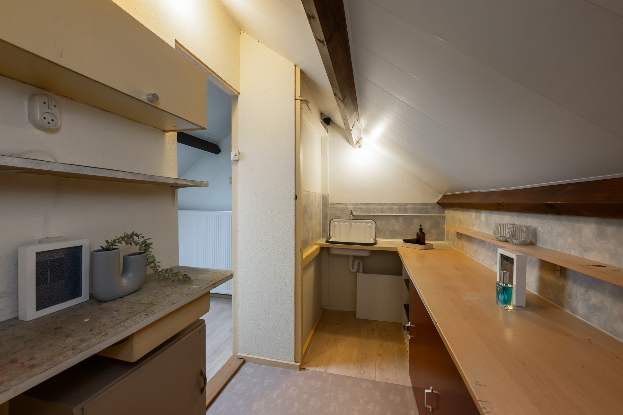 Via een vaste trap bereik je de zolderverdieping. Je komt boven op de overloop waar tevens de cv-ketel is opgesteld (Atag, 2017, eigendom). Vanuit hier loop je door naar de vierde slaapkamer, voorzien van een dakraam dat zorgt voor prettig daglicht. Achter de knieschotten zijn maatwerkkasten gerealiseerd, waardoor de ruimte optimaal wordt benut en er verrassend veel bergruimte aanwezig is. Deze verdieping biedt volop mogelijkheden en is uitstekend geschikt als slaapkamer, werkruimte of hobbykamer.