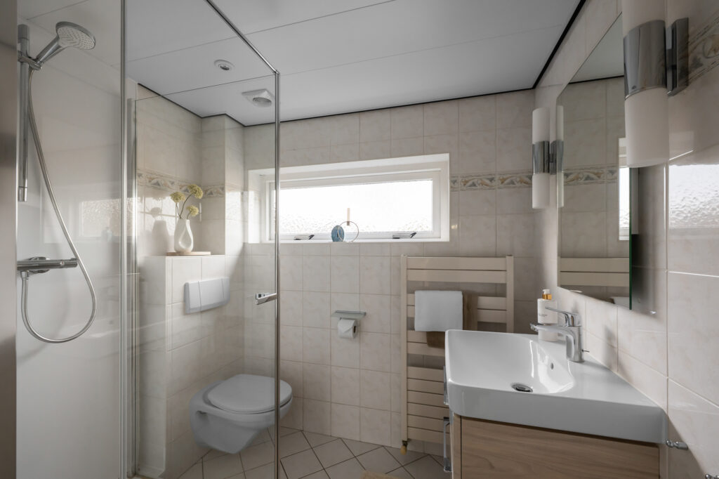 Op de eerste verdieping bevinden zich drie slaapkamers, stuk voor stuk functioneel in te delen als slaap-, kinder- of werkkamer. De badkamer is verzorgd en beschikt over een douche en een modern wastafelmeubel. De ruimte is voorzien van een designradiator en mechanische ventilatie, wat zorgt voor extra comfort. Inbouwspotjes en moderne wandlampen geven de badkamer een eigentijdse uitstraling, terwijl de prettige lichtinval het geheel een frisse en aangename sfeer geeft.