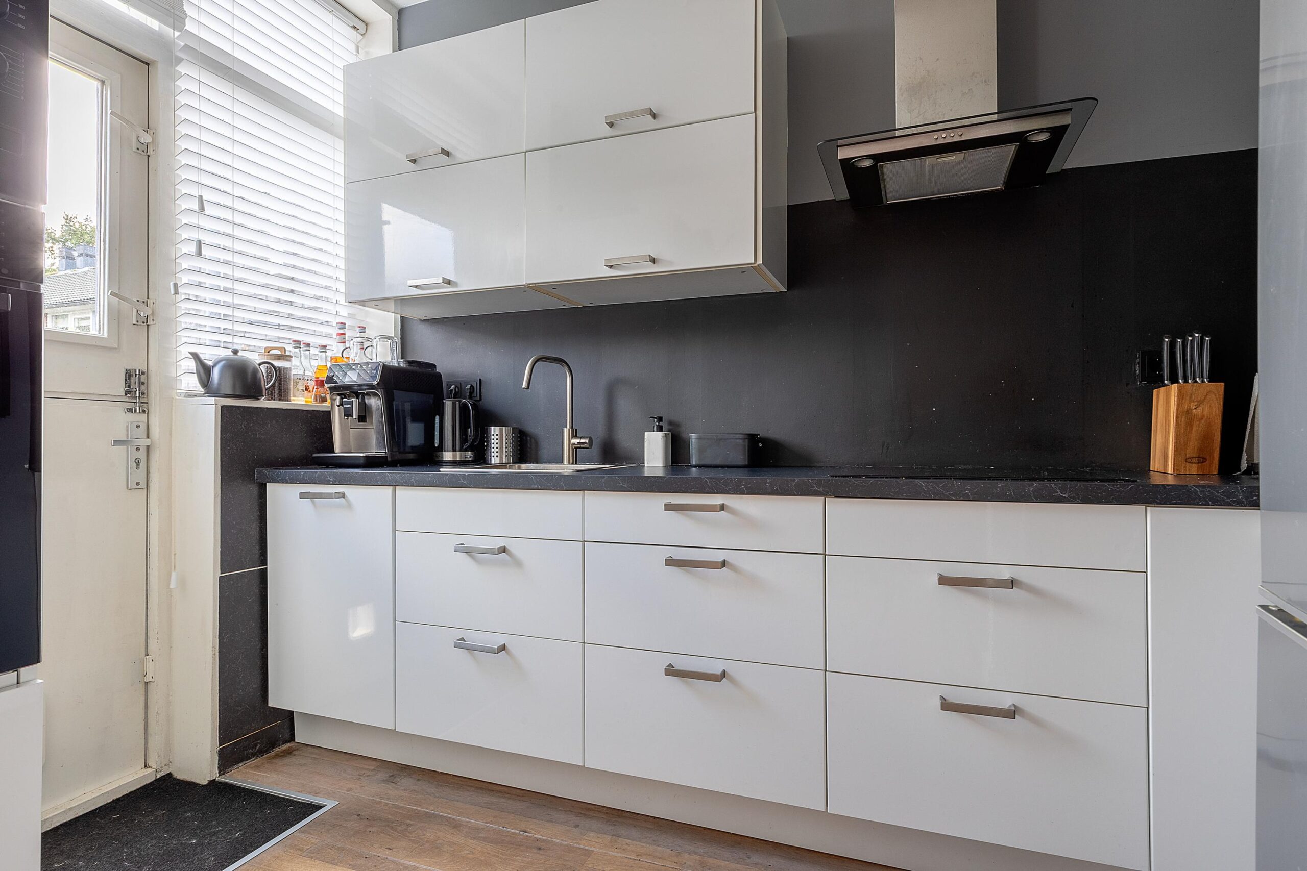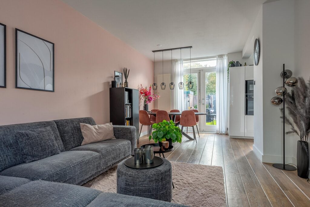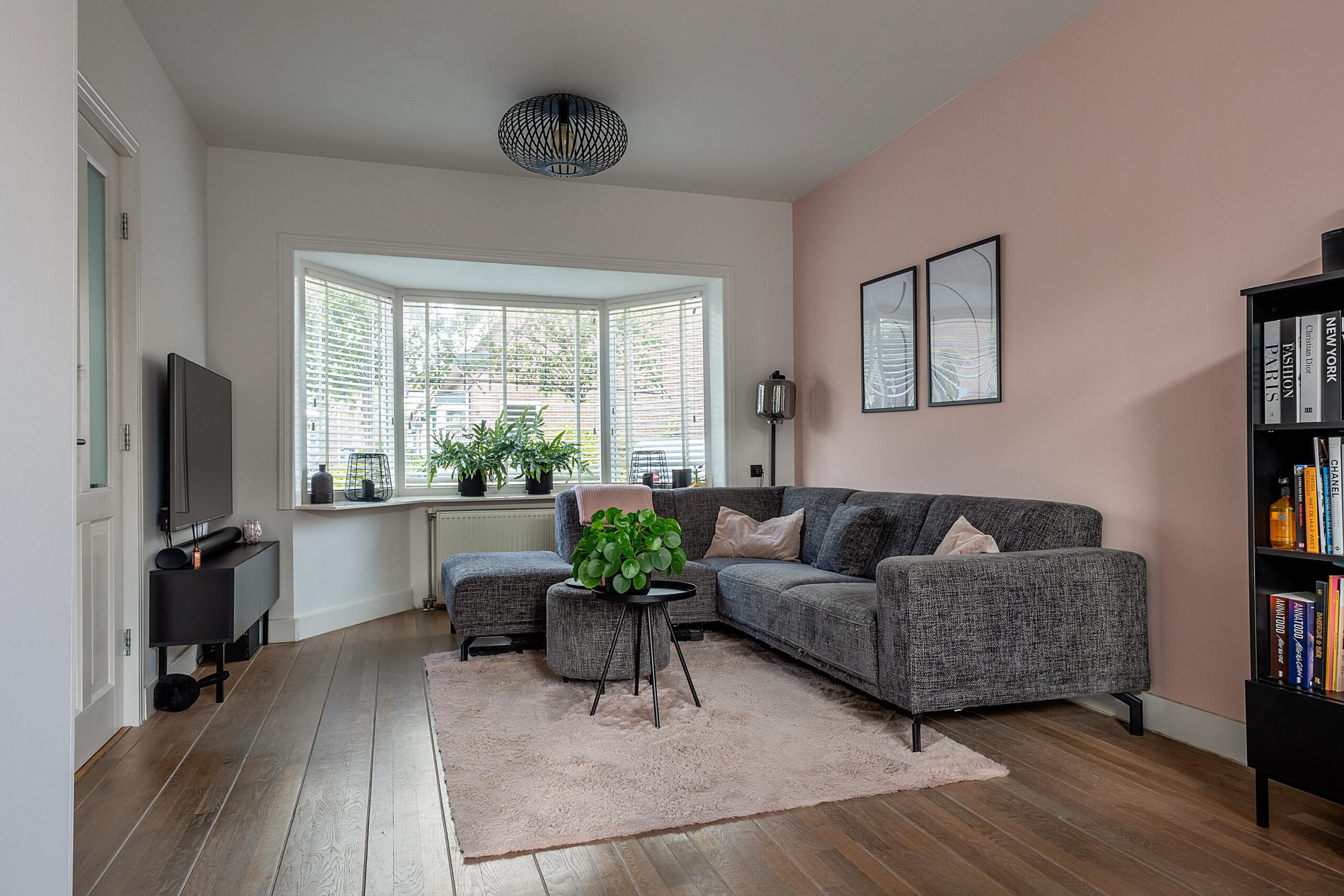 Bij binnenkomst word je ontvangen in de hal met toilet, waarna je de sfeervolle woon- en eetkamer binnenstapt. De ruimte ademt warmte en gezelligheid, met een prachtige eikenhouten vloer en een karakteristieke erker aan de voorzijde – zo’n typisch jaren ’30-detail dat direct in het oog springt. Dankzij de prettige lichtinval voelt het hier direct huiselijk aan. Aan de achterzijde bevindt zich de open keuken, die in 2022 werd uitgebreid met een ovenkast en moderne inbouwapparatuur. Zo ontstaat een fijne leefkeuken waar koken en samenzijn moeiteloos samengaan.