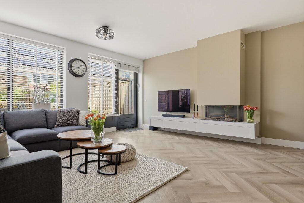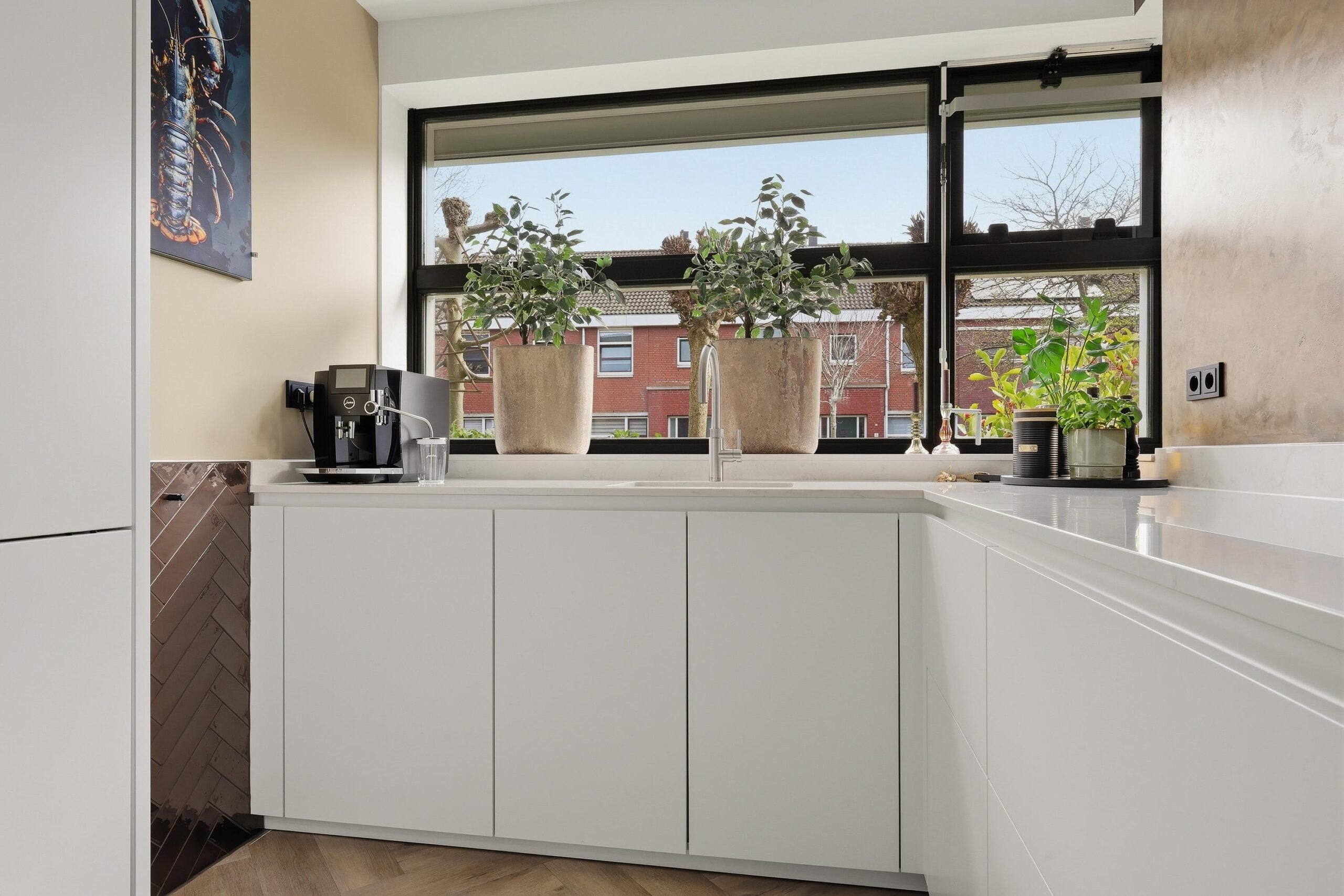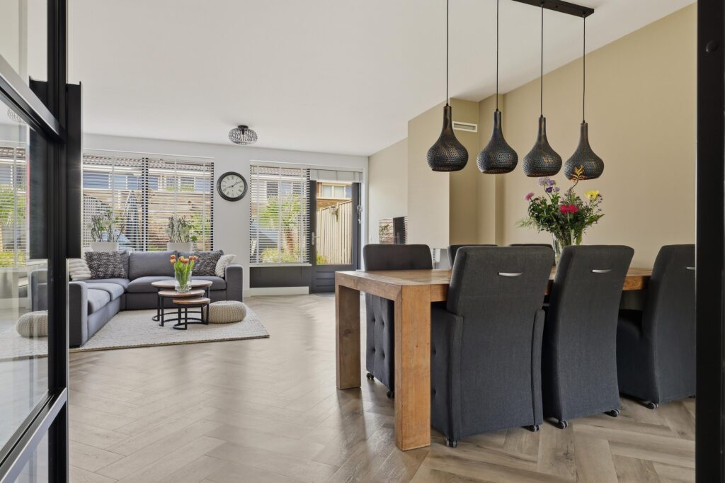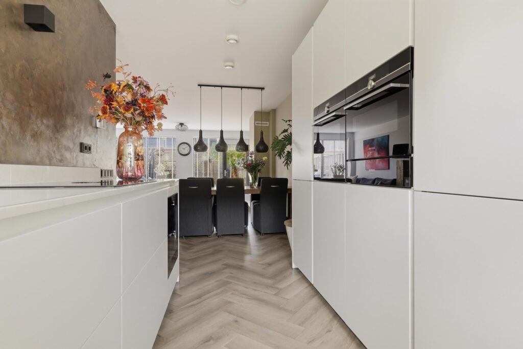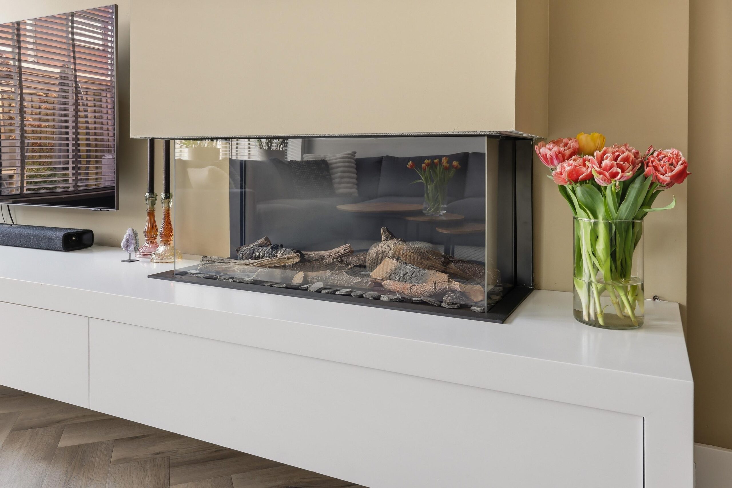 Bij binnenkomst valt direct de verzorgde afwerking en het prettige licht op. De hal biedt toegang tot het toilet en de ruime leefruimte. De woonkamer voorzien van vloerverwarming is heerlijk licht en ruim opgezet, met voldoende plaats voor een gezellige zithoek en een royale eettafel. Dankzij de grote raampartijen en de directe verbinding met de achtertuin ontstaat een fijne, open sfeer, extra versterkt door de gashaard. De moderne keuken is uitgevoerd met diverse inbouwapparatuur onder andere een klimaatkast en een kokend waterkraan, en vormt een prettige plek voor kookliefhebbers.