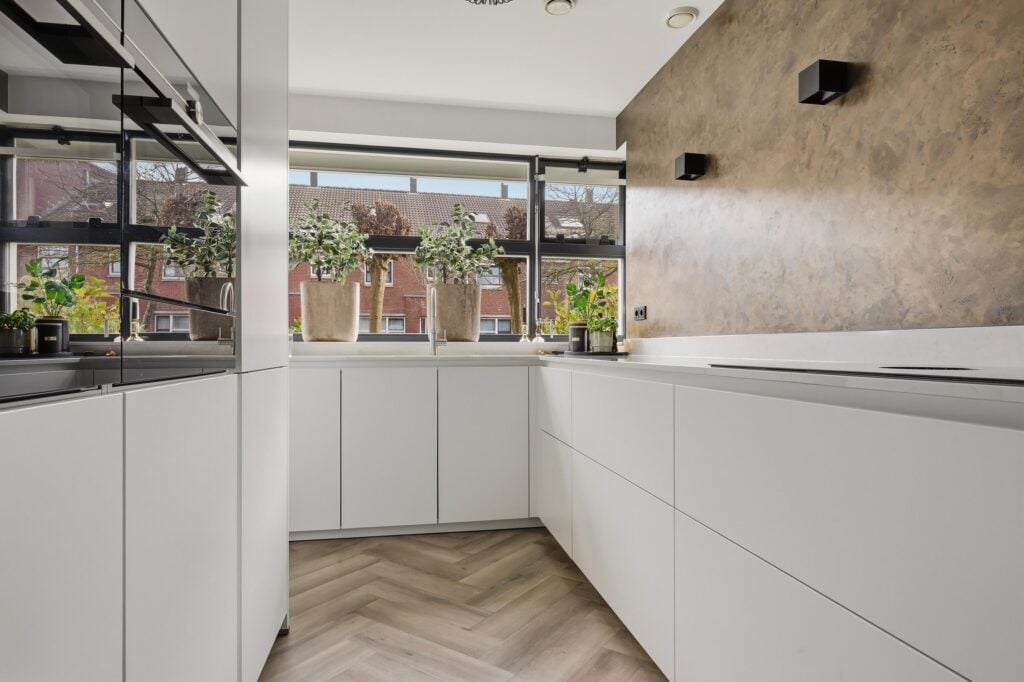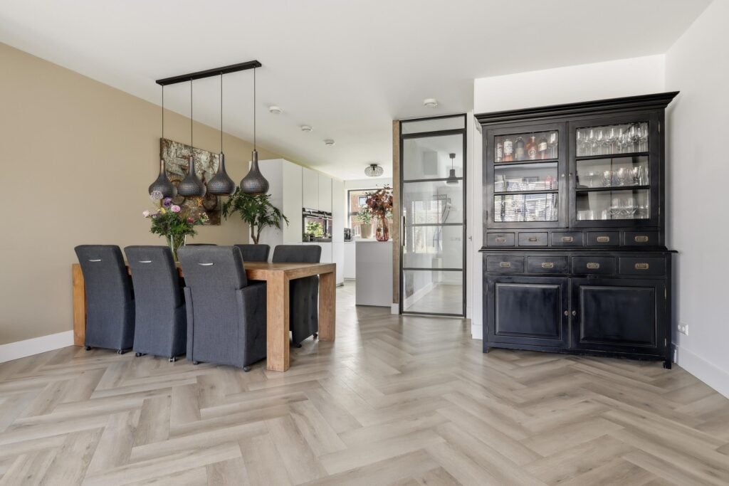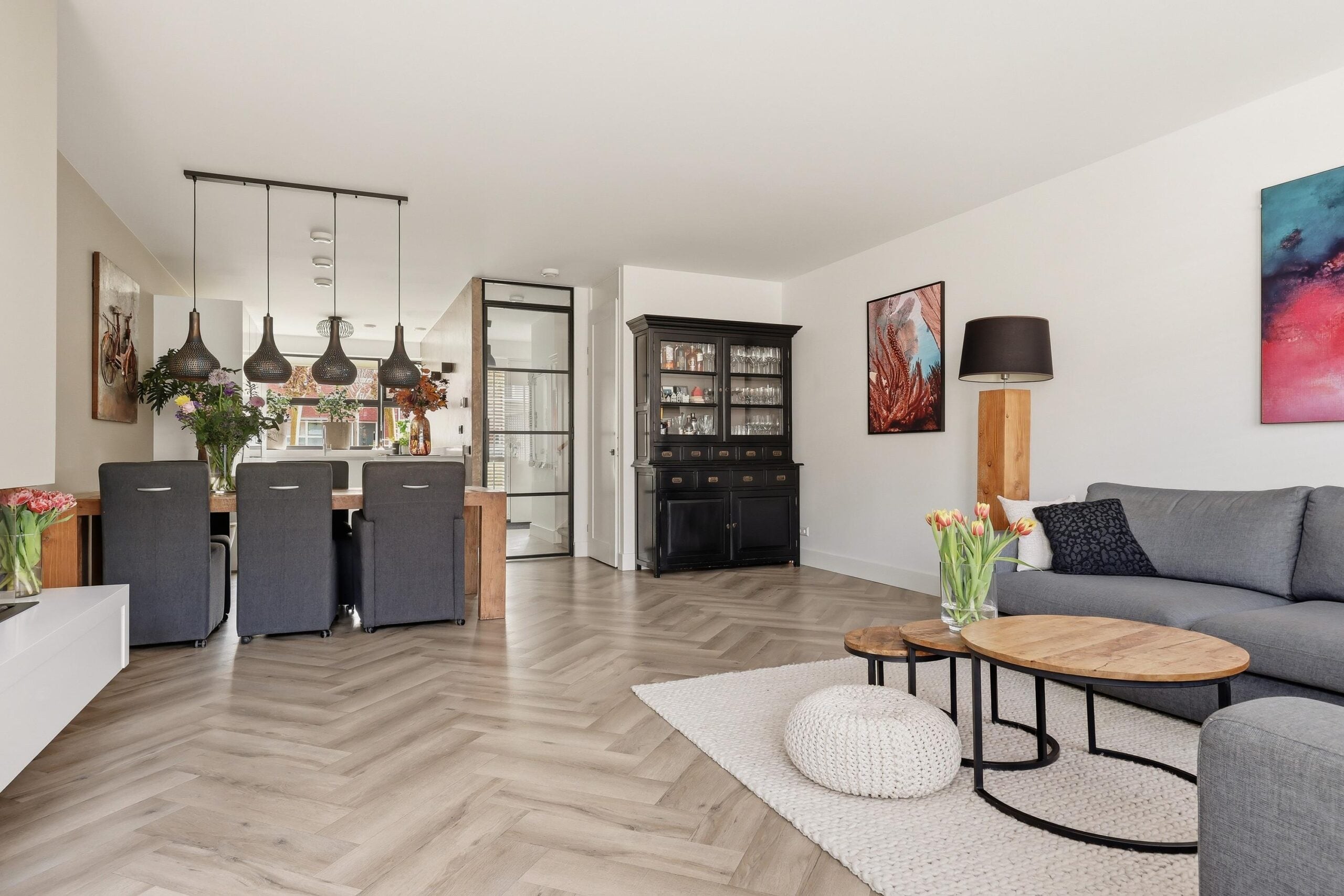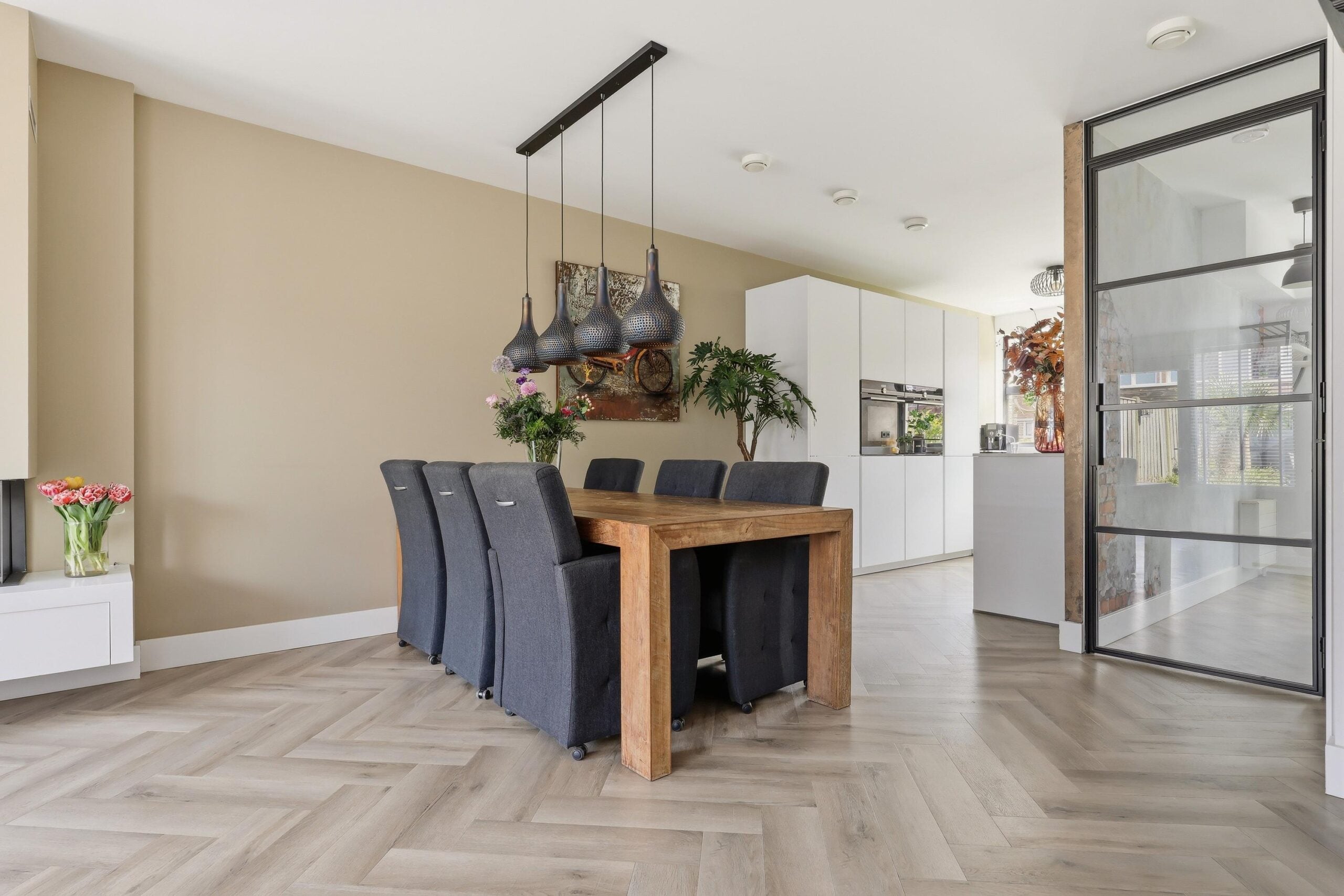 Bij binnenkomst valt direct de verzorgde afwerking en het prettige licht op. De hal biedt toegang tot het toilet en de ruime leefruimte. De woonkamer voorzien van vloerverwarming is heerlijk licht en ruim opgezet, met voldoende plaats voor een gezellige zithoek en een royale eettafel. Dankzij de grote raampartijen en de directe verbinding met de achtertuin ontstaat een fijne, open sfeer, extra versterkt door de gashaard. De moderne keuken is uitgevoerd met diverse inbouwapparatuur onder andere een klimaatkast en een kokend waterkraan, en vormt een prettige plek voor kookliefhebbers.