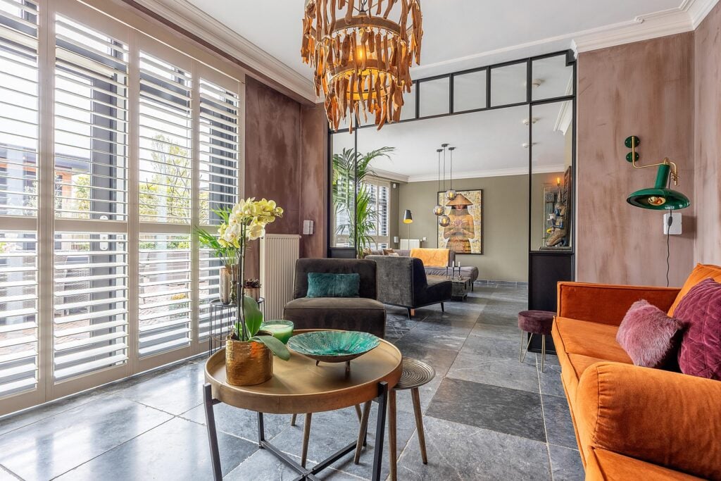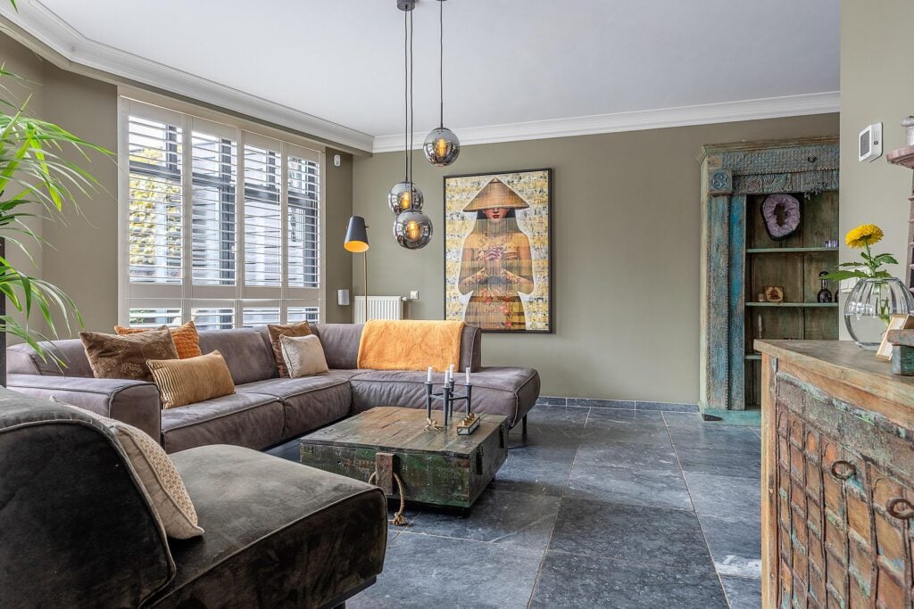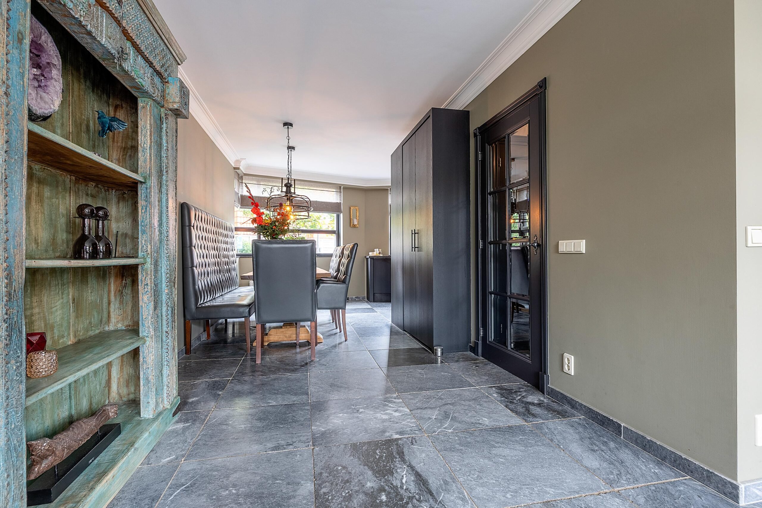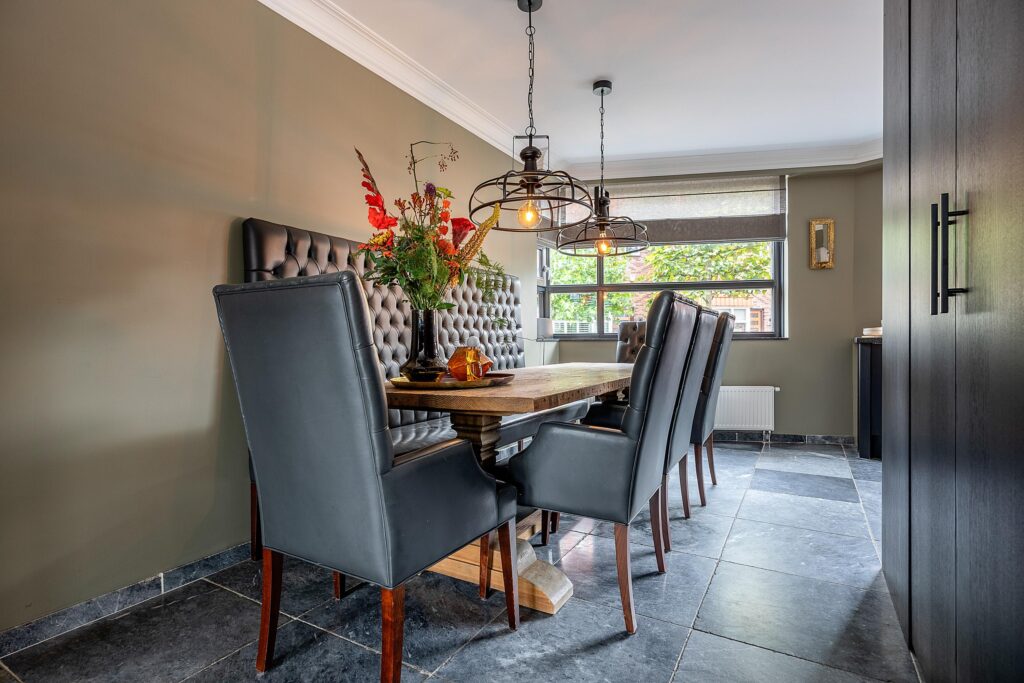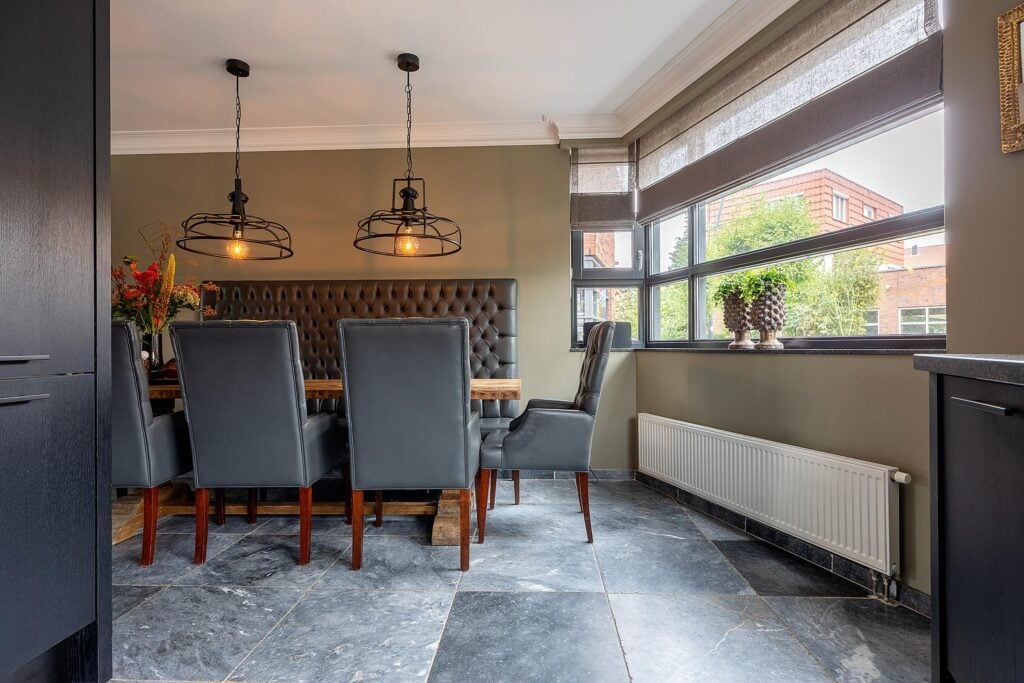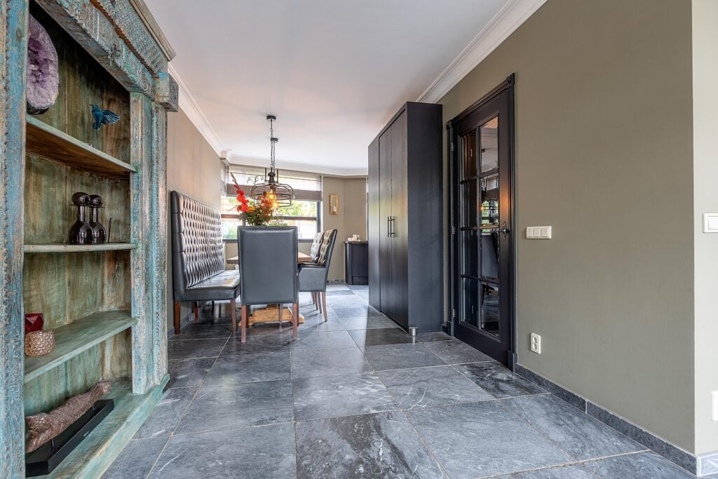 De royale woonkamer, die meer dan 9 meter breed is, ligt grenzend aan de eetkamer waar een grote eettafel past. De indeling van deze twee grote ruimtes is geheel flexibel, wat de mogelijkheid biedt om bijvoorbeeld een voorzitkamer en een aparte TV-kamer te creëren. Heb je graag extra ruimte voor je gasten? Dan is het zelfs mogelijk om de huidige eetkamer naar achteren te verplaatsen. De begane grond valt verder op door de gestuukte wanden, sierlijsten en de natuurstenen vloer, die een warme en luxe uitstraling geven.