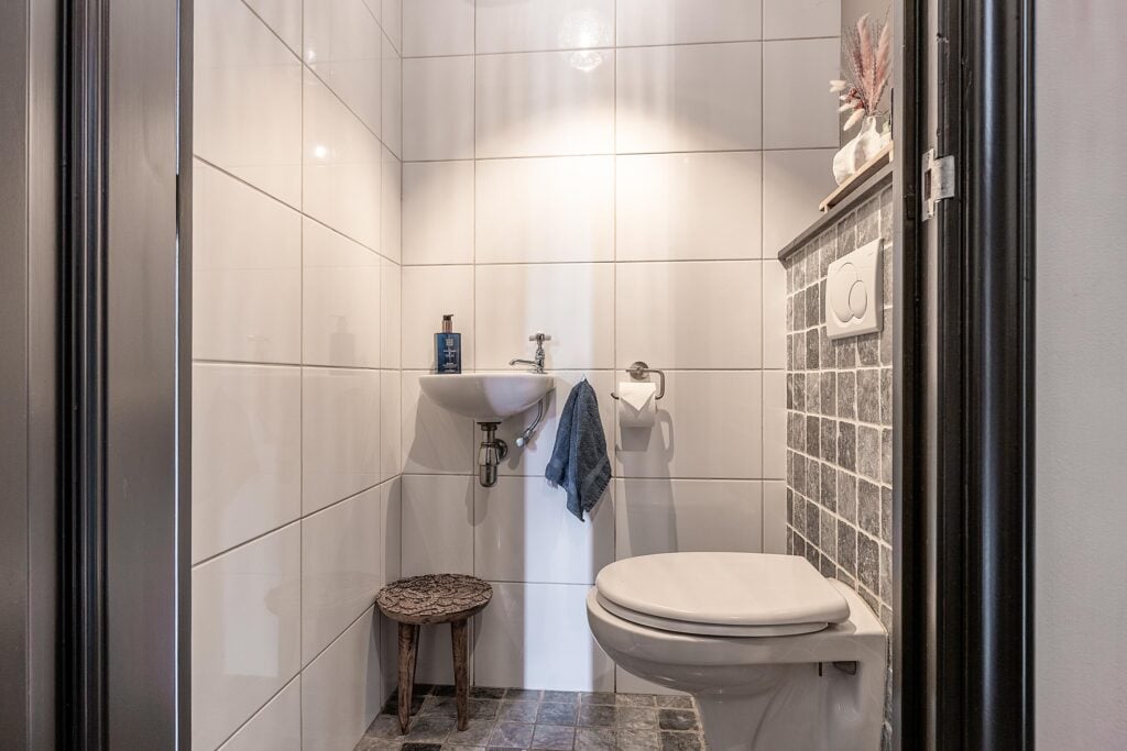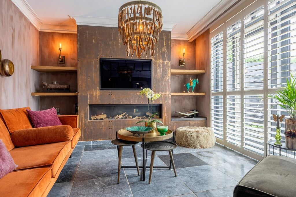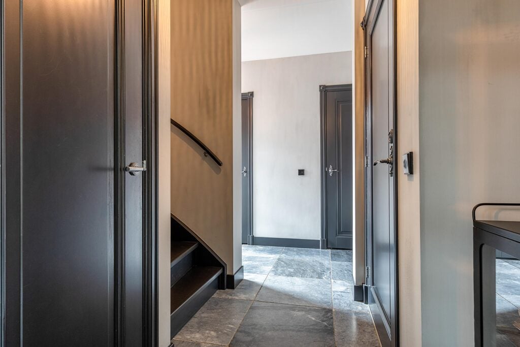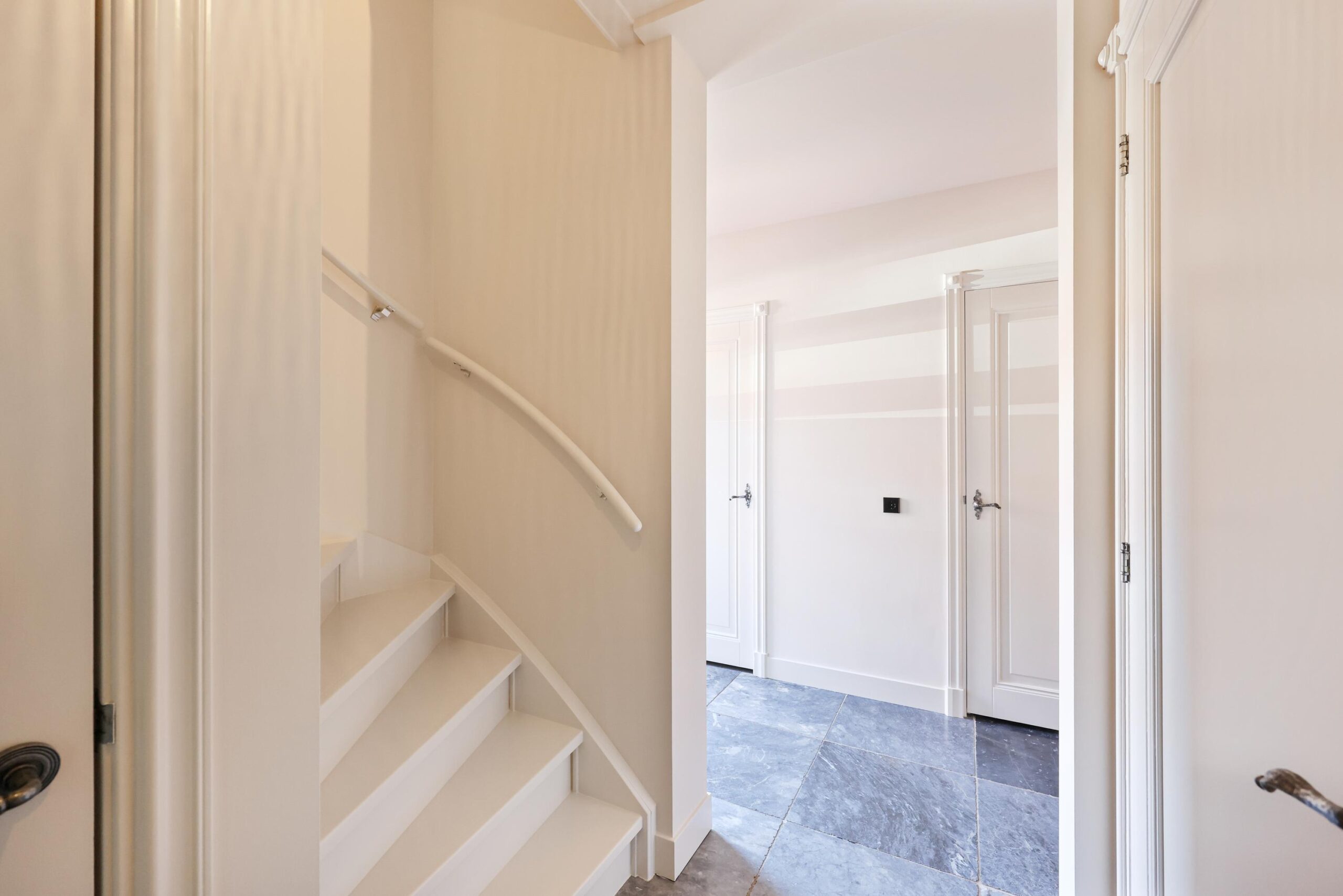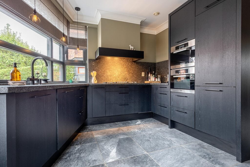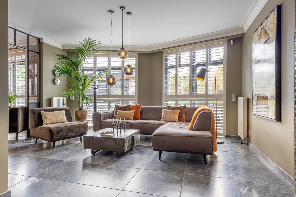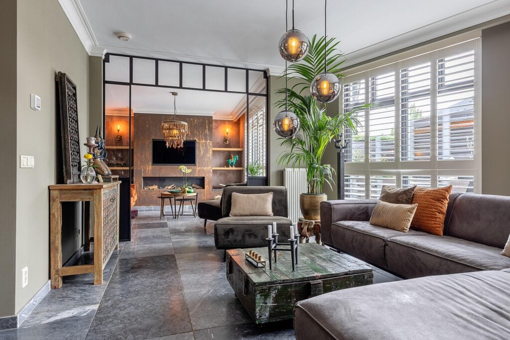 De royale woonkamer, die meer dan 9 meter breed is, ligt grenzend aan de eetkamer waar een grote eettafel past. De indeling van deze twee grote ruimtes is geheel flexibel, wat de mogelijkheid biedt om bijvoorbeeld een voorzitkamer en een aparte TV-kamer te creëren. Heb je graag extra ruimte voor je gasten? Dan is het zelfs mogelijk om de huidige eetkamer naar achteren te verplaatsen. De begane grond valt verder op door de gestuukte wanden, sierlijsten en de natuurstenen vloer, die een warme en luxe uitstraling geven.