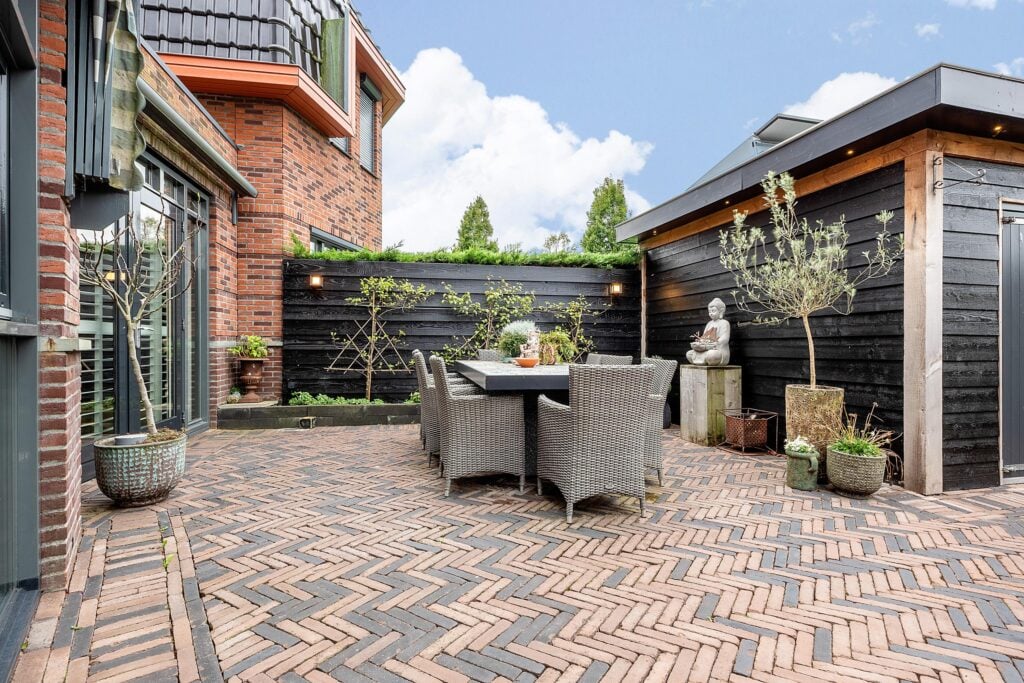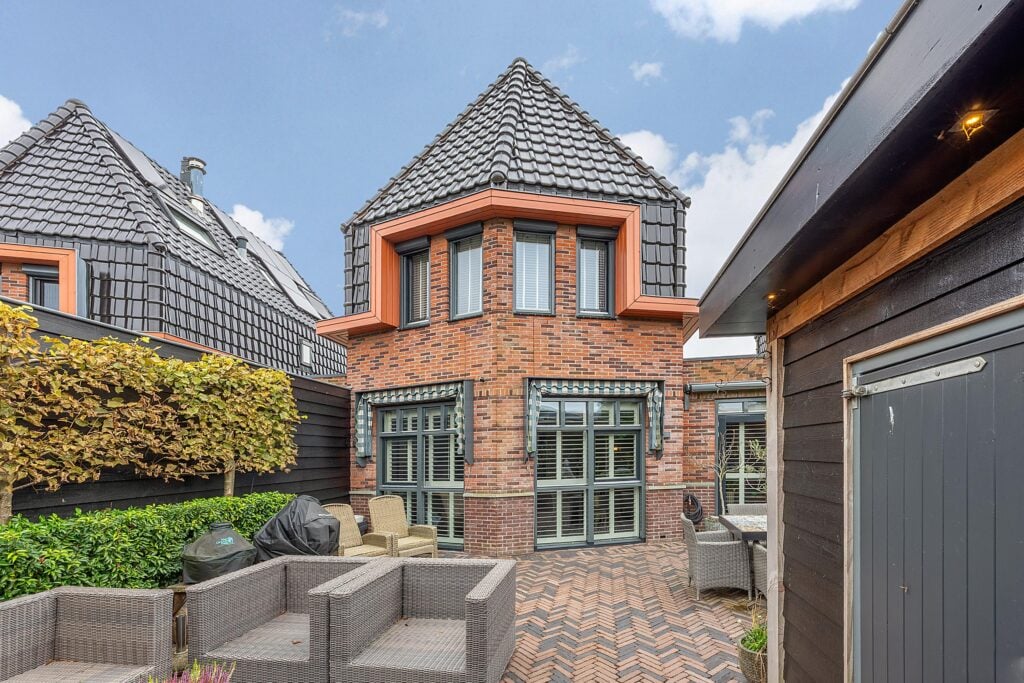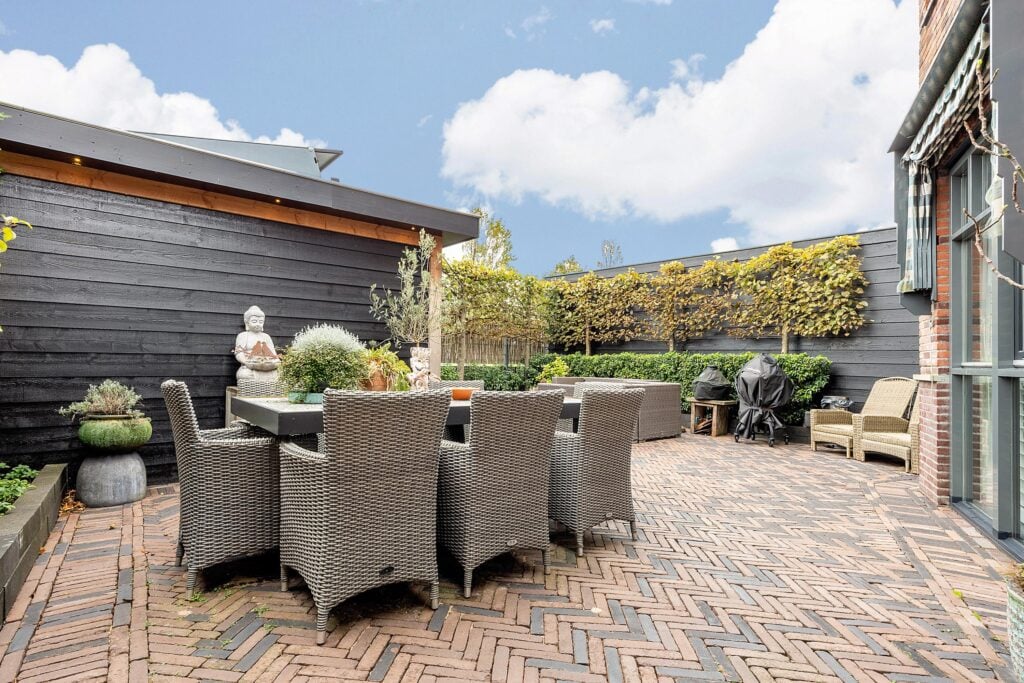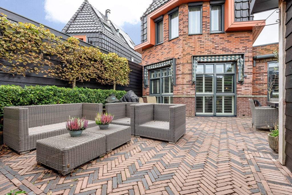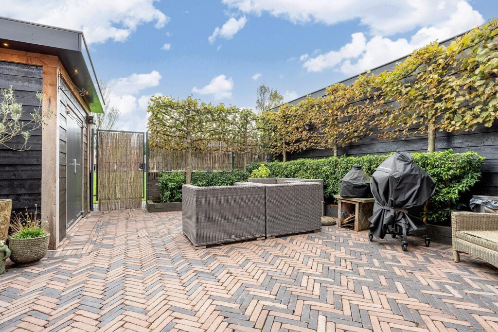 Via openslaande tuindeuren bereikt men vanuit de woonkamer de achtertuin, die dankzij de westelijk gerichte ligging volop zonlicht ontvangt. Deze verzorgde tuin biedt tal van terrasmogelijkheden en groenvoorzieningen, en beschikt over een aparte houten berging en een eigen achterom. Voor extra rust en privacy ligt er een groenstrook aan de achterzijde van de woning. Schaduwplekken kunnen eenvoudig worden aangepast met zonwering en markiezen. Daarnaast is er een inpandige berging, direct grenzend aan de eigen oprit, waar je een auto kunt parkeren en waar zelfs een elektrisch oplaadpunt aanwezig is.