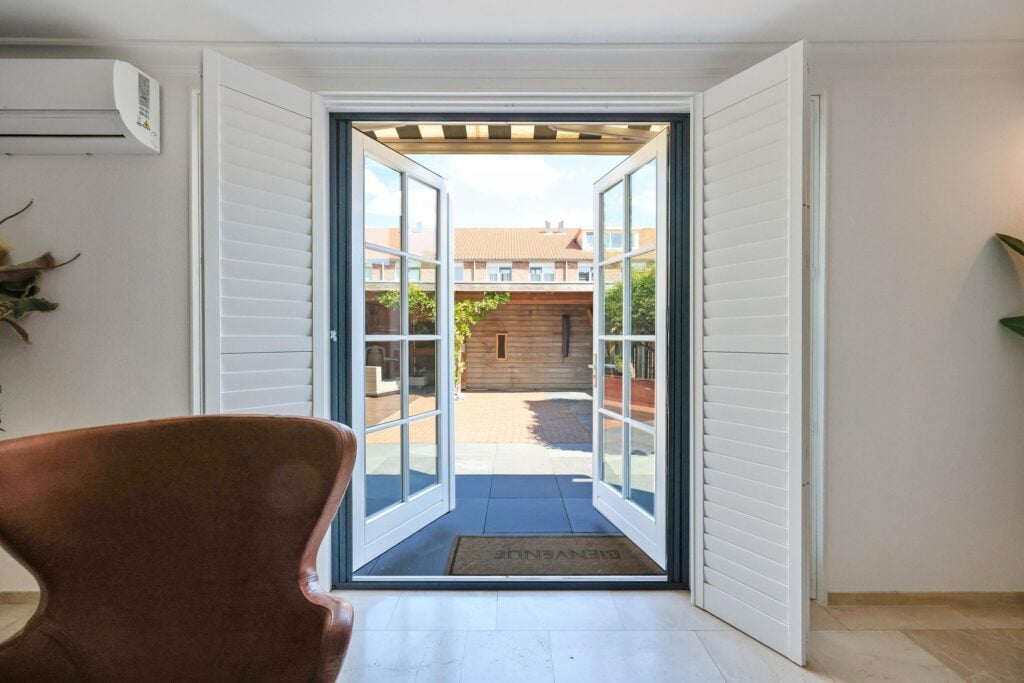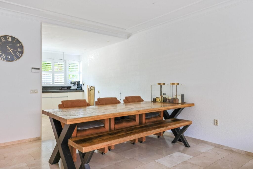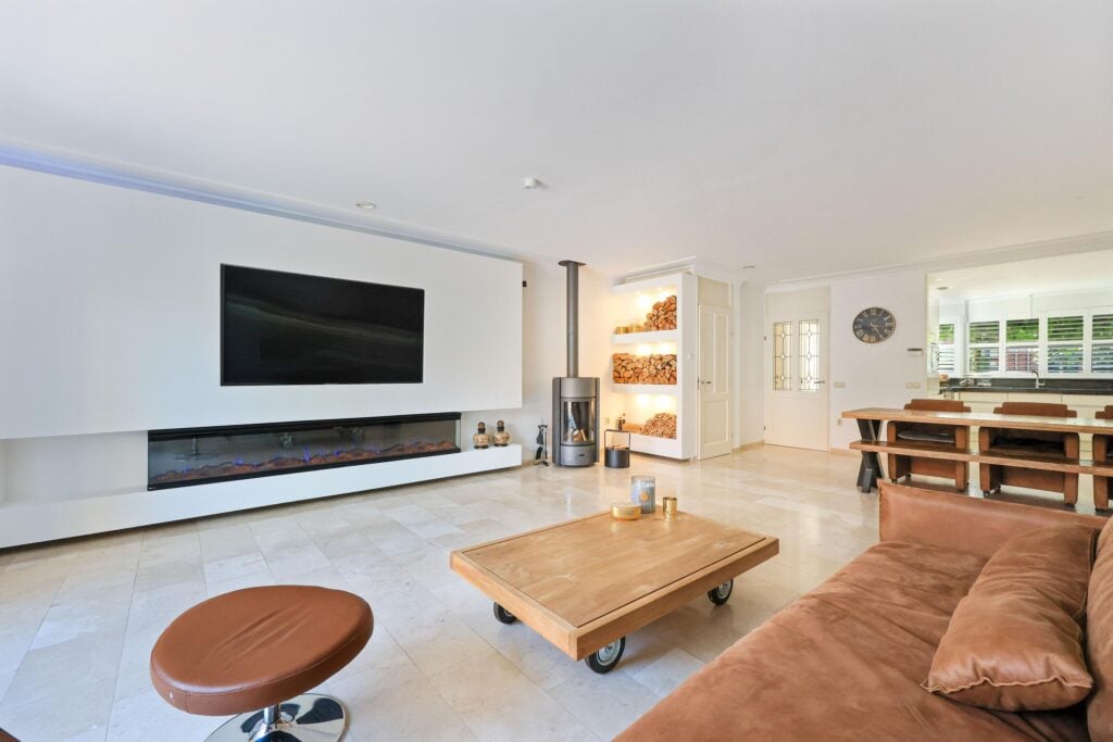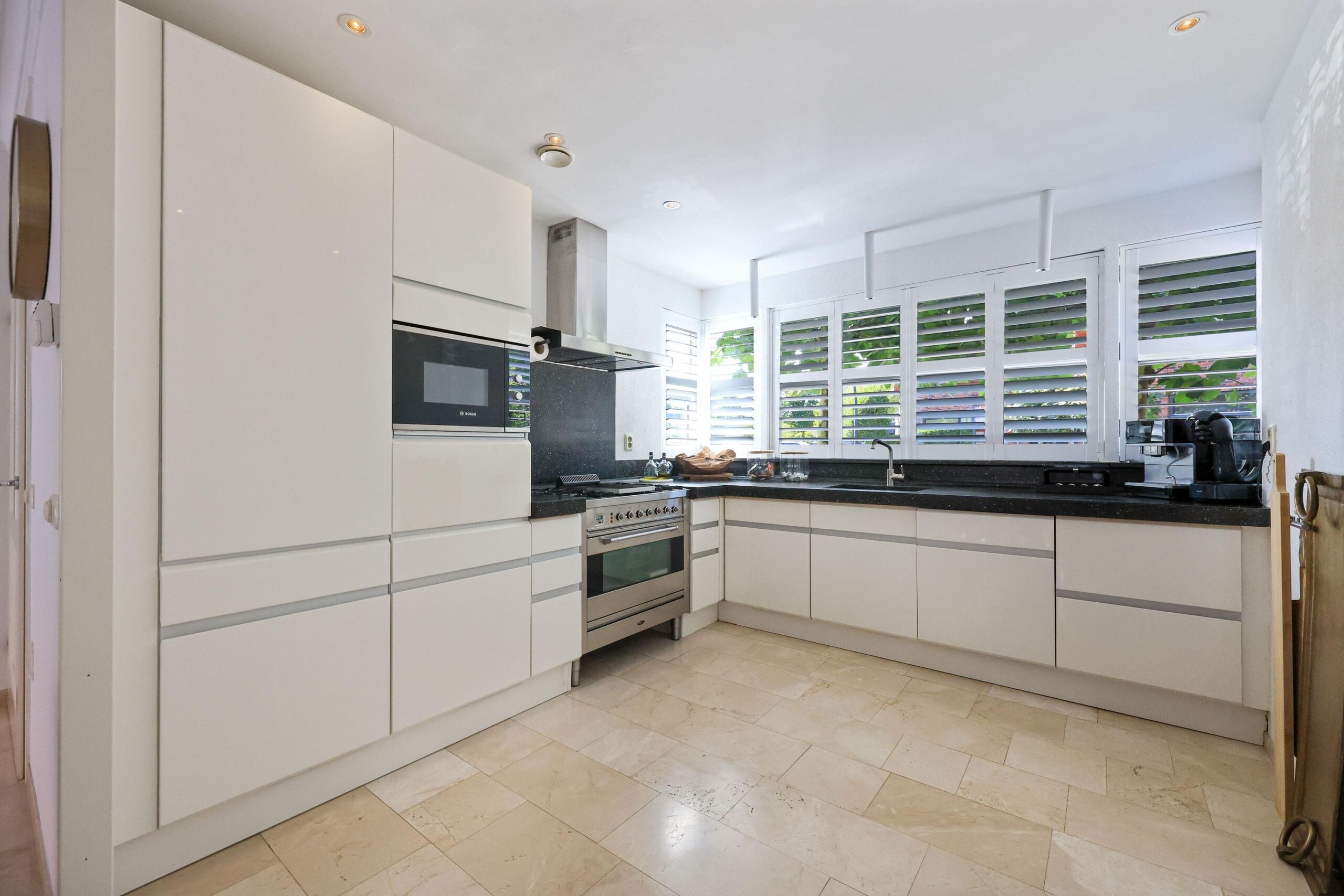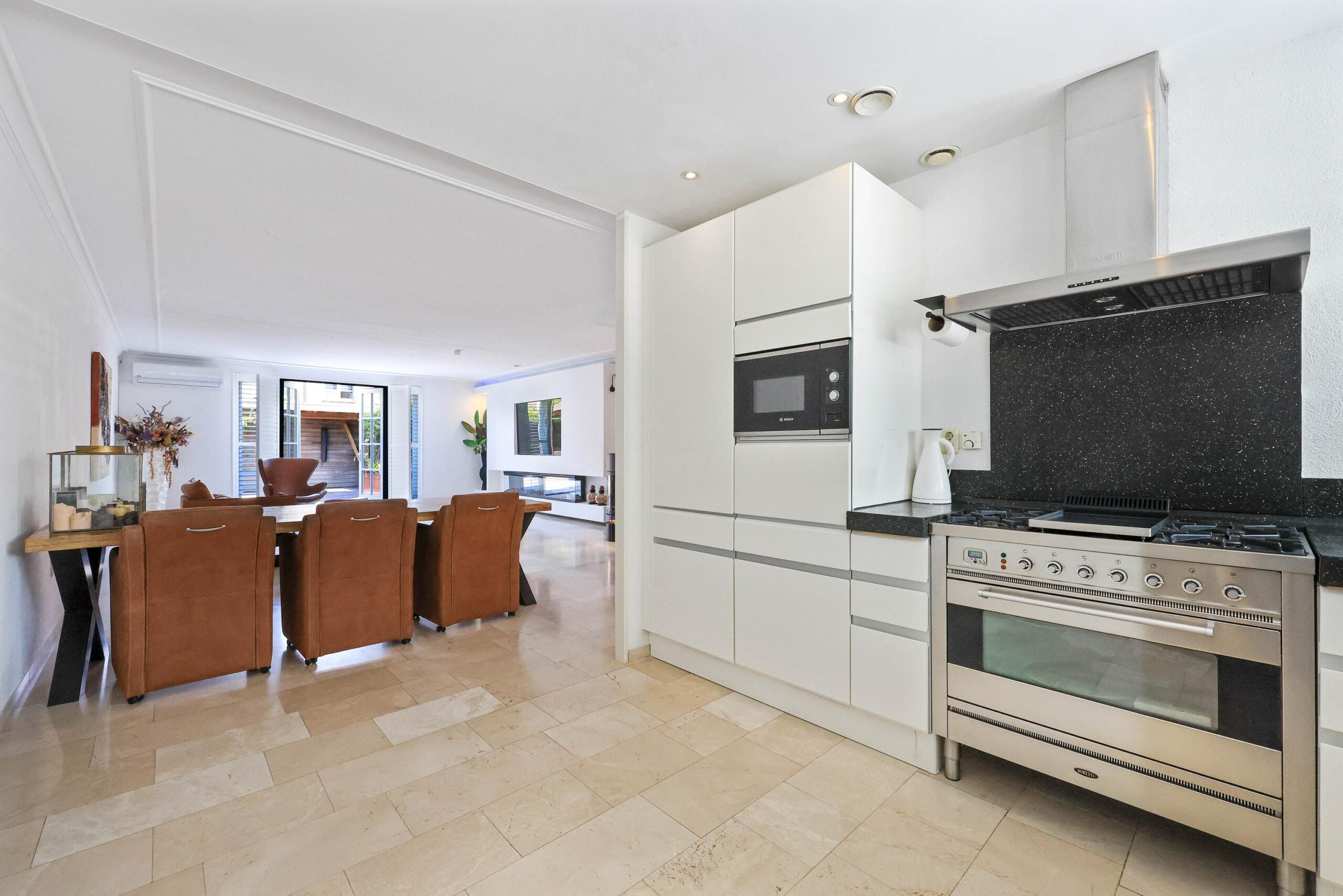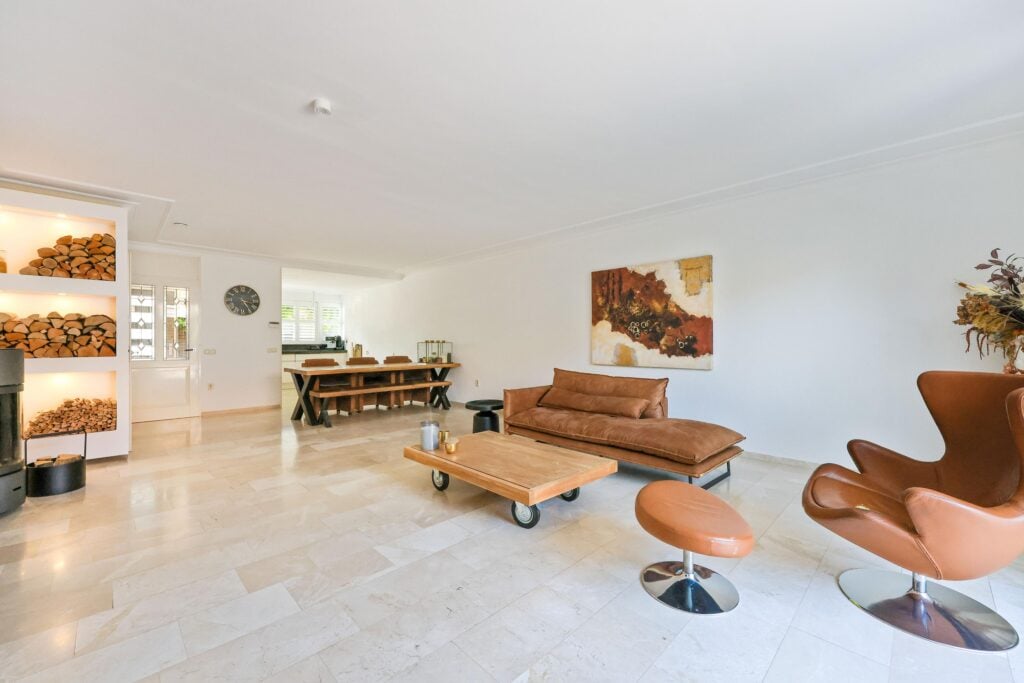 De gehele begane grond is voorzien van vloerverwarming en afgewerkt met elegante travertin plavuizen. Voor entertainment kun je volop genieten van de indrukwekkende tv-wand, die niet alleen functioneel is, maar ook een echte blikvanger vormt in het interieur. Daarnaast zorgen de Amerikaanse shutters, de airconditioning en de sfeervolle elektrische haard voor een modern en comfortabel leefklimaat. Aan de voorzijde bevindt zich de open keuken, die perfect onderhouden is en voorzien van al het nodige inbouwapparatuur.