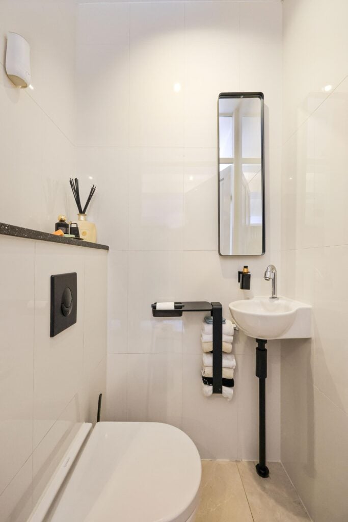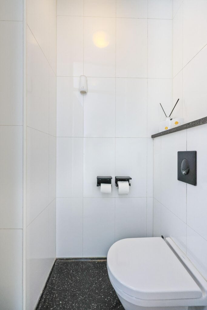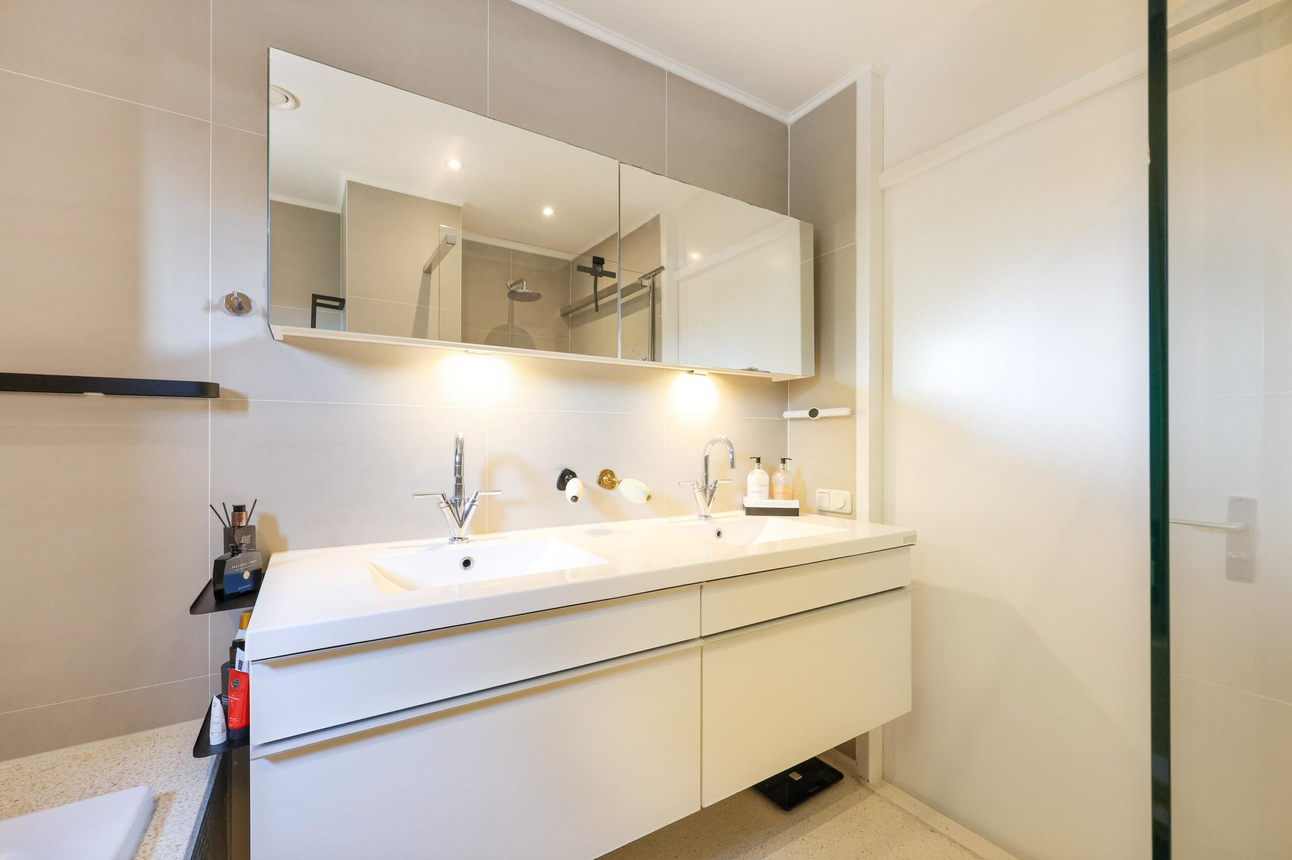 Op de eerste verdieping vind je twee slaapkamers, waaronder een royale master bedroom met ramen aan twee zijden, wat zorgt voor een lichte en luchtige sfeer. De badkamer sluit naadloos aan op de luxe van de woning en biedt een dubbele wastafel met meubel, een ligbad en een inloopdouche. Bovendien is er een aparte toiletruimte aanwezig voor extra comfort.