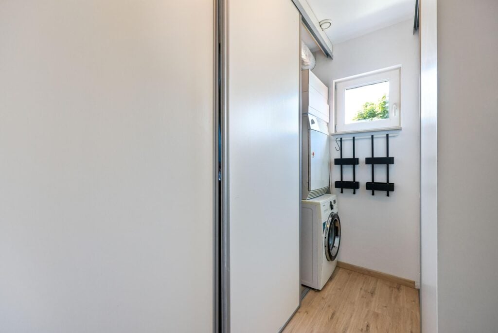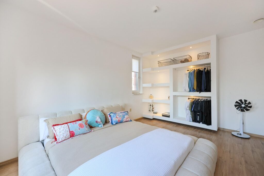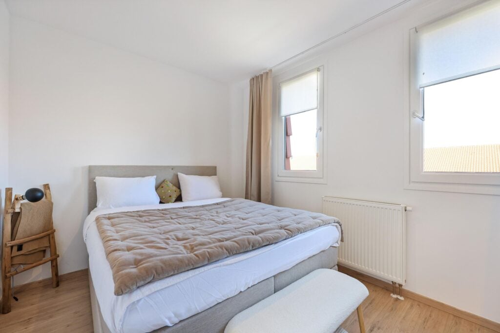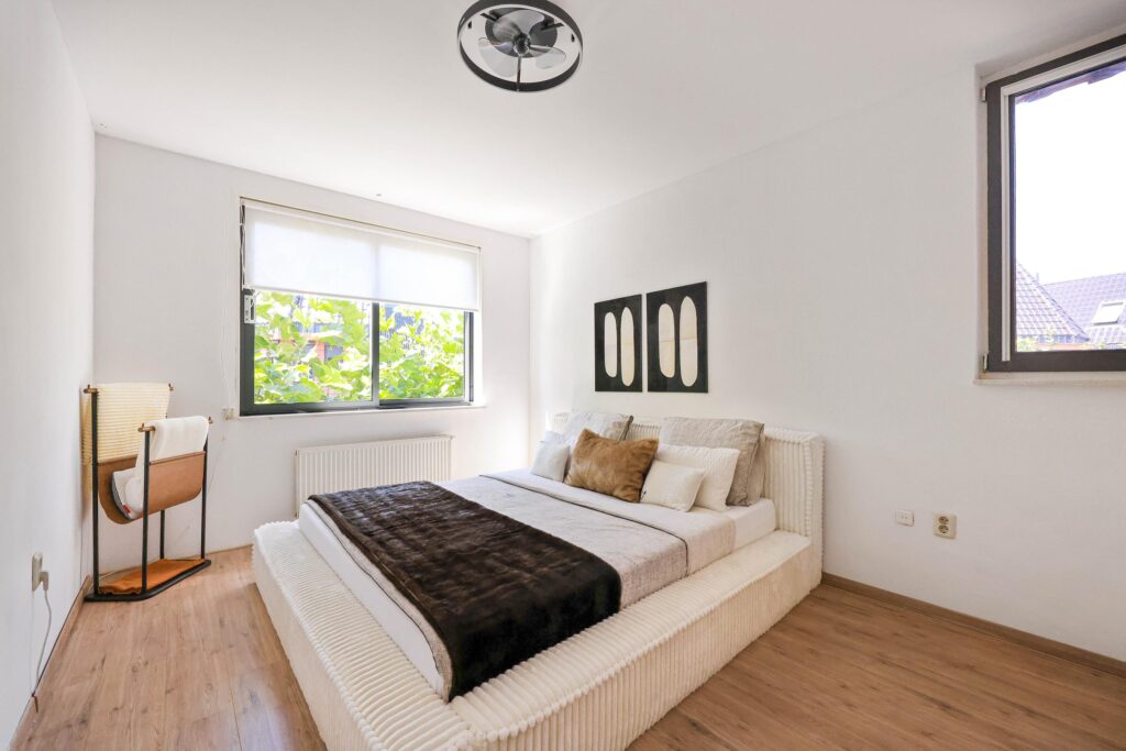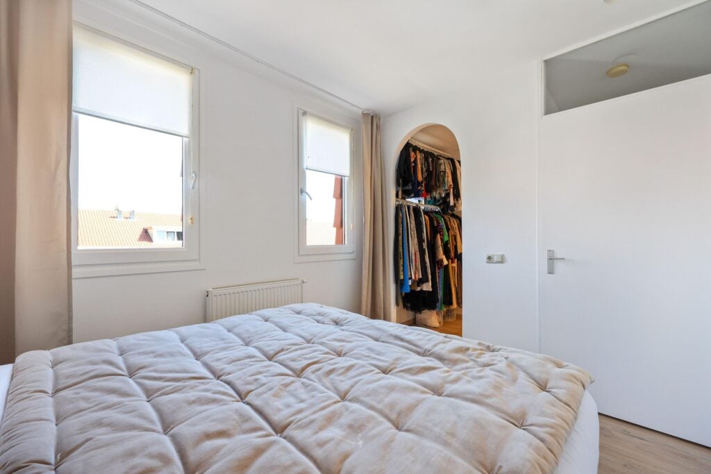 De bovenste etage biedt twee extra slaapkamers, waarvan een tweede master bedroom, die nóg ruimer is en beschikt over een ingebouwd kastmeubel en veel lichtinval dankzij meerdere ramen. De vierde slaapkamer is eveneens verrassend ruim en bevat een eigen inloopkast. Op deze verdieping bevindt zich ook een aparte ruimte met de CV-ketel en aansluitingen voor een wasmachine en droger.