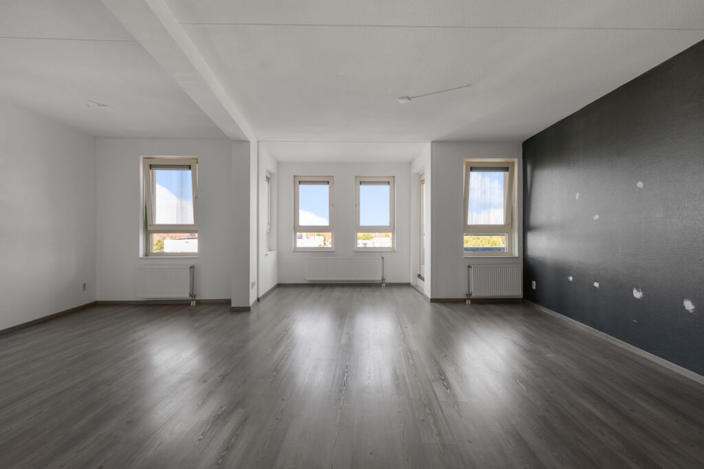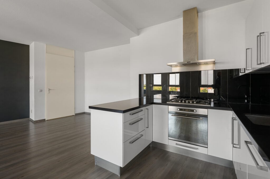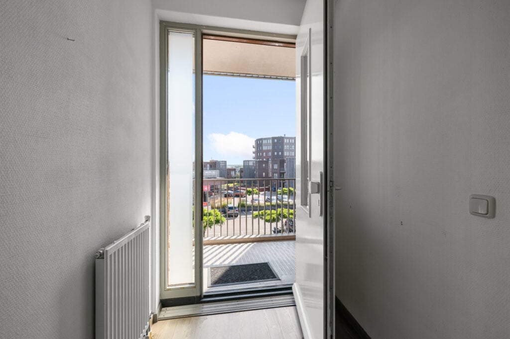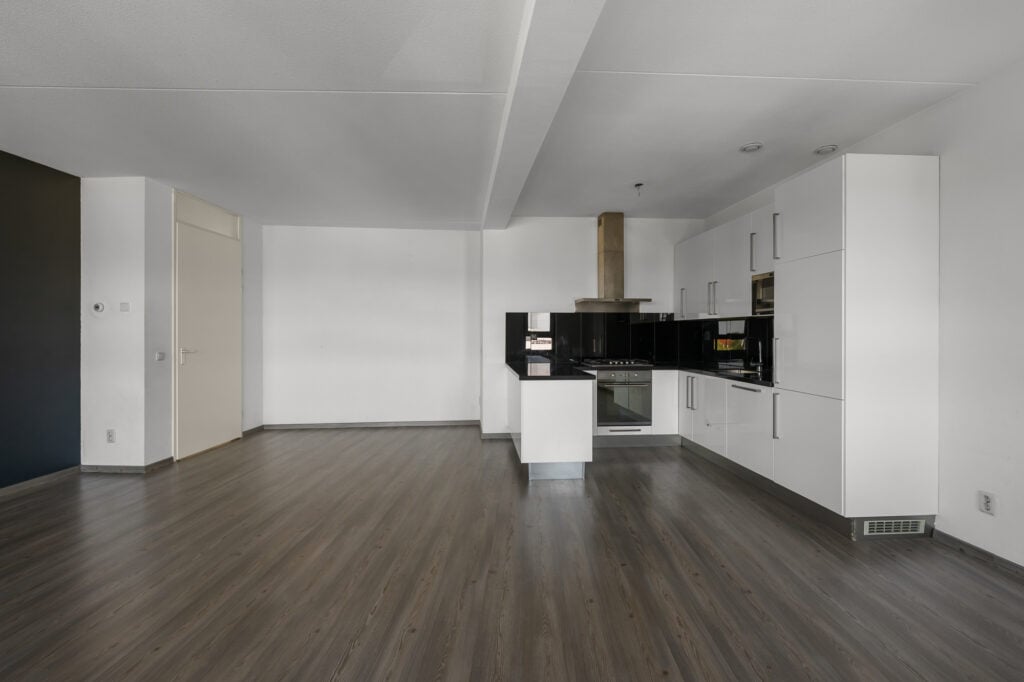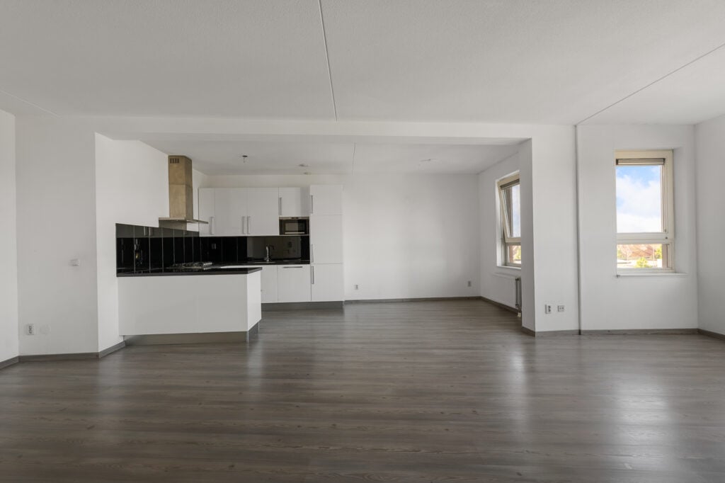 Via de brede hal openen we de deur naar de verrassend royale woonkamer. Deze leefruimte is echt een eyecatcher: zeer ruim van formaat en perfect in te richten met een grote hoekbank én een grote eettafel. De aangrenzende open keuken met gezellig baretje maakt het geheel compleet. Hier kook je met plezier terwijl familie of vrienden aanschuiven. Direct aan de woonkamer ligt het overdekte balkon, gelegen op het noordwesten, een fijne plek om na een drukke dag te ontspannen in de namiddag- en avondzon.