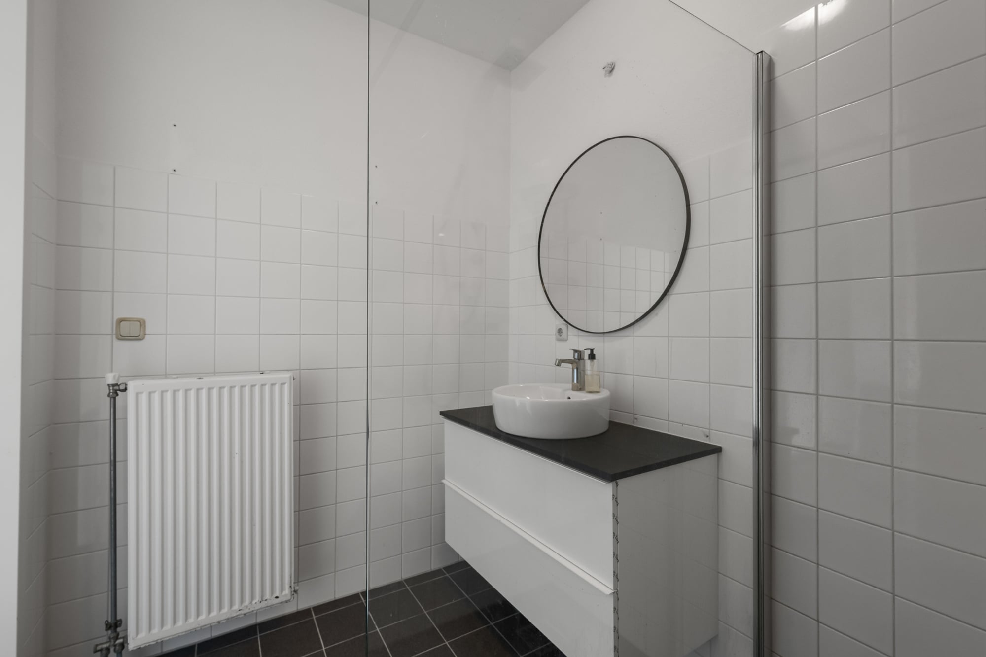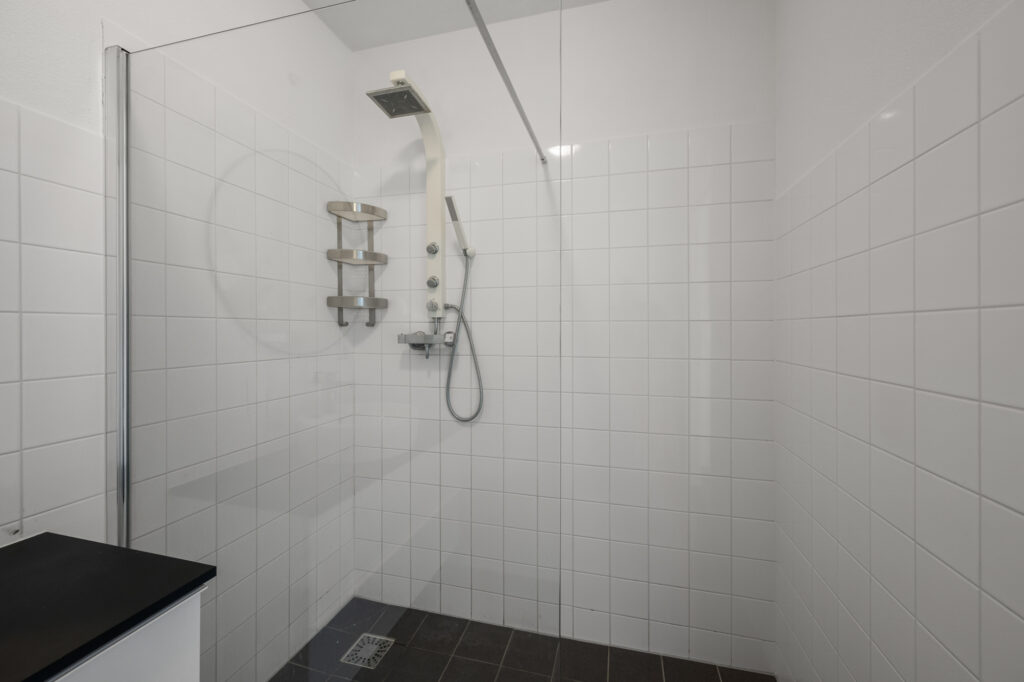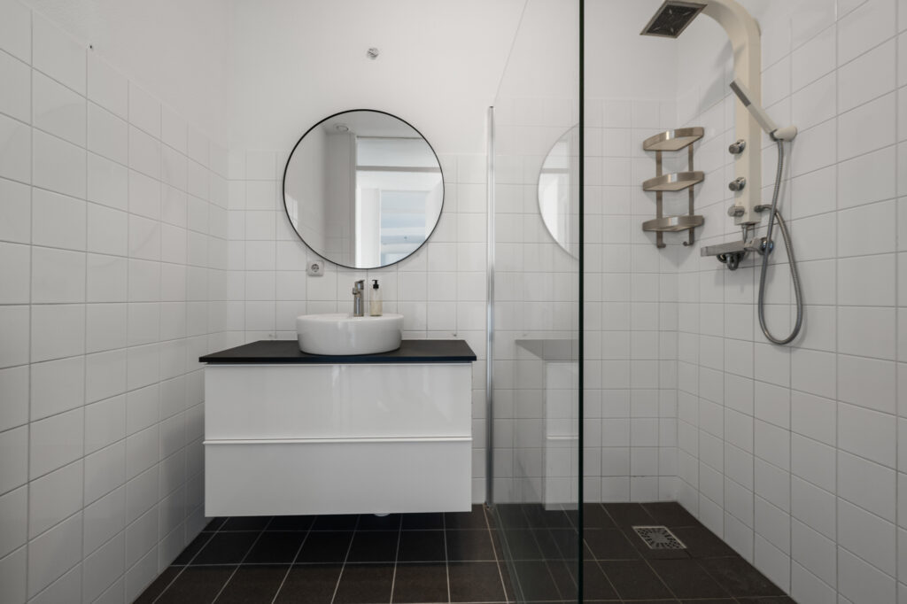 De badkamer heeft een rustige, verzorgde uitstraling en is ingericht met een ruime inloopdouche en een net wastafelmeubel. Het toilet is separaat, wat zorgt voor extra comfort.