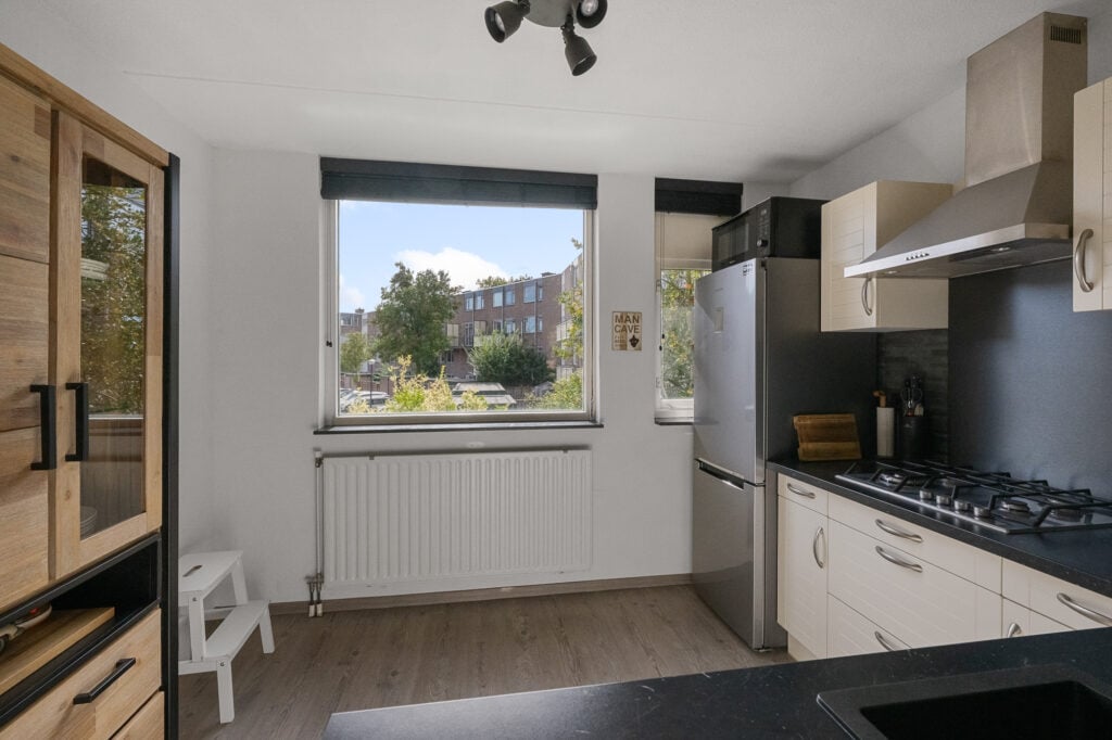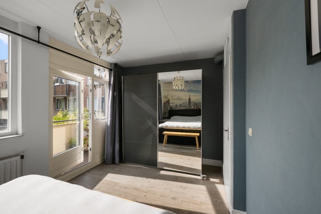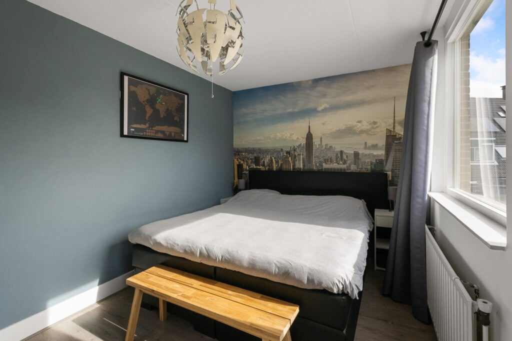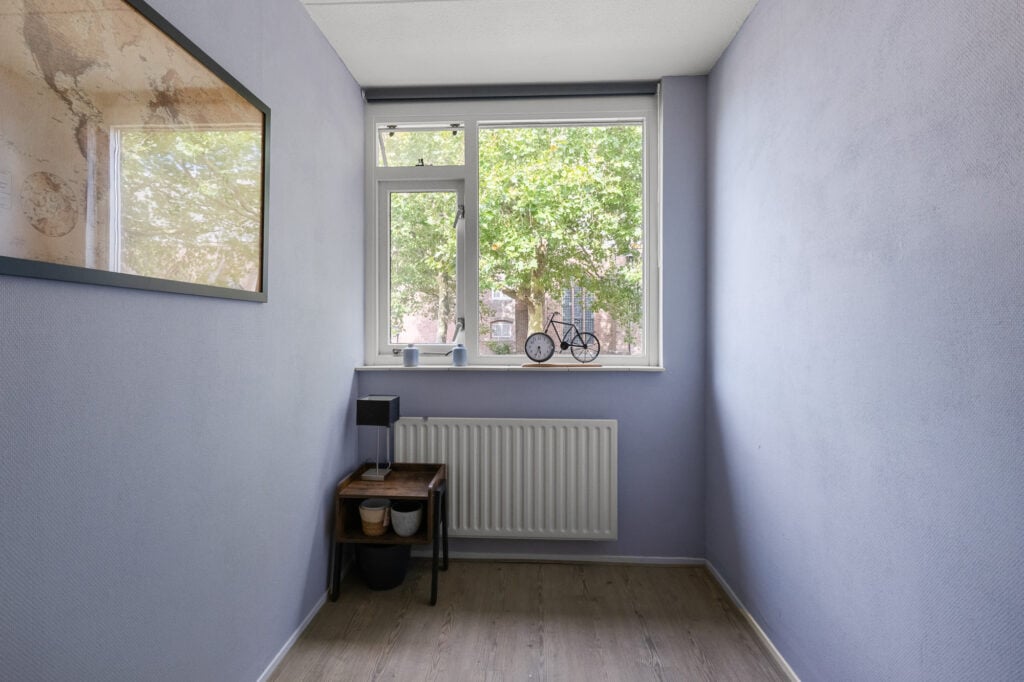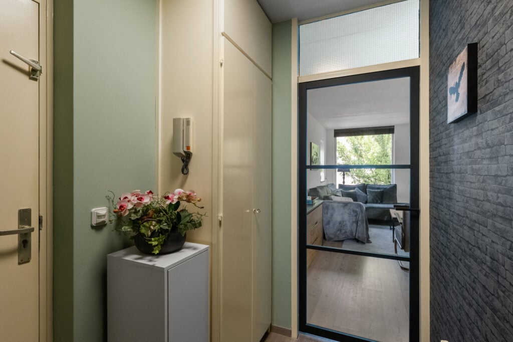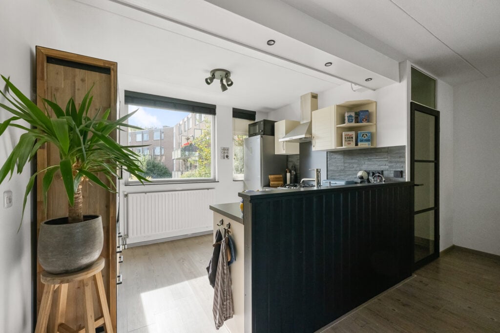 Het appartement is keurig verzorgd en dat merk je direct bij binnenkomst in de praktische hal. Vanuit hier bereik je de ruime woonkamer, waar het grote raam zorgt voor een fijne lichtinval en een prachtig uitzicht biedt op de Wijkertoren.