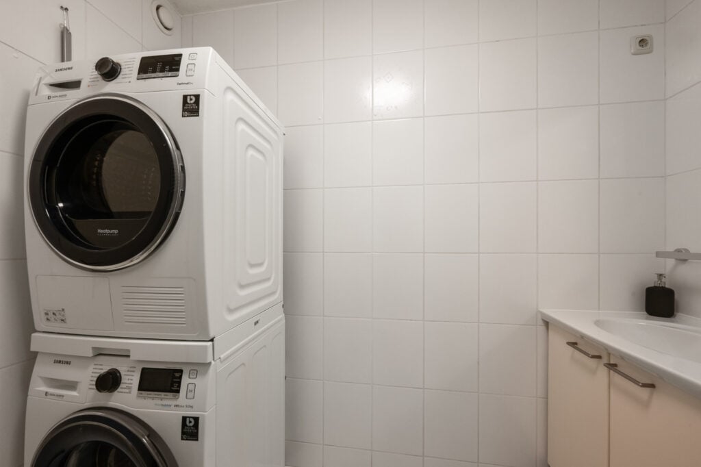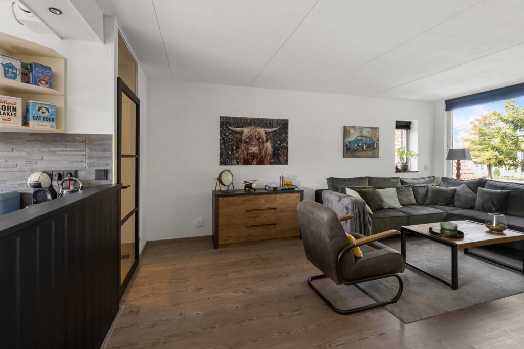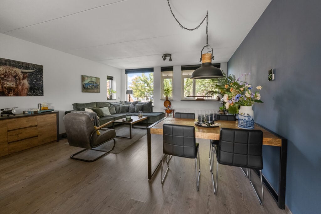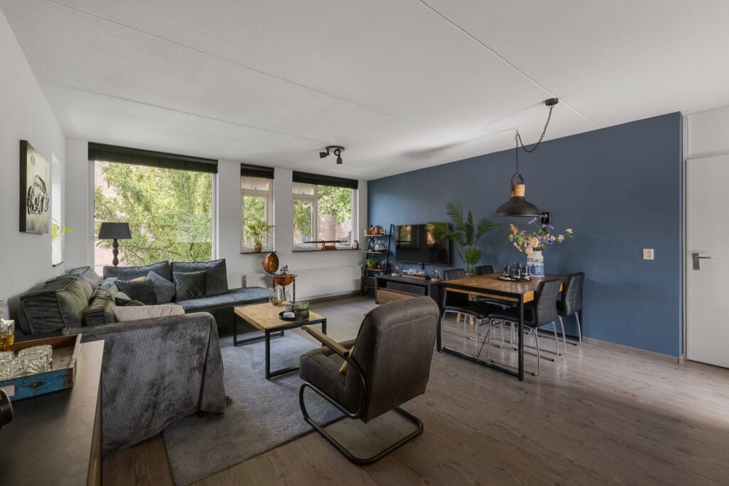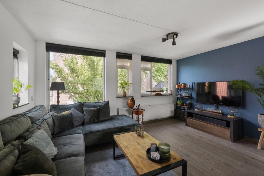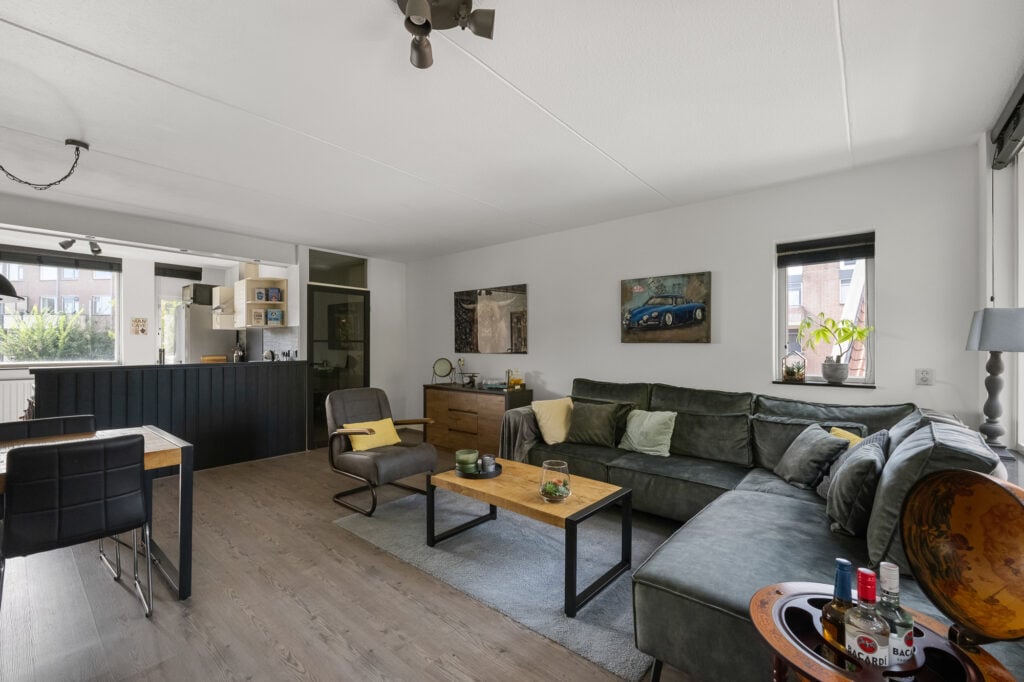 Het appartement is keurig verzorgd en dat merk je direct bij binnenkomst in de praktische hal. Vanuit hier bereik je de ruime woonkamer, waar het grote raam zorgt voor een fijne lichtinval en een prachtig uitzicht biedt op de Wijkertoren.