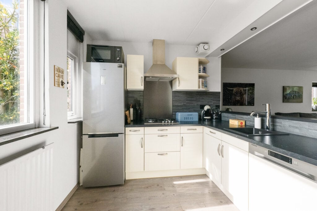 Aan de achterzijde bevindt zich de fraaie keuken, uitgevoerd in een moderne hoekopstelling met een gezellige bar waar koken en samenzijn hand in hand gaan.